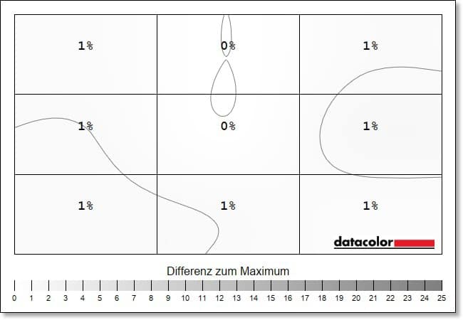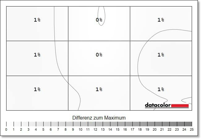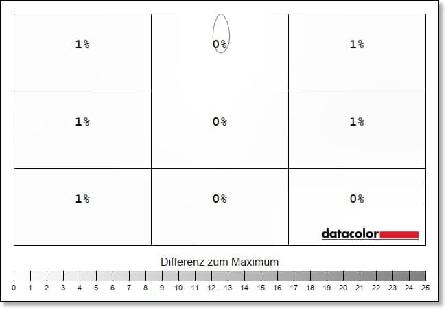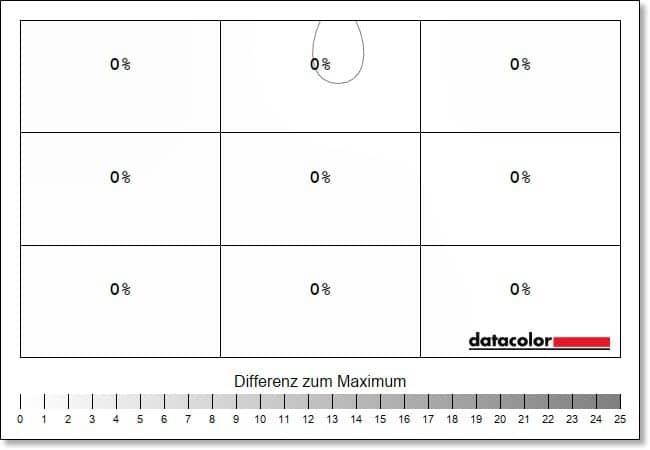 Einen neuen Bestwert erreicht der Monitor hingegen bei der Luminanz-Homigenität, die die Ausgeglichenheit der Ausleuchtung aufzeigt. Hier zeigen sich maximale Abweichungen von 1 Prozent bei 50 Prozent Helligkeit, bei einem Maximalwert ist die Helligkeit sogar über alle Quadrate gleichmäßig verteilt. Das hat bislang kein Monitor in unseren Tests geschafft.