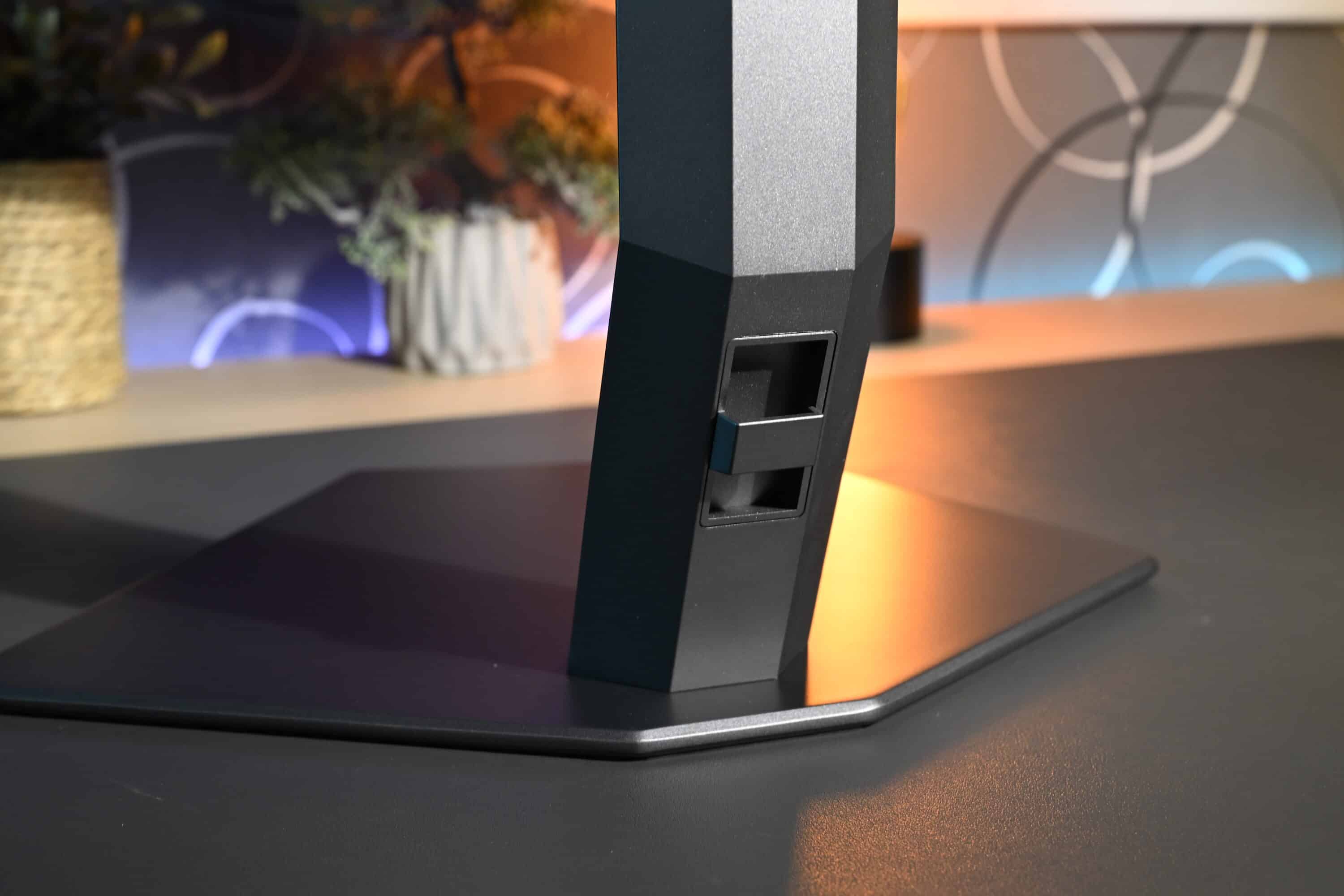 Der Standfuß fällt dabei groß genug aus, um dem rund 10,2 kg schweren Gaming-Monitor einen sicheren Halt zu garantieren – und, um die Tastatur und Maus bei Bedarf darauf abzulegen.