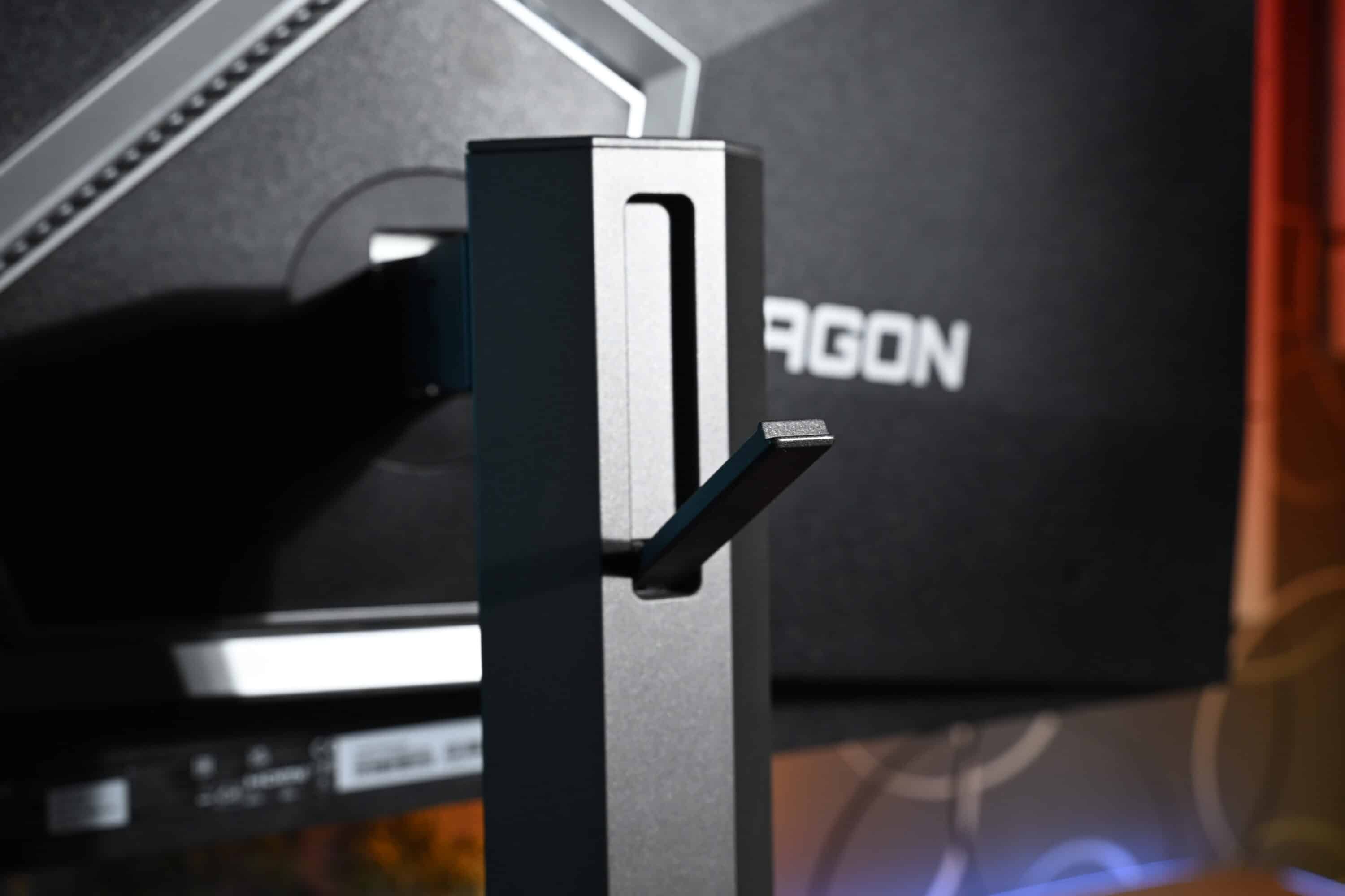 Der Monitorarm kommt zudem mit einer simplen, aber praktischen Kabelführung daher und wartet an der Oberseite mit einer ausklappbaren Headsethalterung auf. Die Verarbeitungsqualität des AG326UD ist dabei hervorragend und lässt keine Wünsche offen.