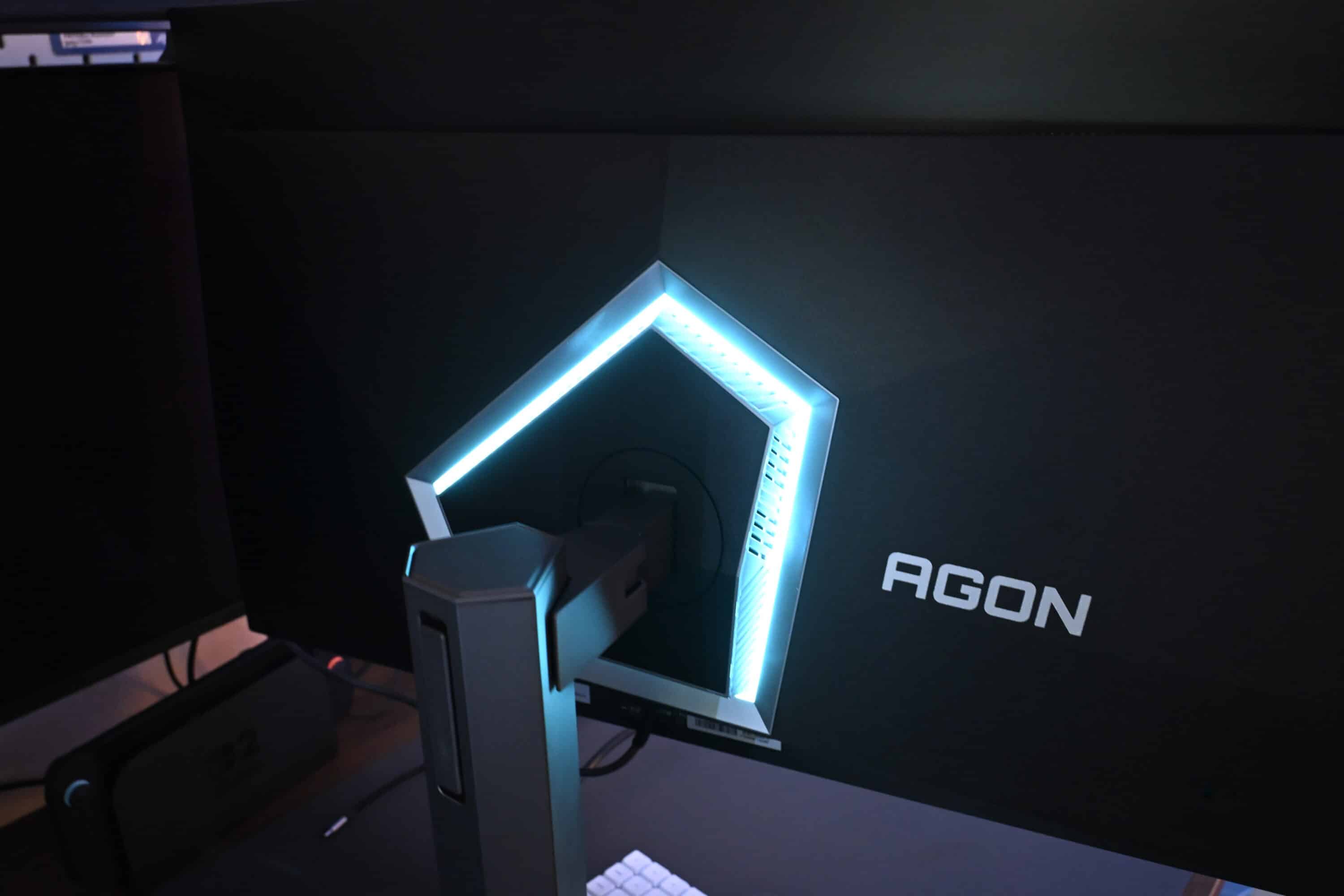 Die Nähe zum AG276QZD2 wird dabei bei der Designsprache offensichtlich. So setzt auch der AOC Agon Pro AG326UD auf ein schlichtes dunkelgraues Kunststoff-Gehäuse, das auf der Rückseite mit einem asymmetrisch zulaufenden Panel samt anpassbarer RGB-Beleuchtung und einem gleichermaßen asymmetrischen fünfeckigen Standfuß daherkommt.