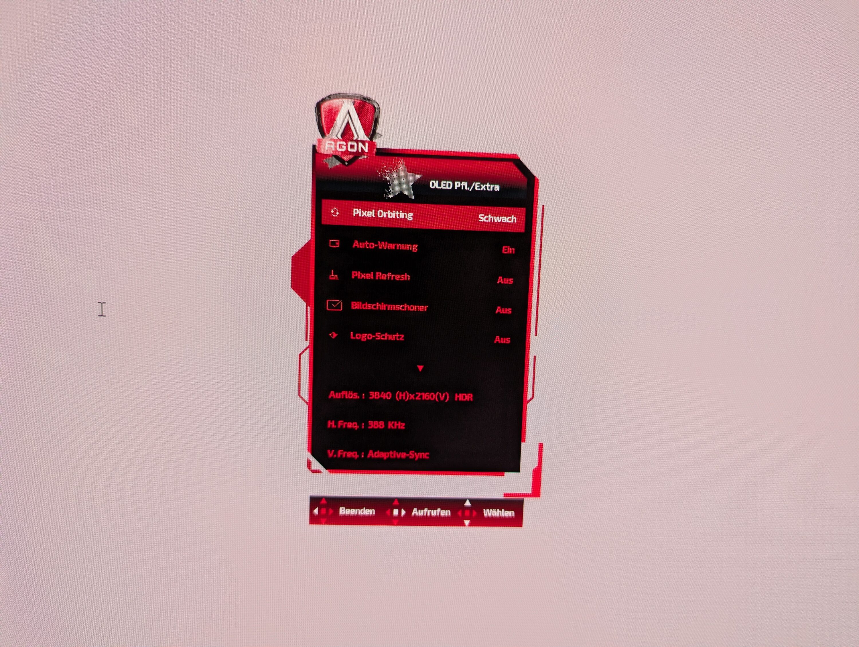 Für die Bildschirmpflege bzw. OLED-Wartung, die bei OLED-Displays besonders wichtig ist, bietet der AOC Agon Pro AG326UD zahlreiche Optionen an. Mit Bildschirmschoner, Pixel Orbiting, Pixel Refresh und vielem mehr ist der Monitor bestens gewappnet. Alle Optionen lassen sich zudem anpassen und auf Wunsch auch ausschalten.