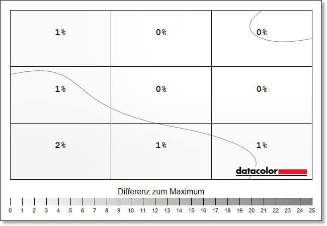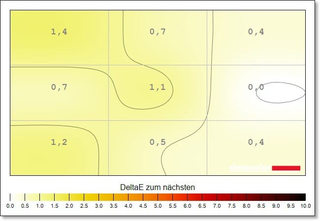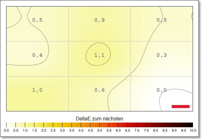 Die Homogenität des Bildes ist ebenfalls exzellent. Weder bei den Farben noch bei der Helligkeit zeigen sich große Abweichungen.