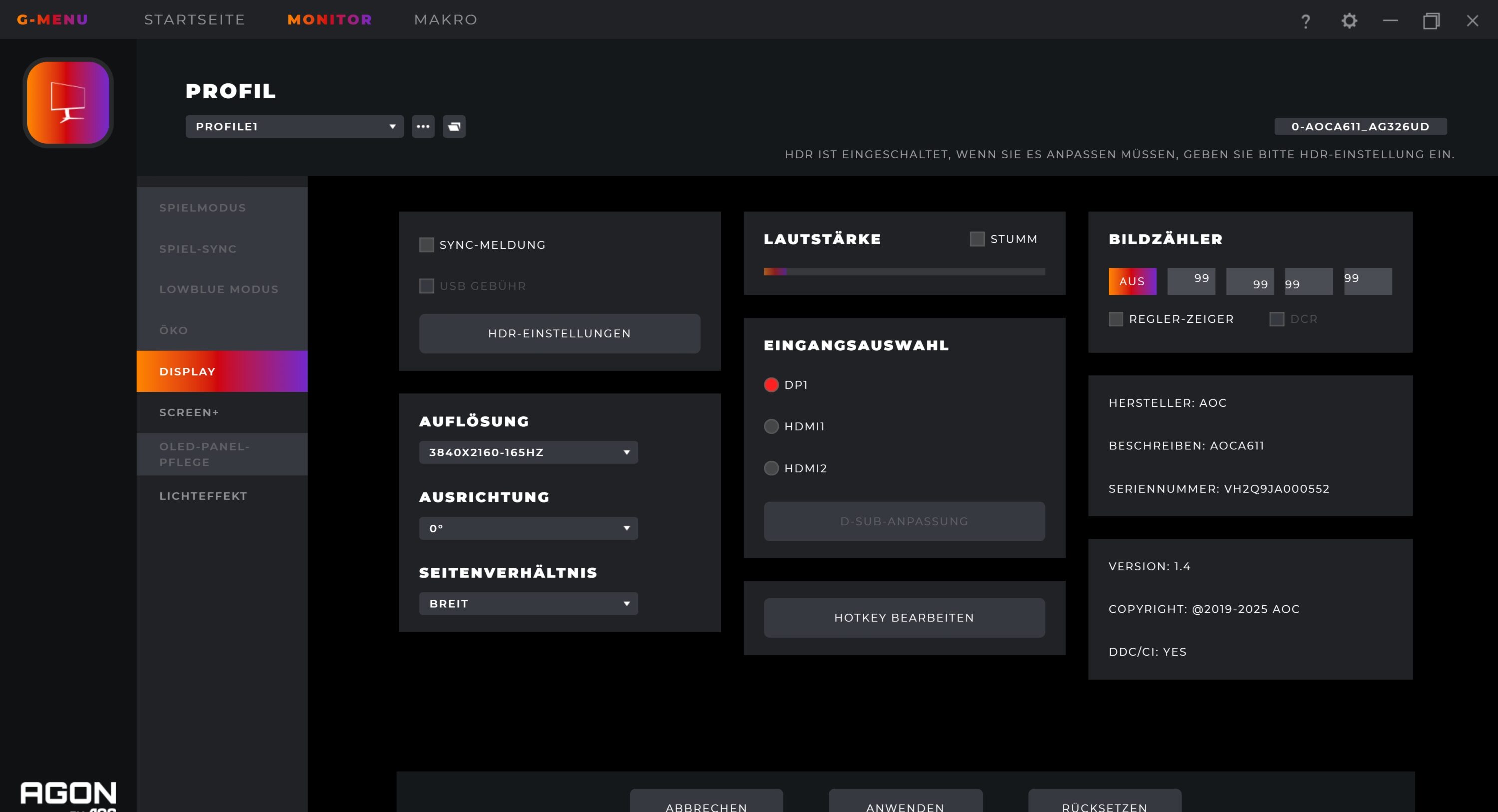 Der AG326UD setzt darüber hinaus auf ein flaches, glänzendes Panel, das dank Antireflex-Beschichtung sehr gut gegen Reflexionen geschützt ist. OLED-typisch liegt die Reaktionszeit bei 0,03 ms, das Kontrastverhältnis bei satten 1.500.000:1. Die maximale Helligkeit liegt bei 250 Nits im SDR-Modus und 450 Nits im HDR-Betrieb, wobei bei einzelnen Pixeln bis zu 1.000 Nits erreicht werden.
