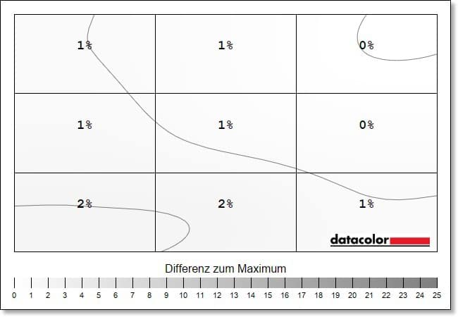 Die Unterschiede zwischen maximaler Helligkeit und 50 Prozent Helligkeit liegen allesamt unter einem Wert von 2, was nahezu perfekt ist. Es macht also keinen merklichen Unterschied, in welcher Helligkeit du den AOC Agon Pro AG326UD betreibst.