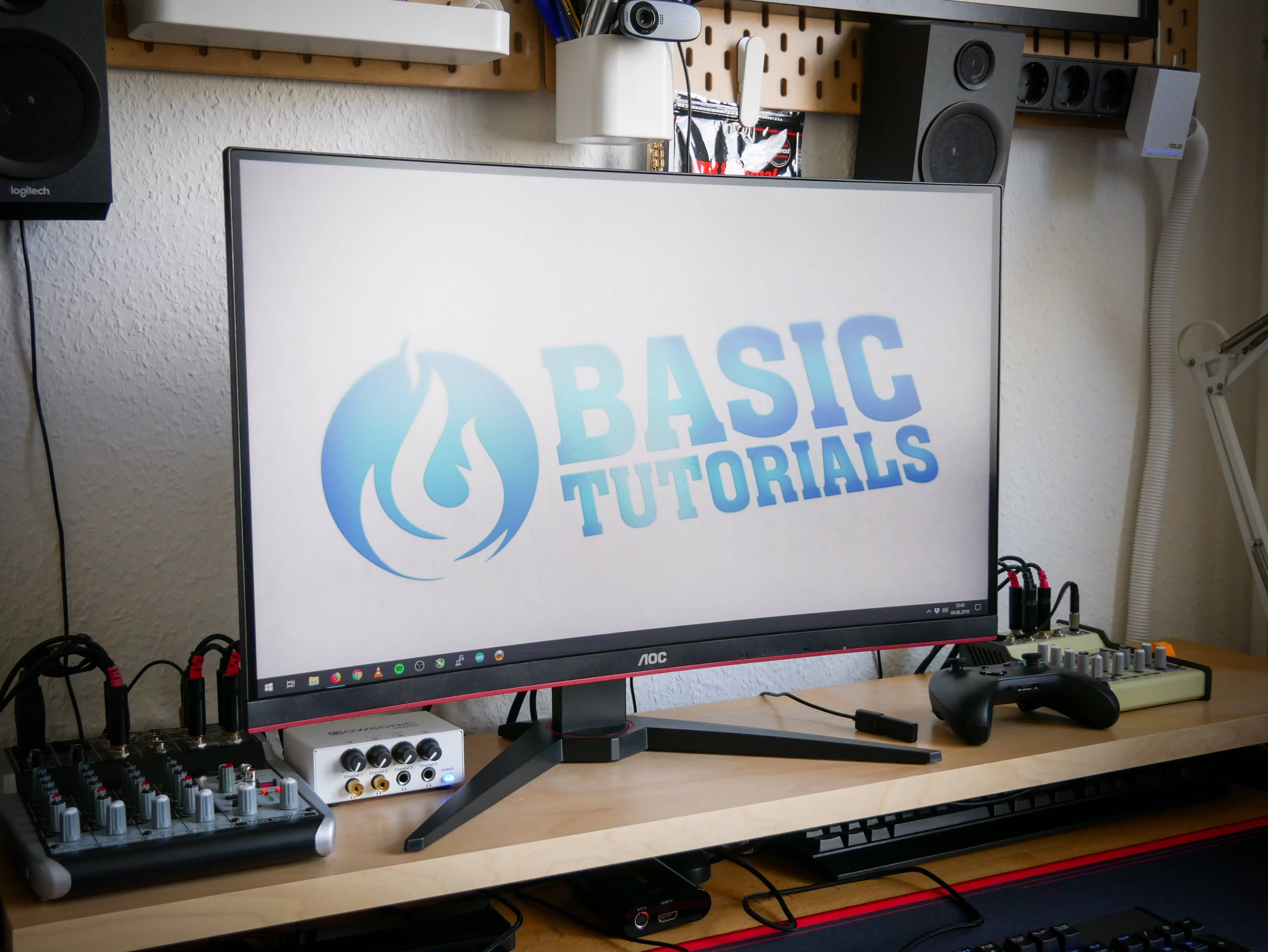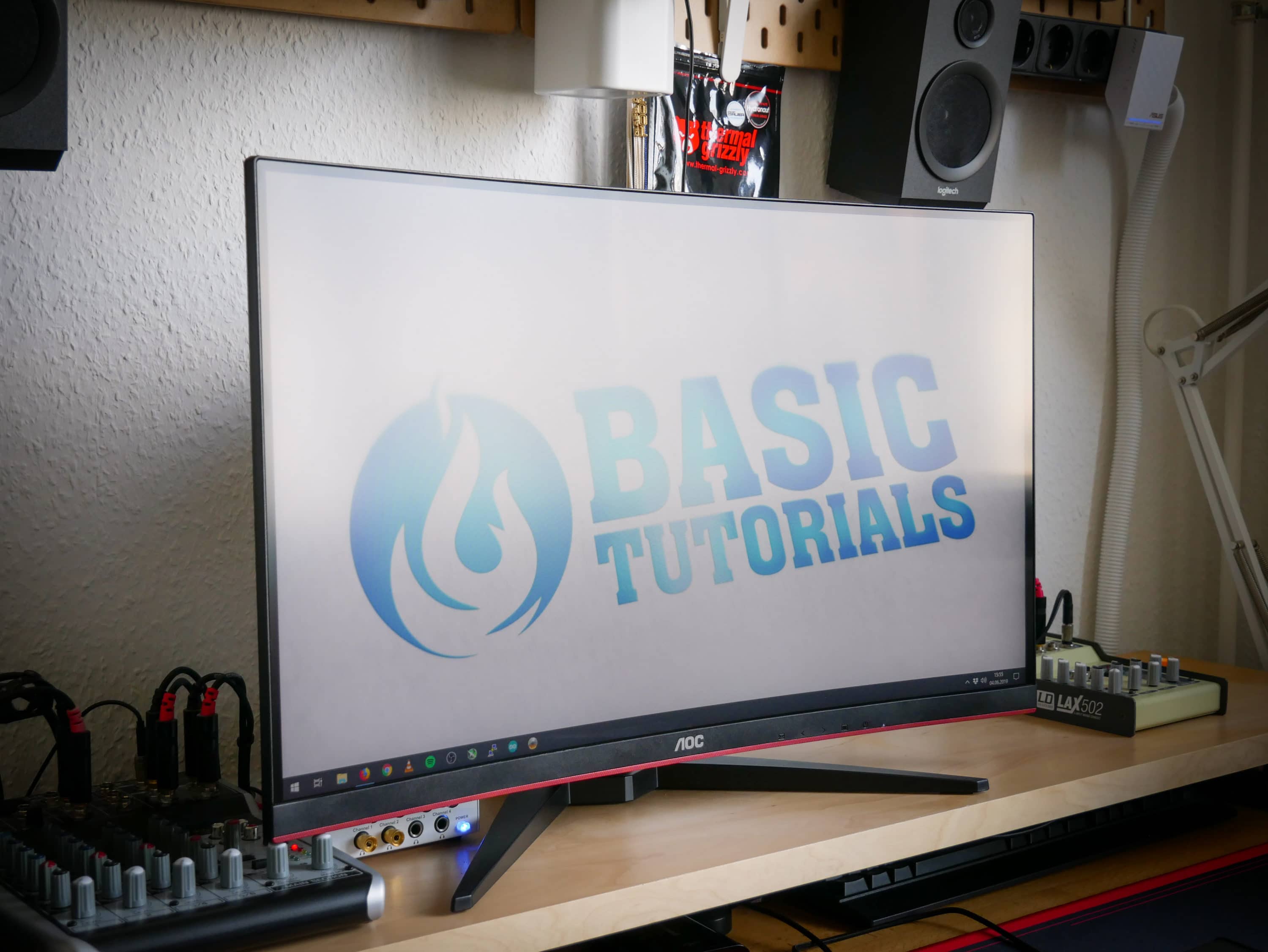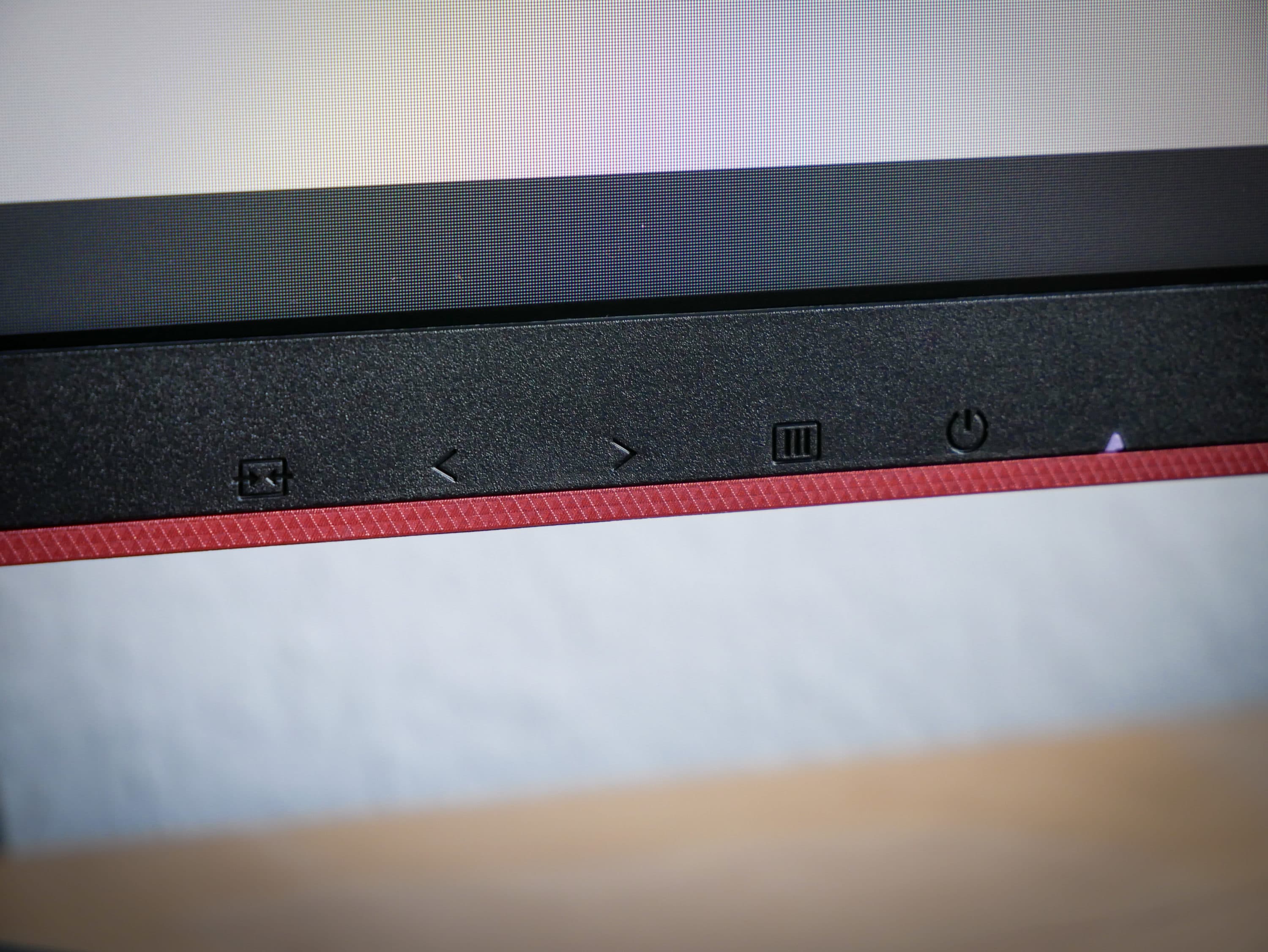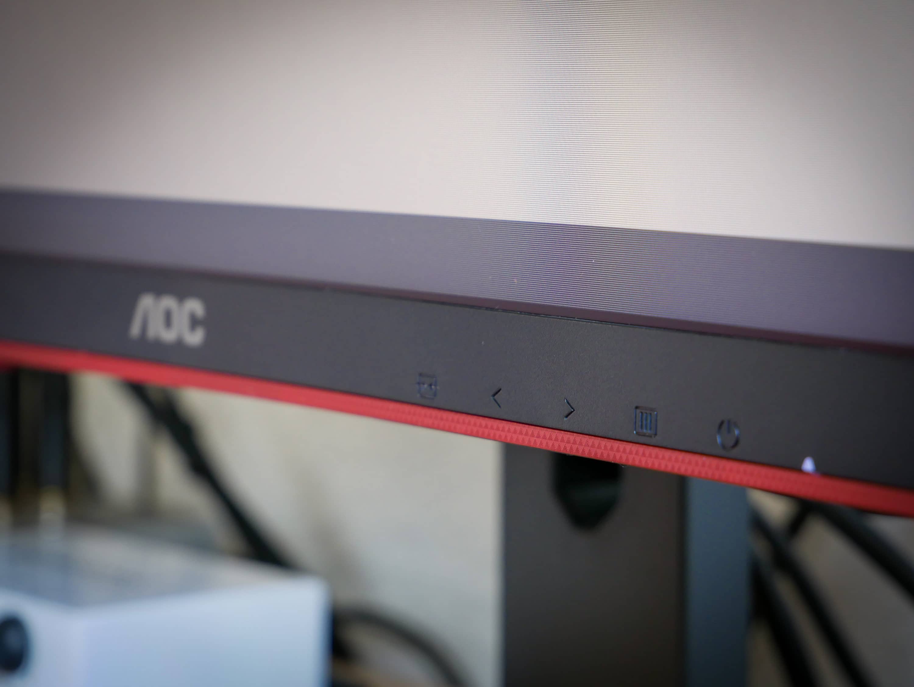 Am unteren Bildschirmrand thront das AOC-Logo. Rechts daneben befinden sich die Symbole für die Bedienelemente, welche sich darunter unter dem Bildschirm befinden. Der Standfuß nimmt dank seines gespreizten Design nicht viel Platz auf dem Schreibtisch ein und bietet gleichzeitig einen sicheren Stand und Halt für den Monitor. Für ein ordentliches Kabelmanagement sorgt eine dem Look passende Öffnung im Fuß. So fallen die angeschlossenen Kabel kaum auf.