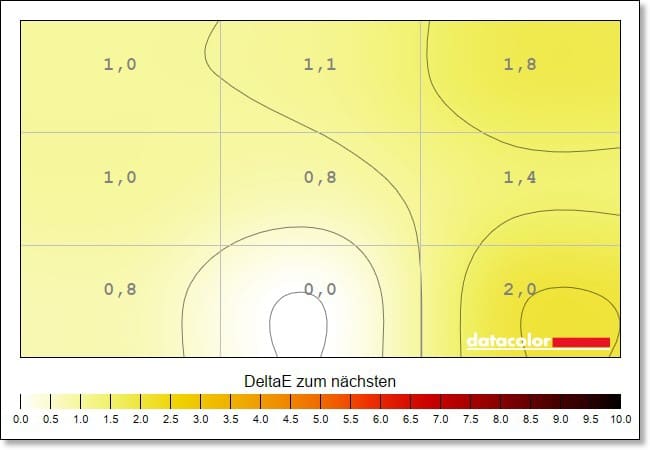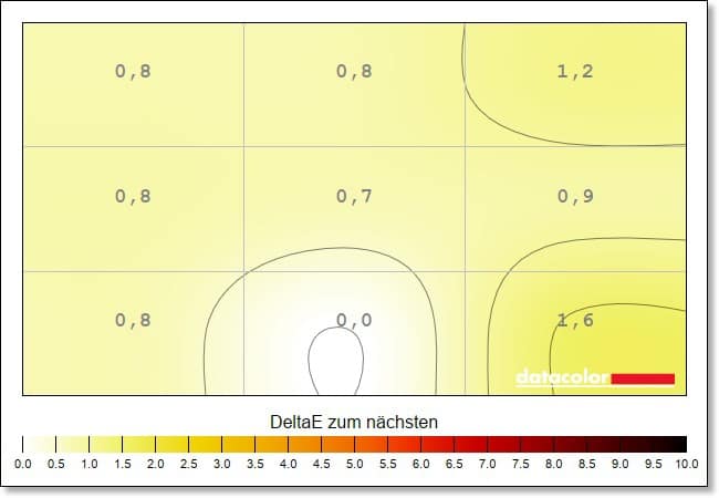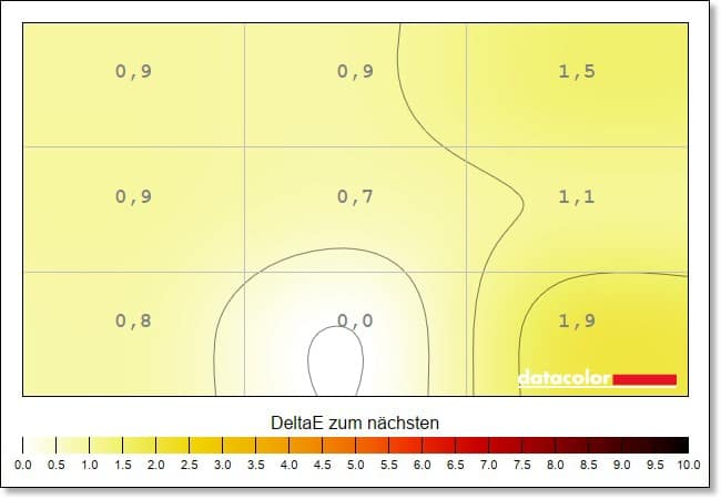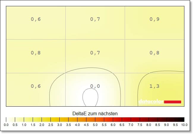 Auch bei der Homgenität des Bildes, also der Gleichmäßigkeit der Farbdarstellung und der Gleichmäßigkeit der Helligkeit zeigt sich der AOC Gaming 24G4X sehr gut eingestellt. Bei der Farb-Homogenität zeigen sich Abweichungen von maximal Delta E 2,0 – das sind so niedrige Werte, wie sie auch kaum ein deutlich teurer Monitor realisiert.
