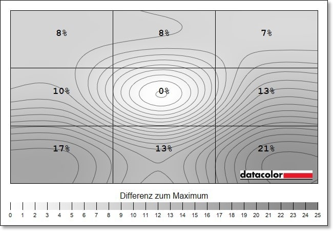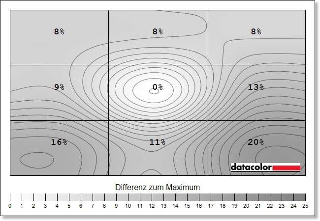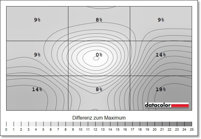 Bei der Luminanz-Homigenität hingegen fallen die Abweichungen schon wesentlich stärker aus. Hier zeigt sich vor allem das Rechteckt in der unteren rechten Ecke etwas problembelastet. Die Abweichungen liegen hier bei bis zu 21 Prozent bei voller Helligkeit. Beduetet: Statt 289,6 Nits kommen hier lediglich 229,1 Nits an.