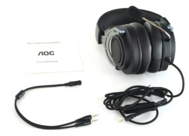 Die Ohrmuscheln werden neigbar durch Metallarme mit dem Kopfband verbunden, das ebenso mit Kunstleder und Schaumstoff gepolstert ist. Soweit ist also alles Standard, die einzigen Abweichungen erlaubt sich AOC beim Logo und beim Anschluss des Mikrofons.