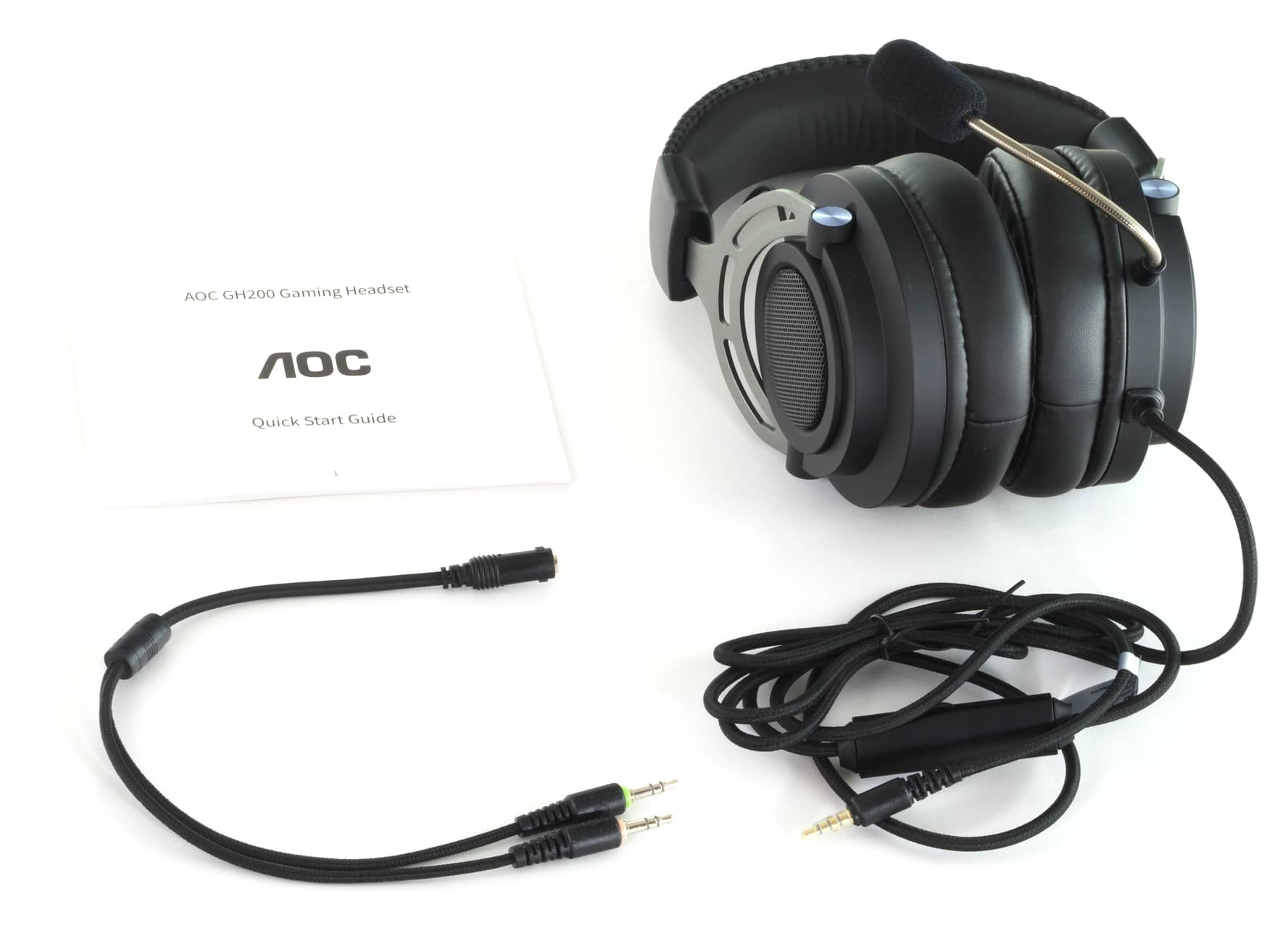 Als Lieferumfang spendiert AOC dem GH200 die übliche Standardausstattung. Das 1,8 Meter lange, vierpolige Anschlusskabel ist fest am Headset verbaut, und zusätzlich gibt es einen Y-Splitter für den Betrieb an zwei getrennten, dreipoligen Anschlüssen.