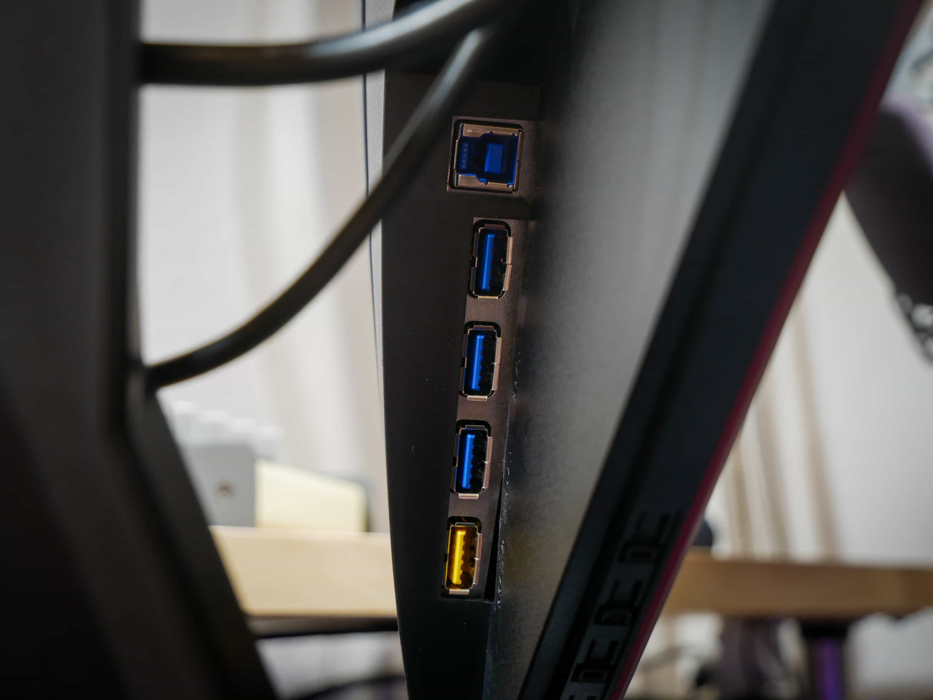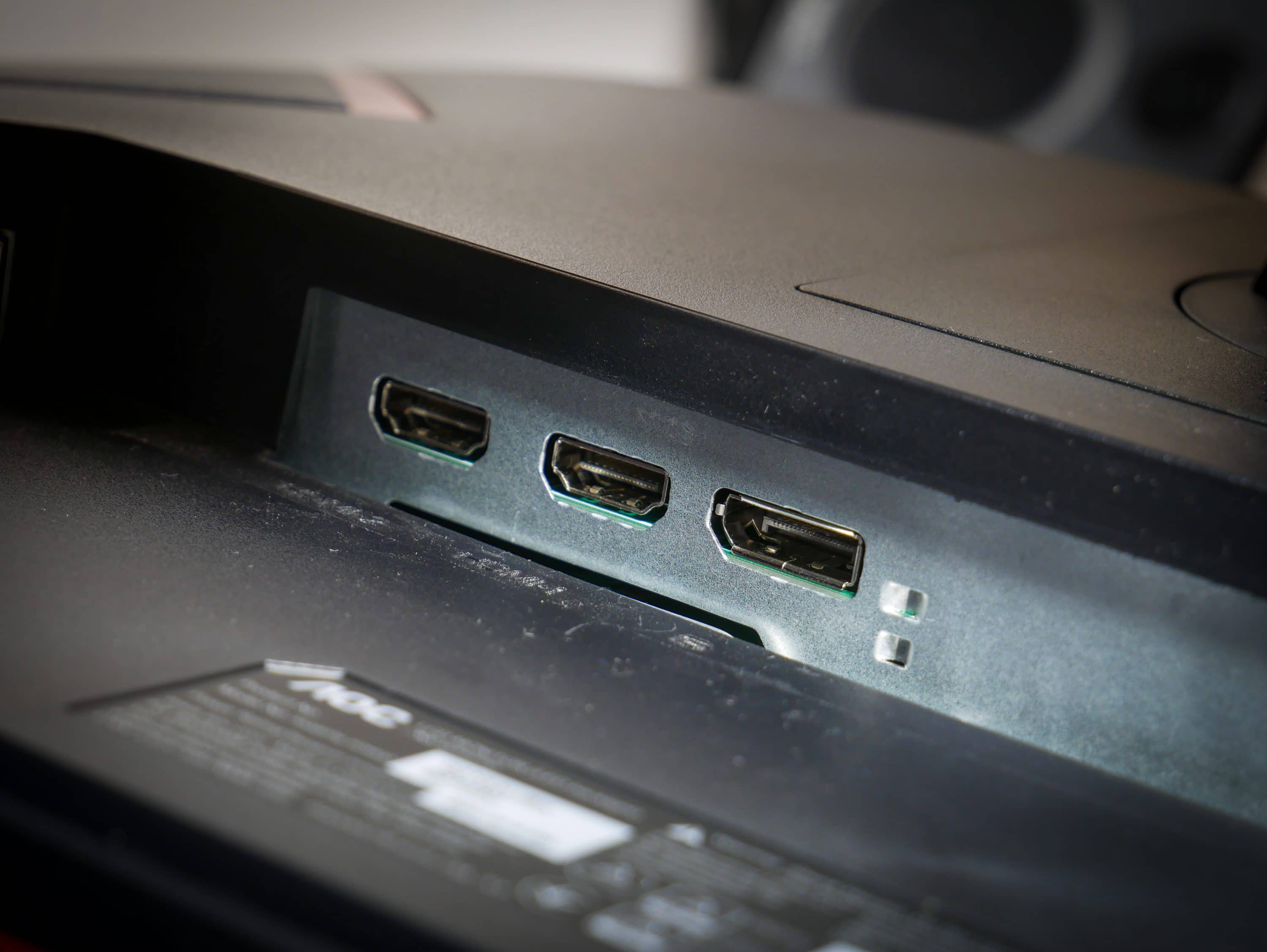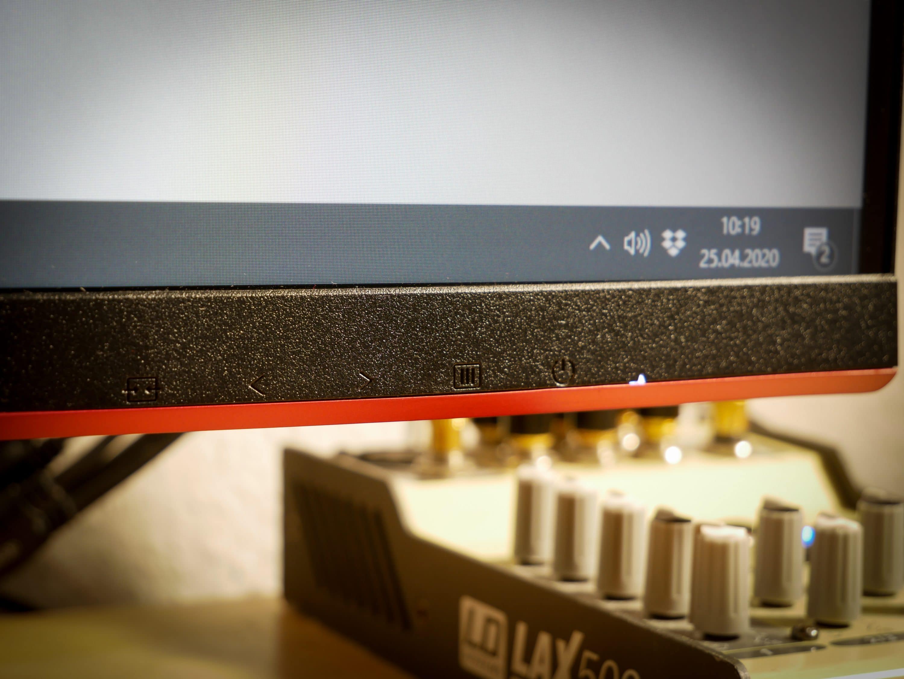 Über die Knöpfe, an der Unterseite des Monitors, lässt sich das Menü bedienen. Deren Position ist nicht immer gut voneinander zu unterscheiden. Manchmal drückt man auf etwas, was sich wie der Schalter anfühlt, landet aber nur leicht daneben. Das kann, besonders wenn es mal schnell gehen soll, etwas frustrierend sein. Auch ist das Menü etwas unübersichtlich. Wenn man sich aber einmal zurechtgefunden hat, kommt man gut damit zurecht. Alle Anschlüsse sind, wie bei den meisten Monitoren, auf der Rückseite von unten zu erreichen.