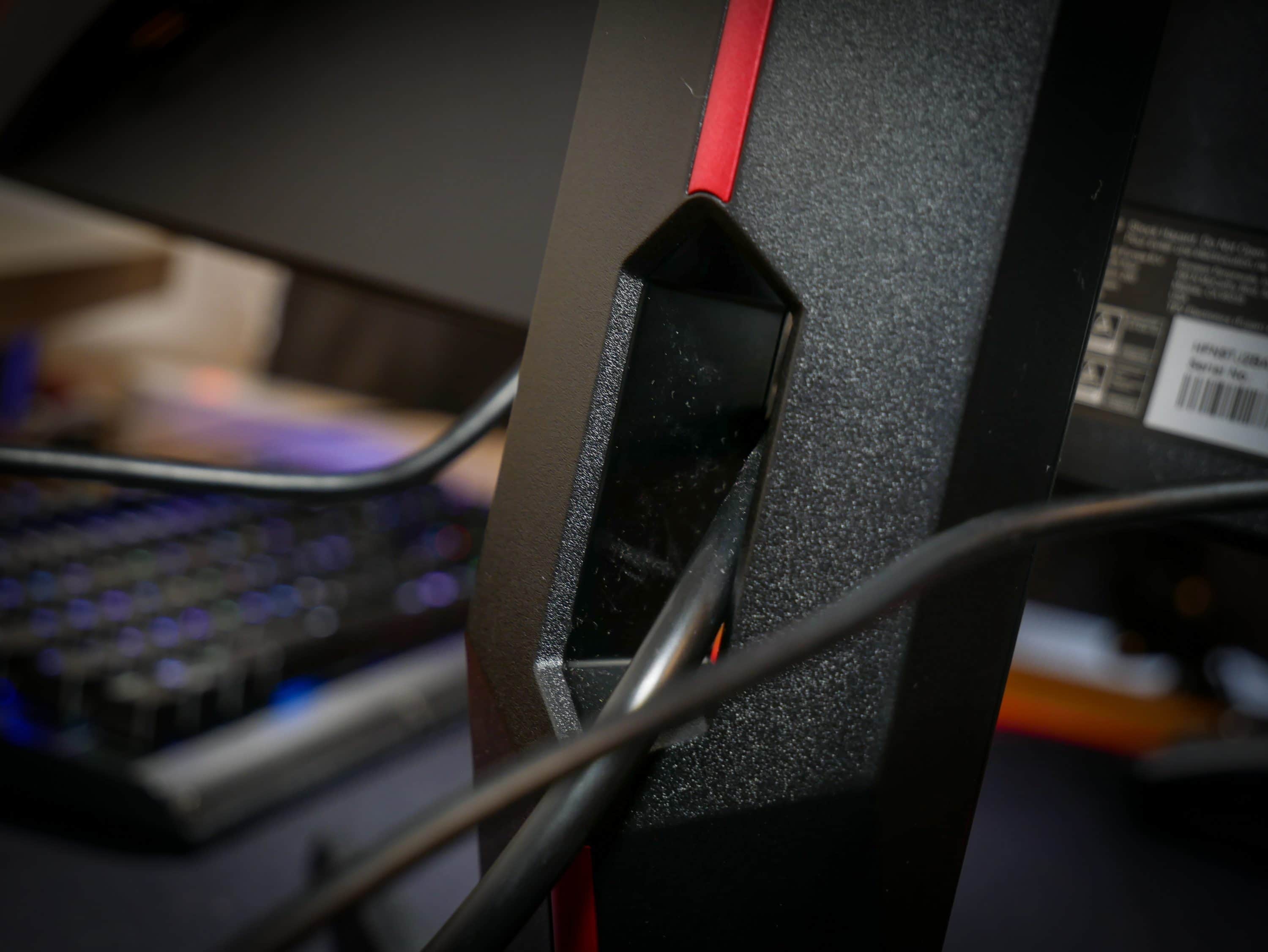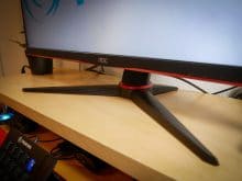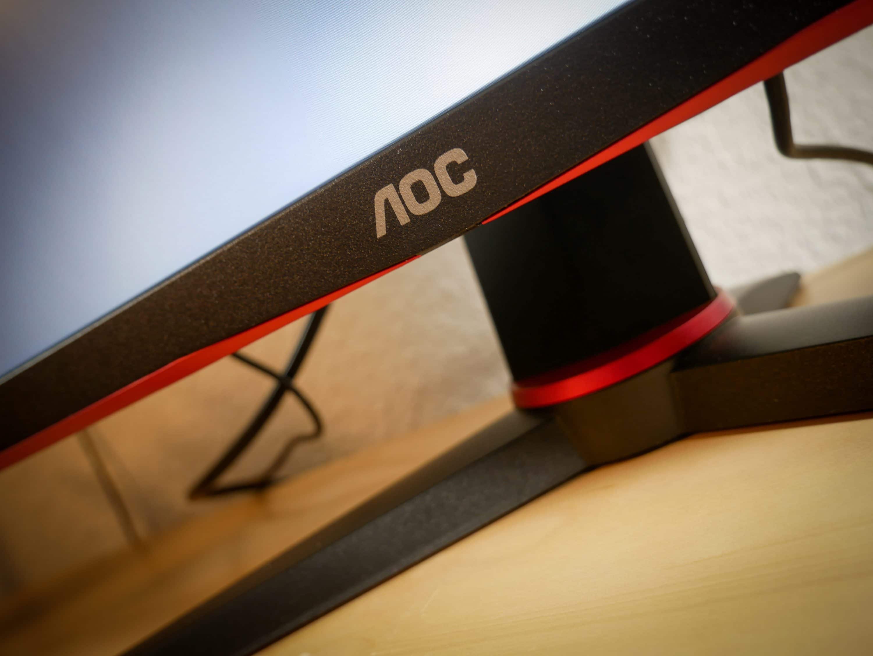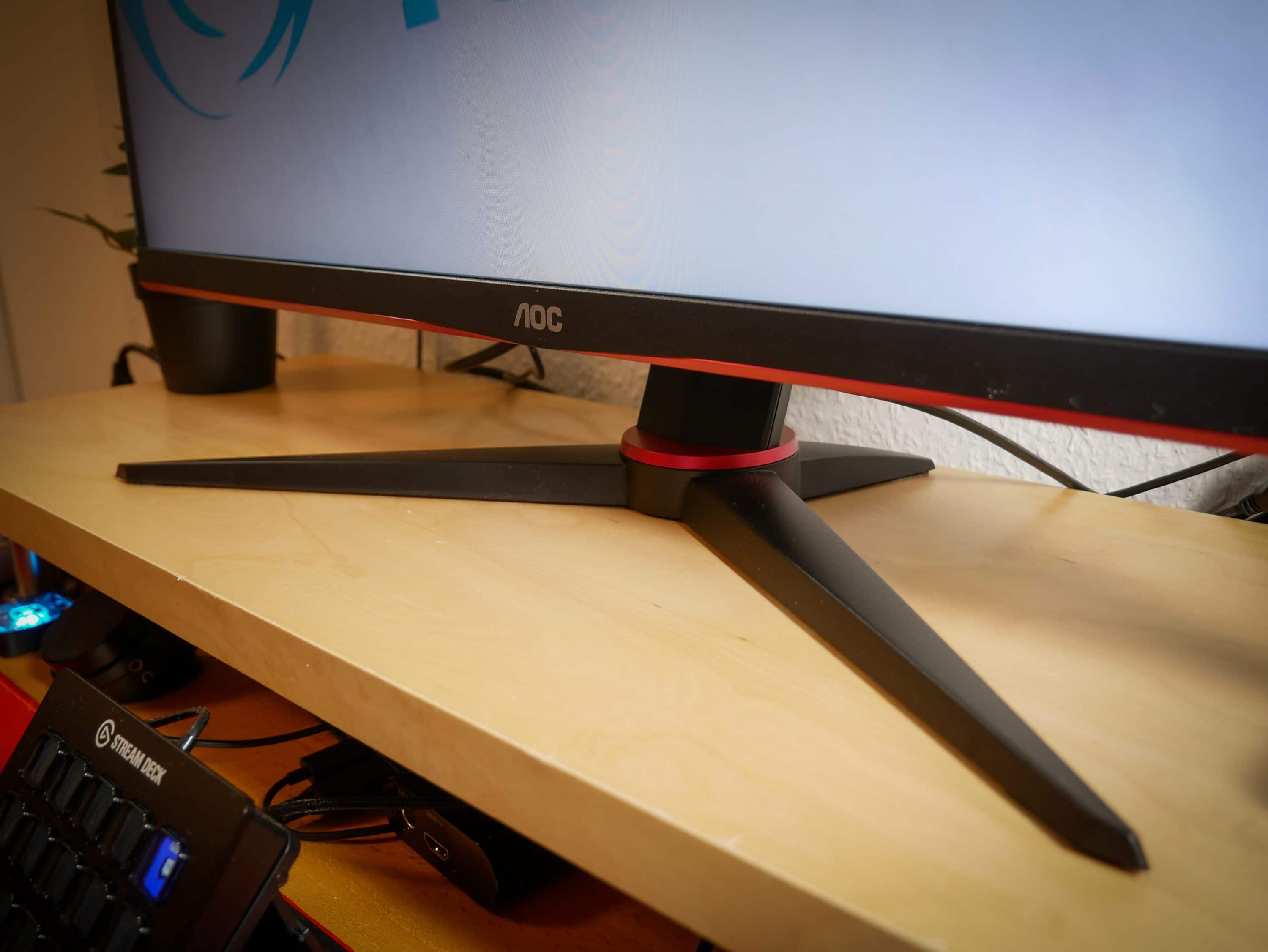 Rechts neben dem AOC-Logo am unteren Bildschirmrand, sind die kleinen Symbole für die Bedienelemente zu sehen. Die Knöpfe selbst befinden sich direkt darunter, an der Unterseite des Monitors. Die Symbole könnten etwas sichtbarer gestaltet sein, da sie wie eingestanzt sind, und oft nicht richtig zu sehen sind. Der Fuß besteht, wie bei anderen Monitoren der AOC-Gaming-Reihe, aus zwei gespreizten Streben, die so für einen sichern Stand sorgen. Dabei nimmt der Standfuß nicht zu viel Platz auf dem Schreibtisch weg, so dass auch z. B. ein Controller darunter Platz hat. Eine Öffnung im Fuß beseitigt chaotisches Kabelgewirr und angeschlossene Kabel fallen so kaum auf.