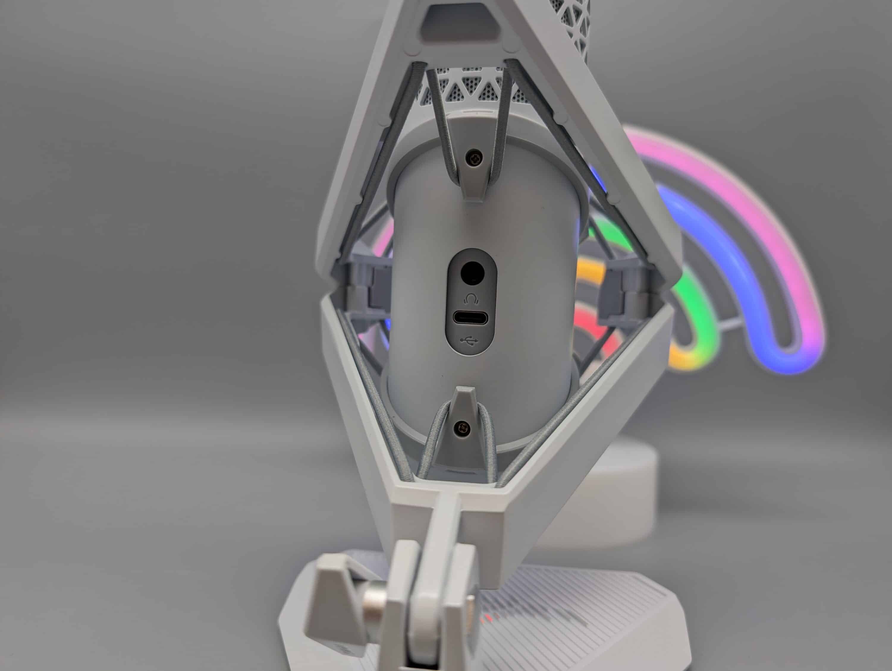 Die Oberseite kommt mit einem Touch-Sensor daher, mit dem sich das ROG Carnyx schnell und einfach stummschalten lässt. Abgerundet wird das Design durch einen 3,5-mm-Klinkenanschluss und einen USB-C-Port an der Rückseite.