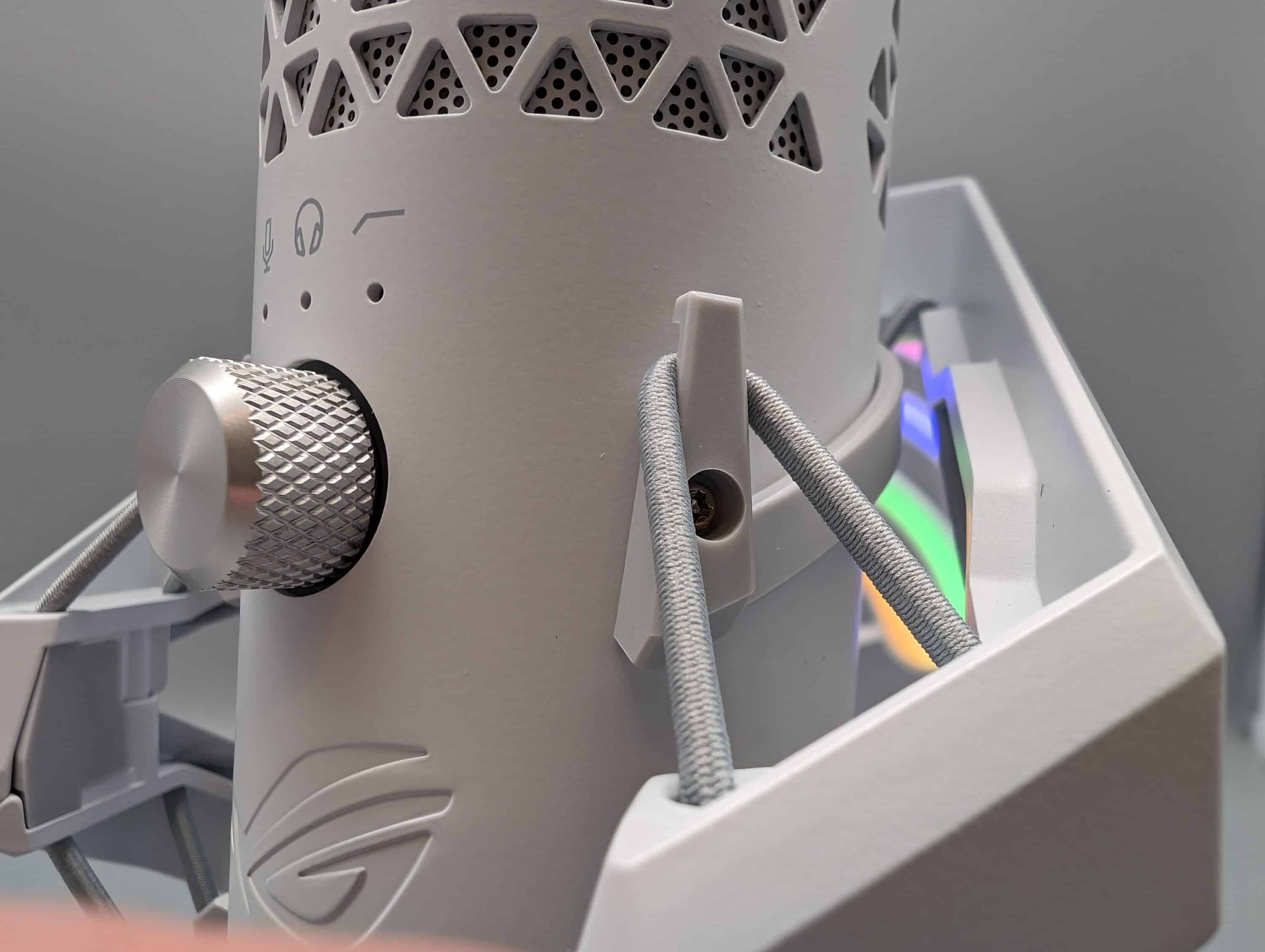 Das Carnyx will auffallen. Bei genauerer Betrachtung stechen vor allem die dreieckigen Öffnungen der Mikrofonkapsel, sowie das glänzend abgesetzte ASUS ROG-Logo auf dem Standfuß hervor. Das Mikrofon selbst wird von insgesamt fünf elastischen Bändern in der Spinne gehalten, kann auf Wunsch also einfach herausgenommen werden.