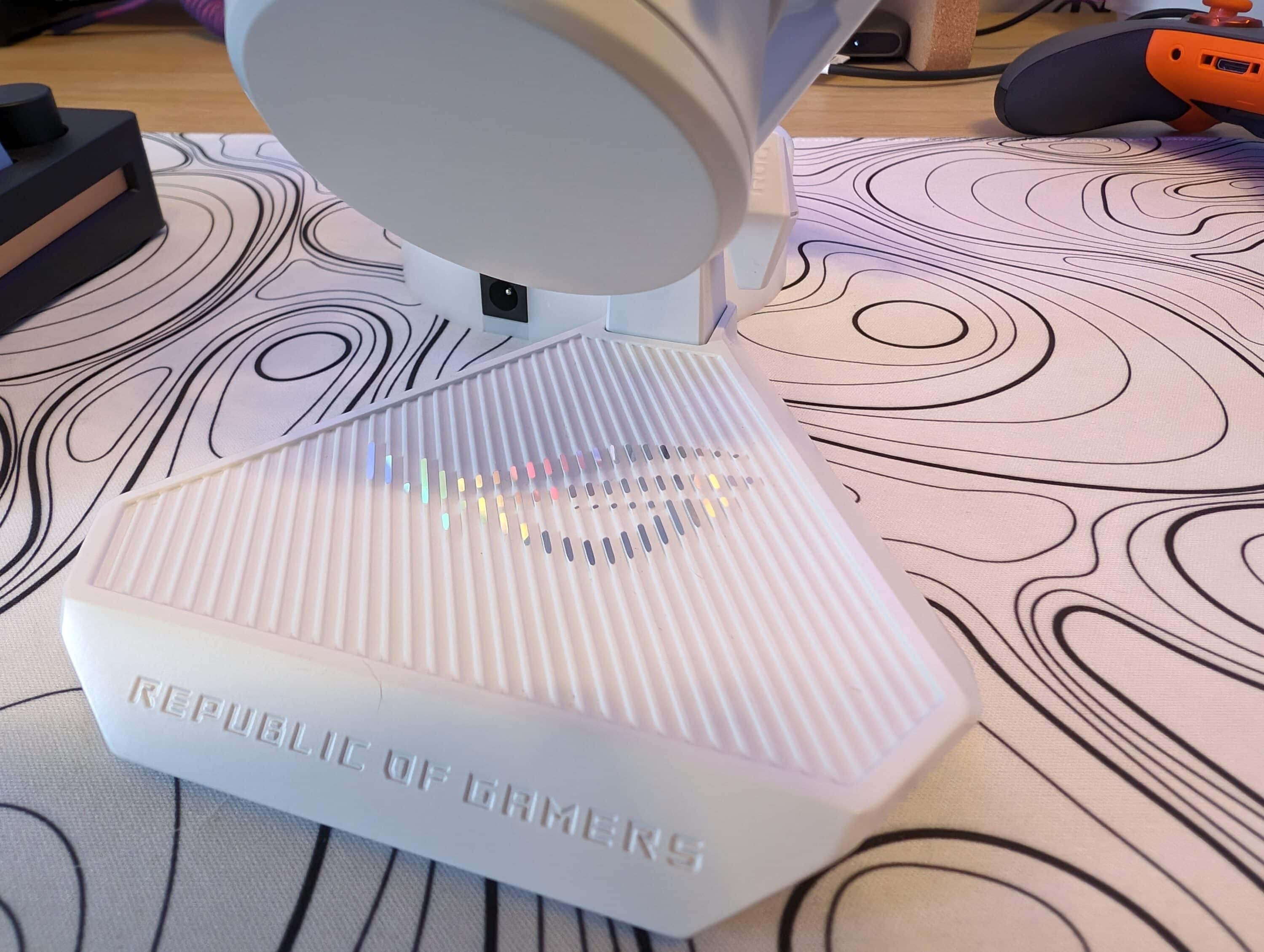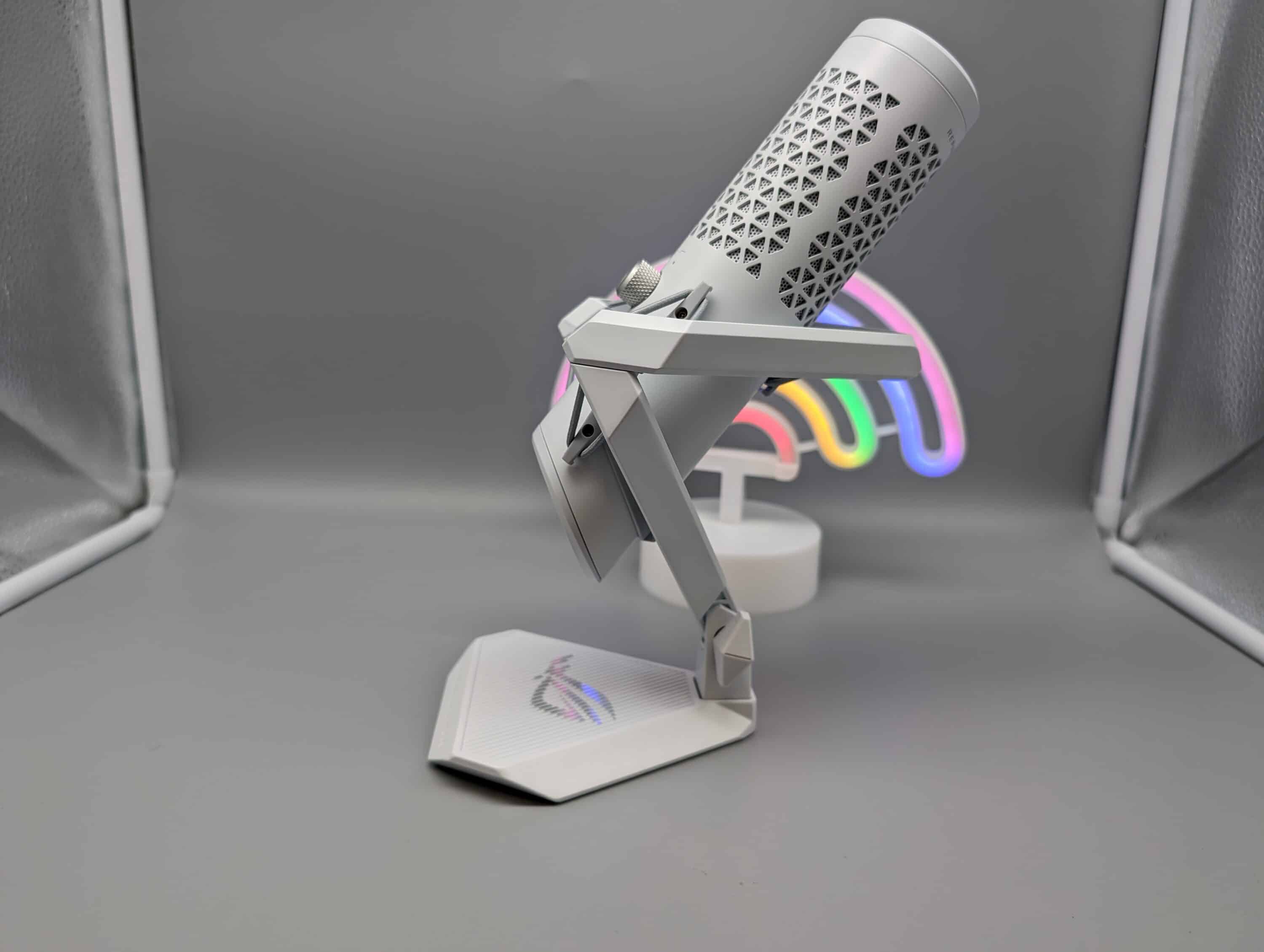 Auch die ROG-Variante kommt mit einem futuristisch anmutenden Design daher und wirkt sehr edel. Dabei unterteilt sich der Aufbau in drei Komponenten: Mikrofon, Spinne/Halterung und Standfuß. Insgesamt ist der Verbund rund 28 cm hoch und knapp 13 cm tief und gehört damit zu den größeren Mikrofonen. Das Gewicht von 653 Gramm zeugt zudem von einer überzeugenden Verarbeitung.