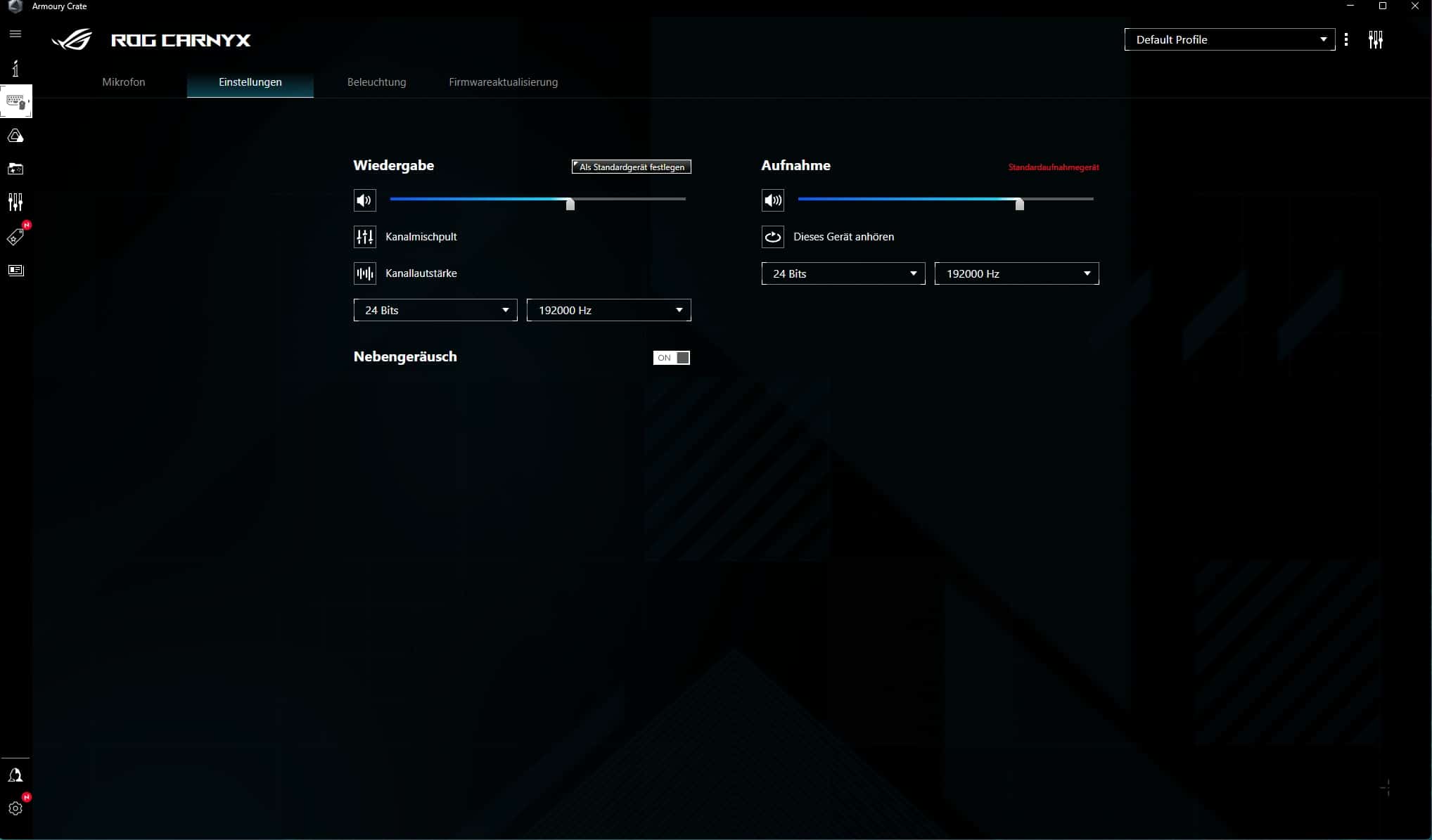 Im Bereich „Einstellungen“ ist es zudem möglich, die Auflösung der Aufnahme anzupassen, sowie ein rückseitig angeschlossenes Wiedergabegerät zu individualisieren. Auch Firmware-Updates sind über Armoury Crate möglich, aktuell gibt es aber noch keine.
