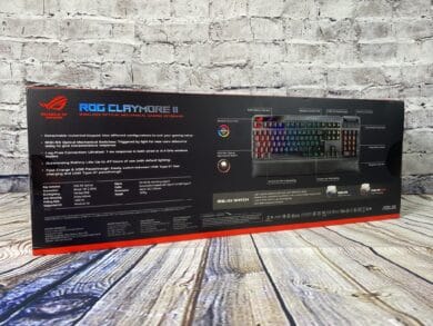 Geliefert wird die Claymore II in einer typisch aussehenden ASUS-ROG-Verpackung. Aus dem schwarzroten Design hebt sich die Tastatur mit Aura-RGB-Farben im Vordergrund ab. Sowohl auf der Vorder- als auch Rückseite der Verpackung befinden sich die wichtigsten Informationen rund um die Tastatur wieder.