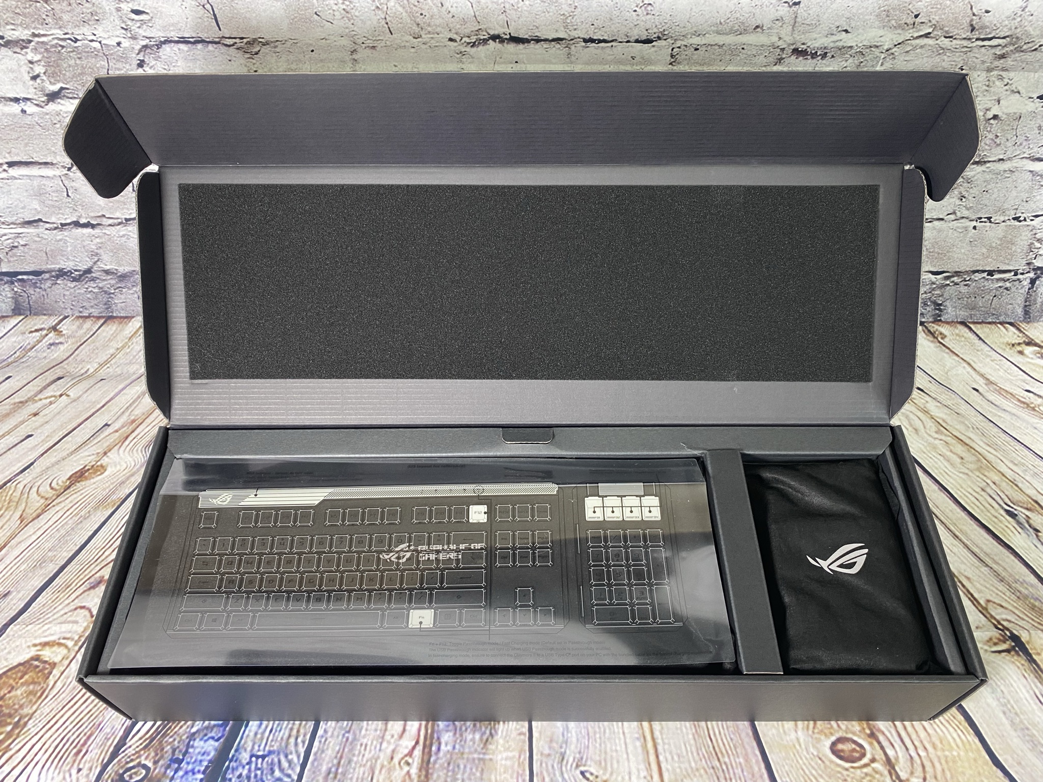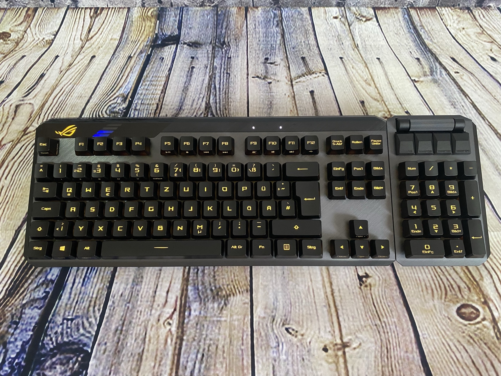 Im ersten Schritt werfen wir einen Blick auf die ersten 80 % der Claymore II. Optisch sieht sie nach dem ersten betrachten sehr edel und hochwertig aus und weist zudem keine Kratzer auf. Die für Kratzer anfälligen Stellen wurden zusätzlich mit Plastikfolien geschützt. Ihre am oberen Rand in die Länge gestreckte Form mit abgewinkelten Ecken erzeugt ein modernes Erscheinungsbild. Das Standardlayout der Keycaps im ROG-Design passt sehr gut dazu. Am oberen linken Rand befindet sich ein ROG-Logo und daneben ein Balkenstapel, welcher zu Anzeige des Akkustandes dient. Etwas weiter rechts sind die Status-LEDs, die mit einer Gravur im Gehäuse gegenzeichnet sind.