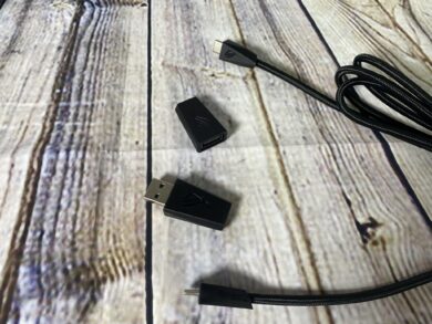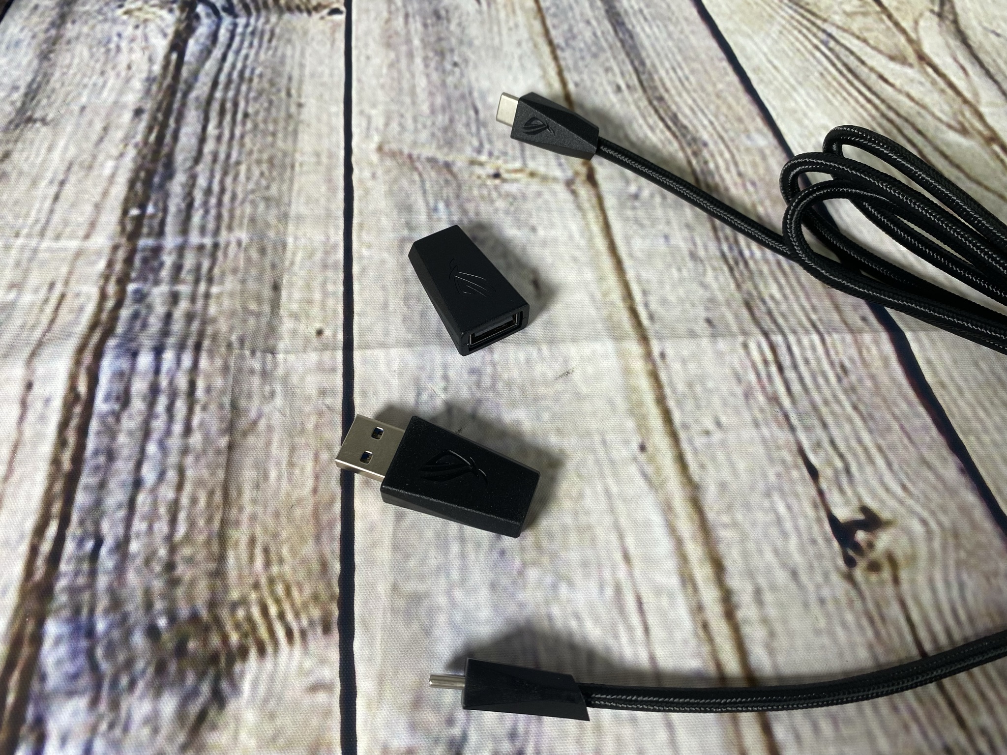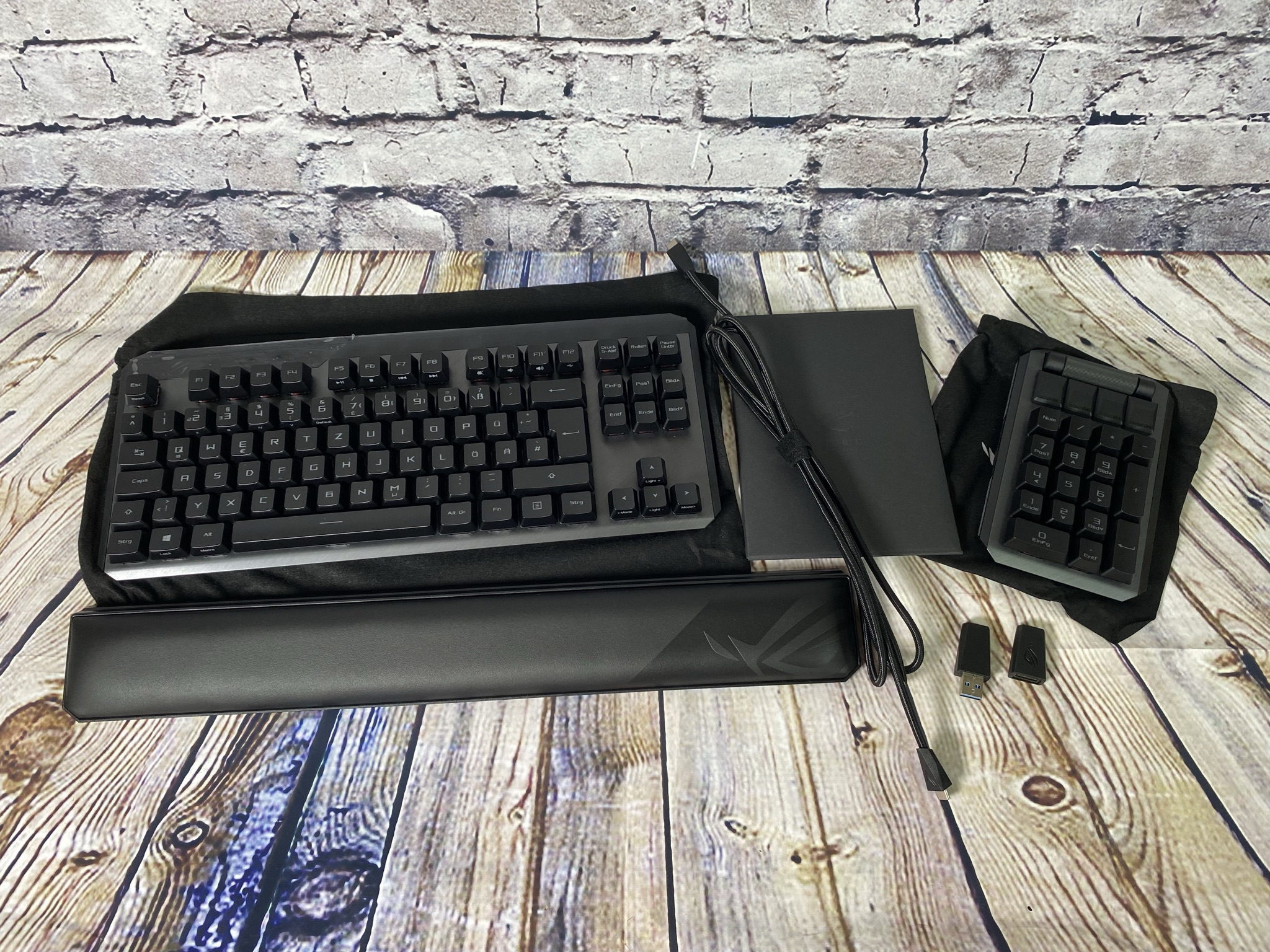 Öffnet man die schwarze innere Verpackung, sieht man eine Tastatur, die sehr schön verpackt wurde. Die Tastatur selbst wurde hierbei in schwarzen Stoffbeuteln mit einem roten ROG-Logo verpackt. Diese sehen sehr hochwertig aus und machen das Auspacken schon förmlich zu einem Erlebnis. Außerdem erfüllen sie auch nach dem Auspacken noch ihren Zweck, da sie als Staubschutz oder zum Schutz von Kratzern beim Transport dienen können. Natürlich befindet sich nicht nur die Claymore II samt Numpad in der Verpackung, sonders zudem noch ein USB-C-Kabel zum Laden, dafür zwei USB-Adapter, ein kleiner Umschlag mit Bedienungsanleitung plus Stickern und schließlich noch die Handballenauflage.