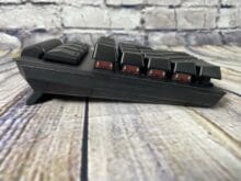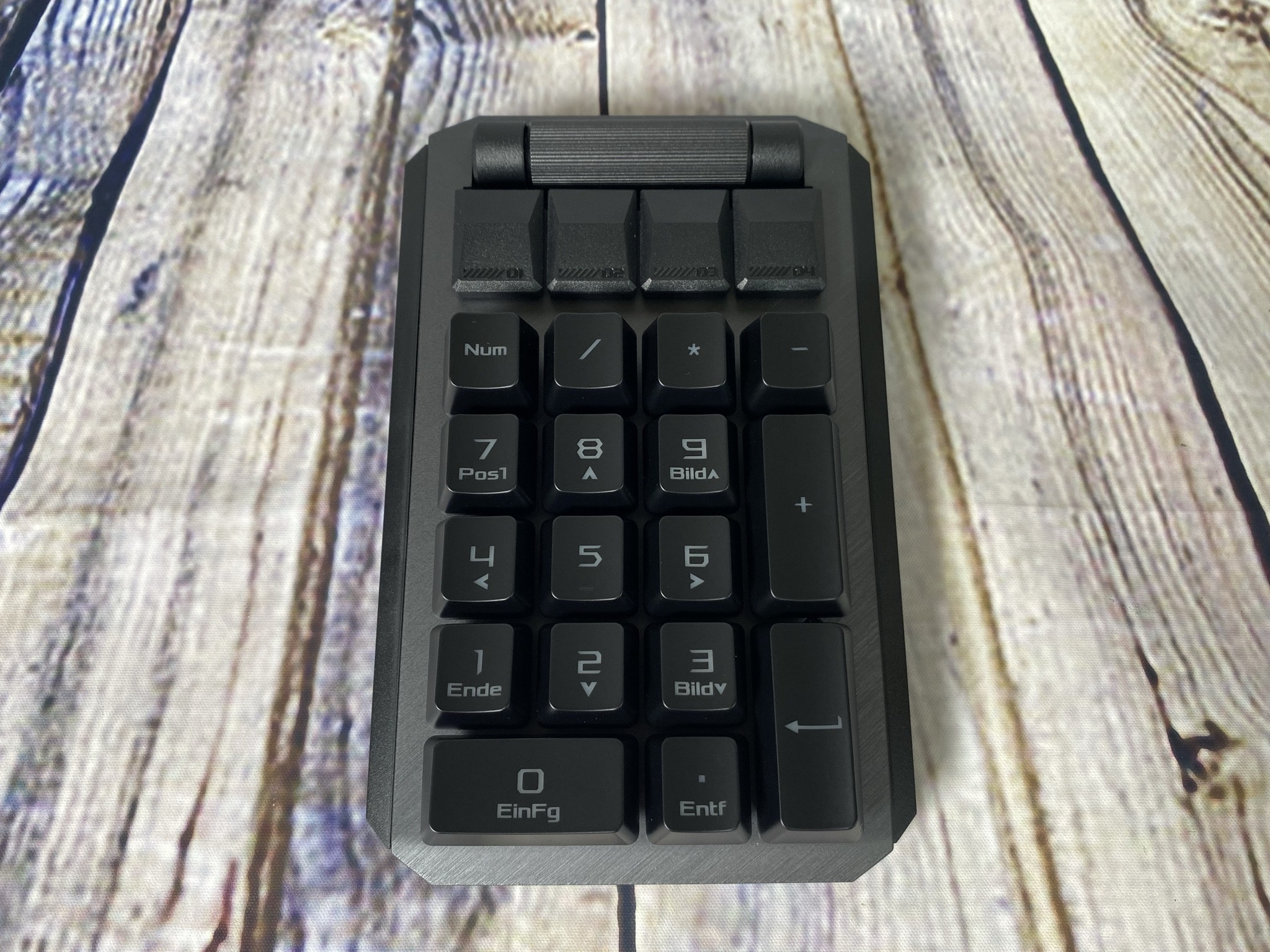 Das Numpad lässt sich nicht nur an beiden Seiten der Claymore II befestigen, sondern bringt zudem seine eigenen Features mit. Der obere Rand ist mit einem großen und länglichen Lautstärkerad und darunter vier Makrotasten bestückt. Wobei letztere nicht wie klassische Tasten aussehen, eher wie Klappen unter denen sich Tasten befinden. Anpassen lassen sich diese dann schließlich je nach den eigenen Wünschen in der Software.