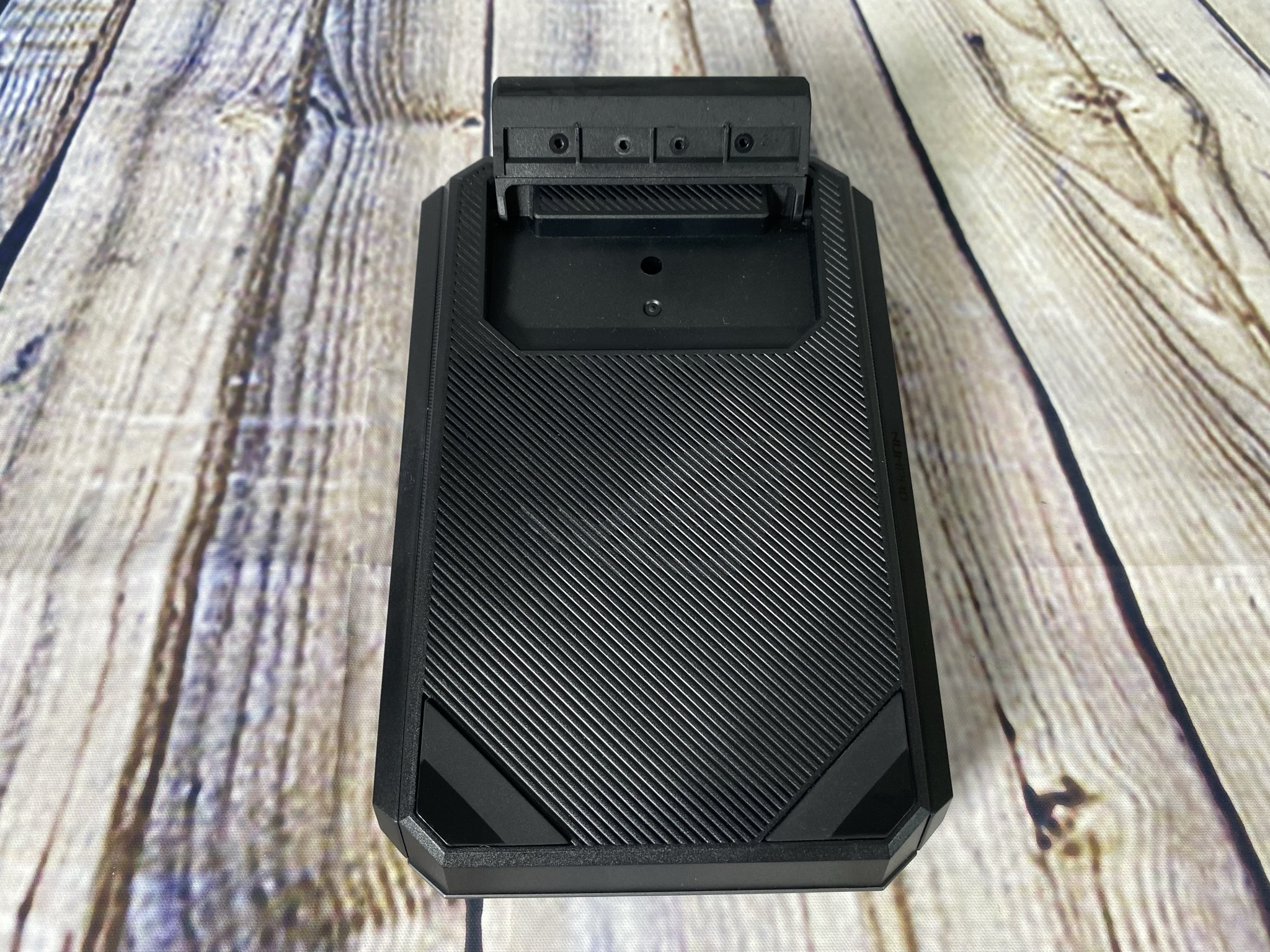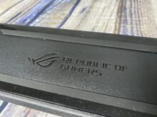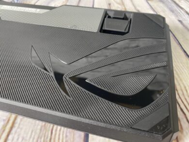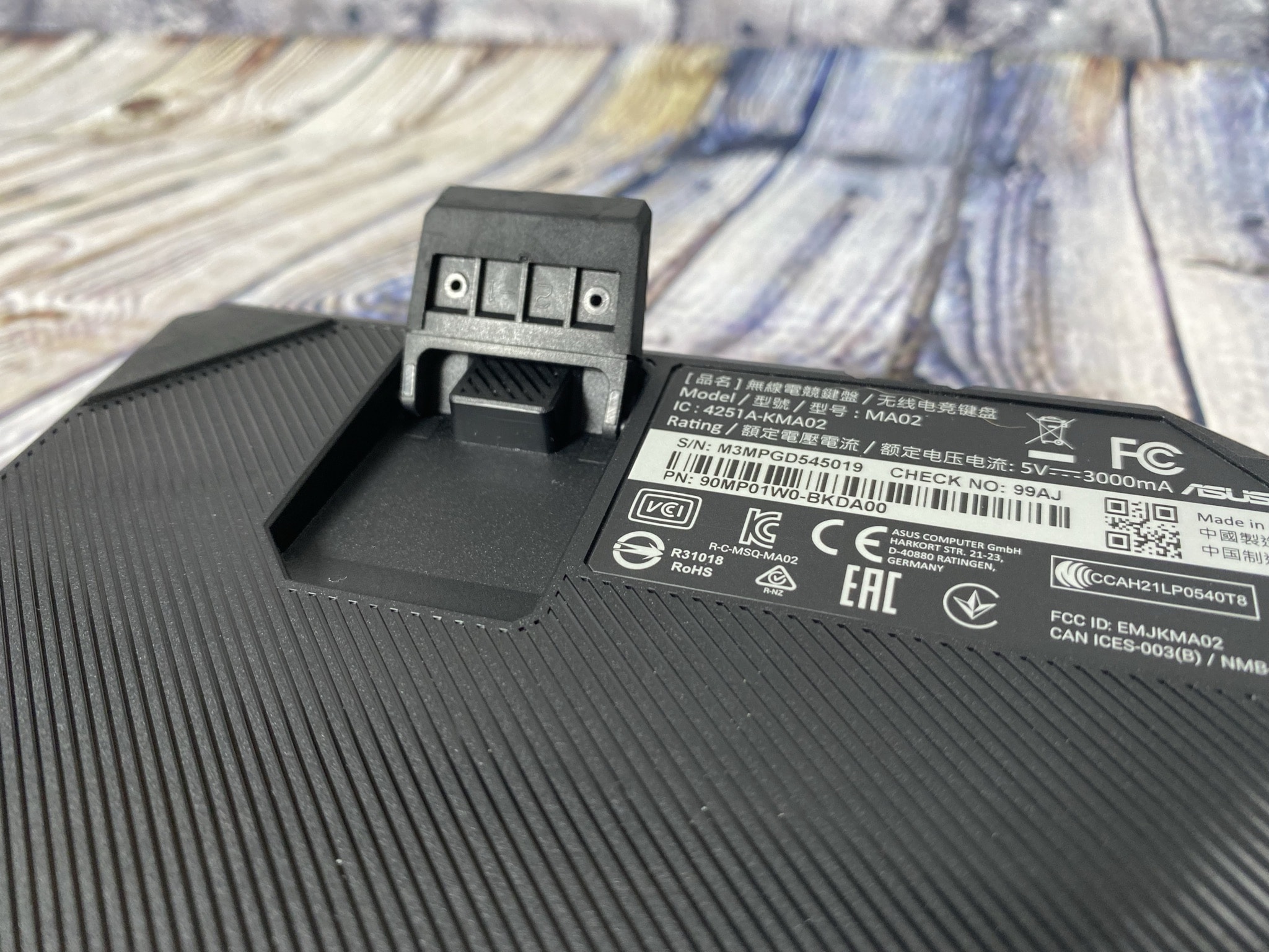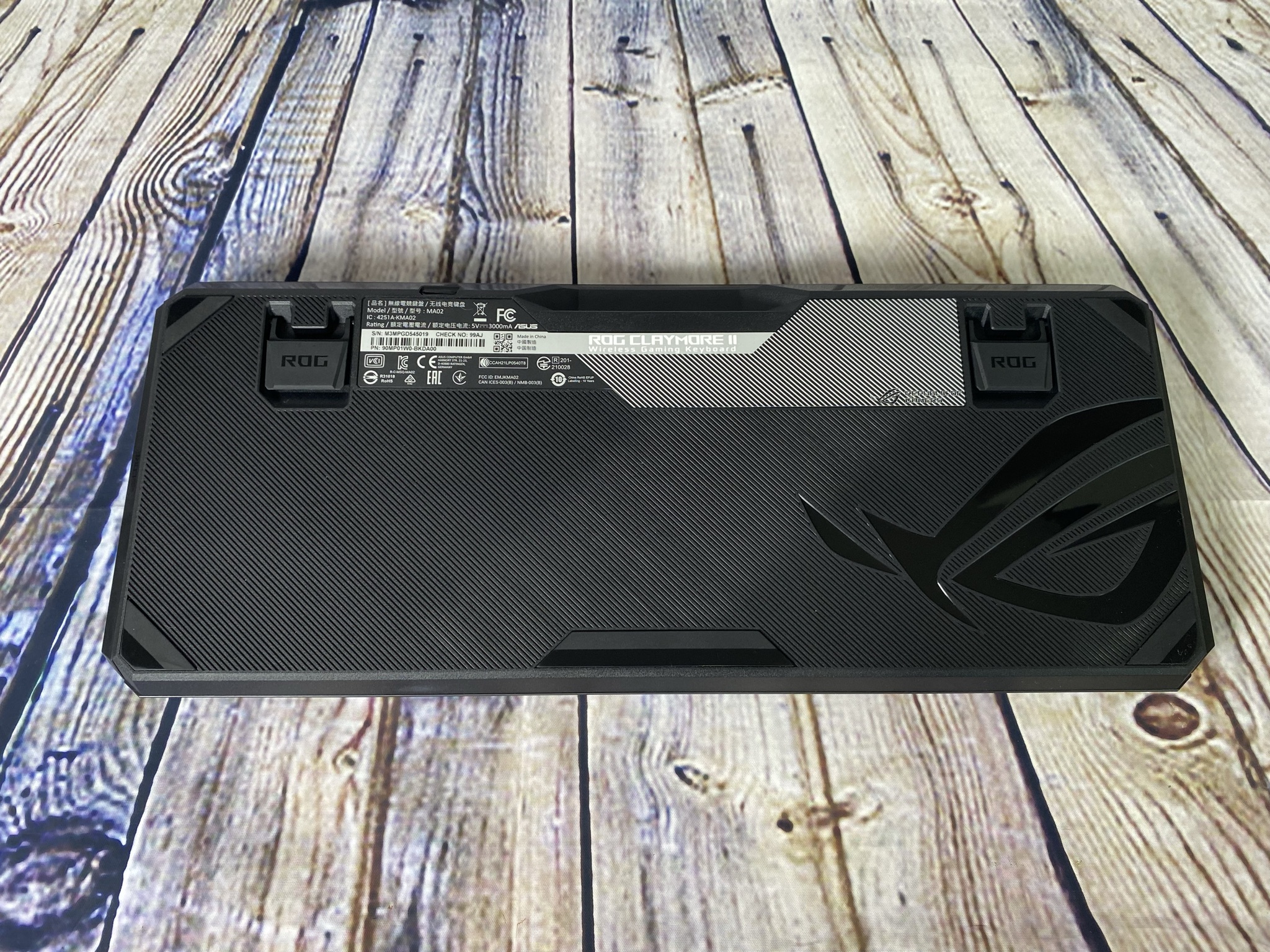 Die Rückseite der Claymore II ist schräg von links unten nach rechts oben geriffelt und hebt sich optisch mit einem großen, glänzenden ROG-Logo ab. An den vier Ecken und am unteren Ende der Tastatur befinden sich die üblichen Anti-Rutsch-Pads. Erwähnenswert sind zudem die Standfüße – auf beiden steht in einem glänzenden Schwarz „ROG“ als Schriftzug. Wenn man die Tastatur dann nutzt, wird man dies zwar nicht mehr sehen, dennoch ein kleines Detail welches das optisch ansprechende Gesamtpaket abrundet. Ausgeklappt sind die beiden Standfüße sehr stabil und erfüllen in allen Maßen ihren Zweck. Einstellen lassen sie sich nur in einer Stufe. Schaut man dann von der Seite auf die gesamte Höhe, ist diese mehr als ausreichend um für eine angenehme Ergonomie zu sorgen.