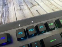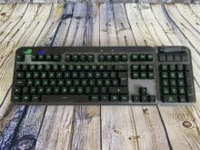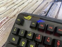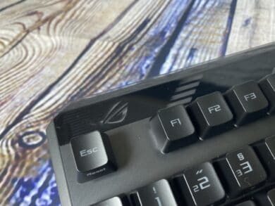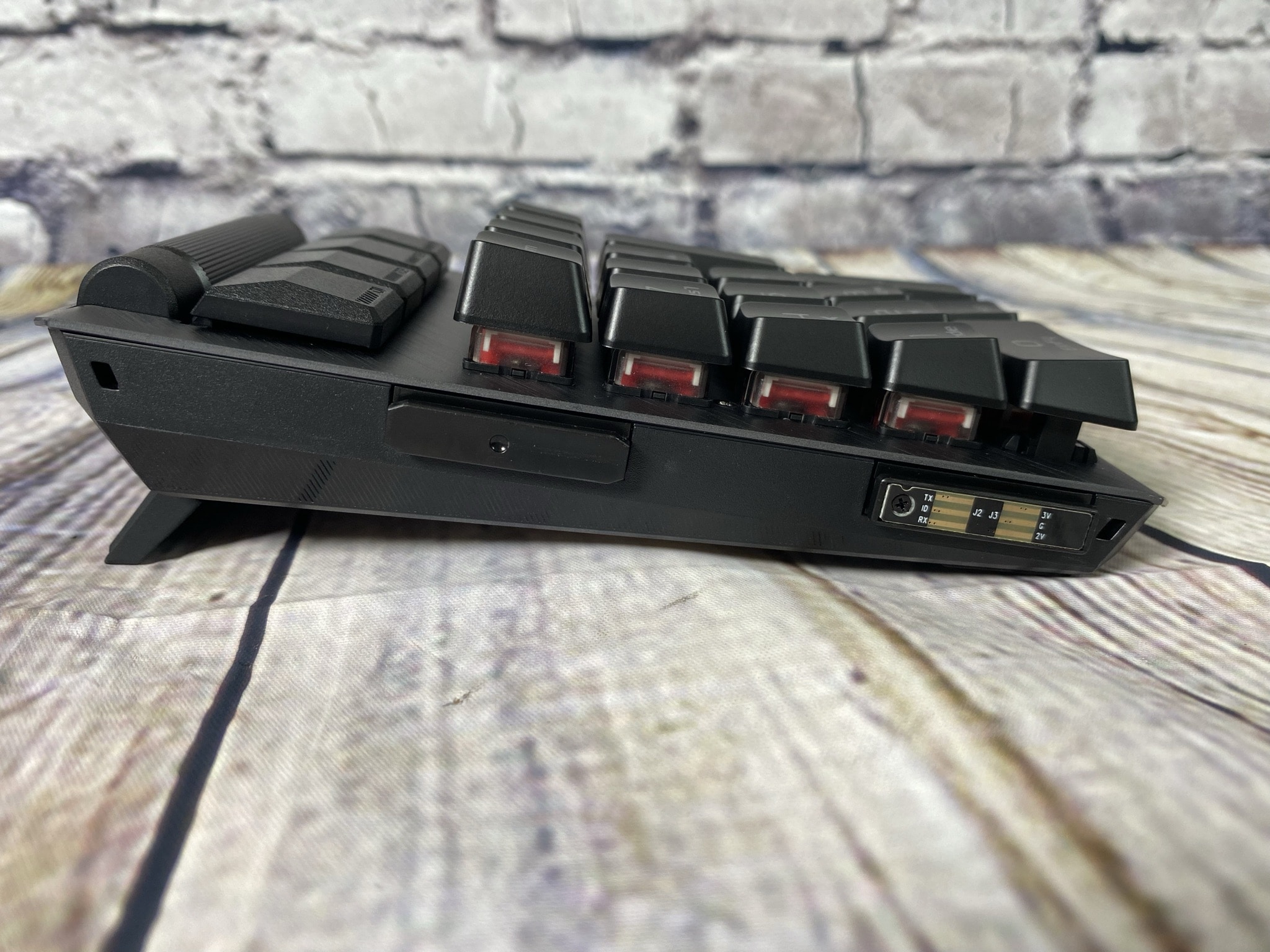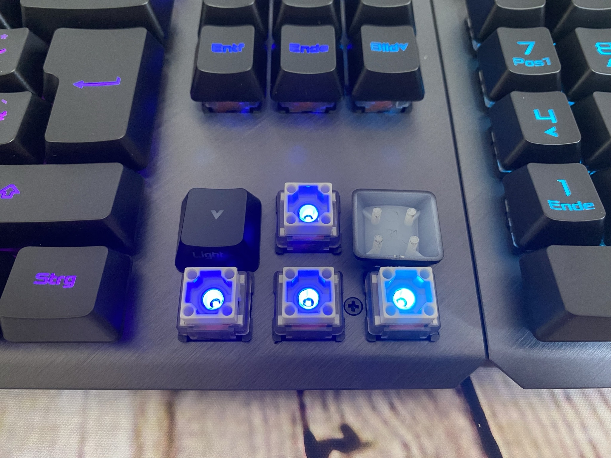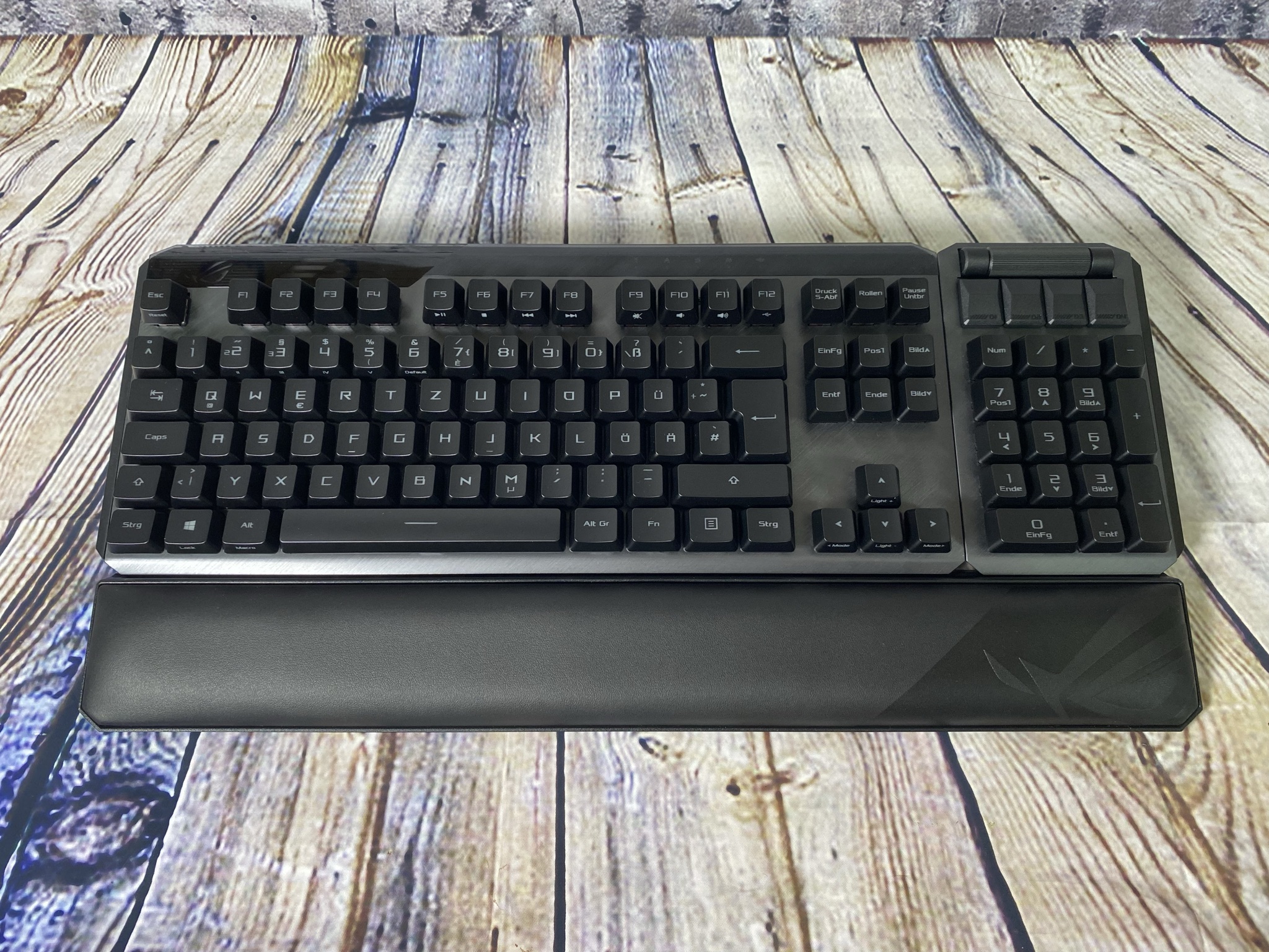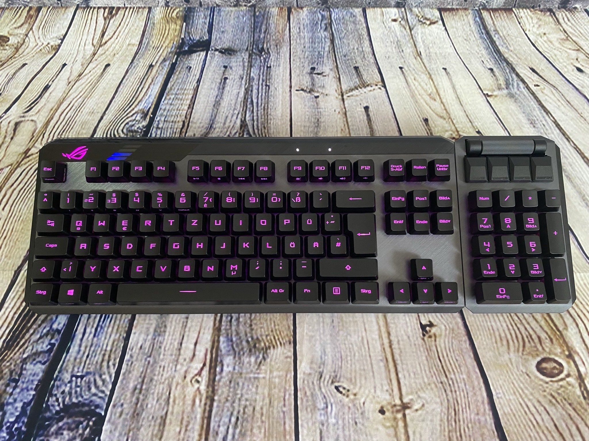Das Tippen auf der Claymore II geht einfach von der Hand. Die Anschläge fühlen sich sanft an und haben dabei einen eher leisen, dumpfen Ton. Am Ende des Rückwegs hört man die Feder etwas lauter metallisch einrasten. Egal wo man den Finger auf der ABS-Kappe legt, das Drücken fühlt sich immer gleich an. Das liegt an den Switches, welche mit ihrem untypischen quadratischen Aufbau für einen wackelfreien Tastenanschlag sorgen. In der Praxis merkt man dank dem 2,4-GHz-Wireless-Modus in Kombination mit den Switches nahezu keine Verzögerung – laut ROG liegt die Verzögerung bei etwa 1 Millisekunde mithilfe der neusten optisch-mechanischen ROG-Switches. Außerdem beweisen die Multimedia-Tasten als auch die Makrotasten ihre Funktionalität im Alltag.