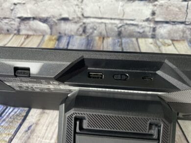 Als Letztes wollen wir noch mal ein Auge auf die Anschlüsse werfen, welche sich in einer Einkerbung mittig am Ende der Tastatur befinden. Mittig ist hier ein kleiner Schalter zum An- und Ausschalten. An der jeweils linken und rechten Seite befinden sich ein USB-A-Port und ein USB-C-Port zum Laden oder direkten Verbinden der Tastatur mit dem PC. Etwas weiter abschüssig ist nochmals ein kleines Loch, in der sich der Wireless-USB-Adapter befindet. Durch einen einfachen Push-Mechanismus bekommt man den Adapter aus seiner Position gelöst.