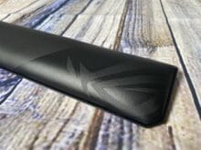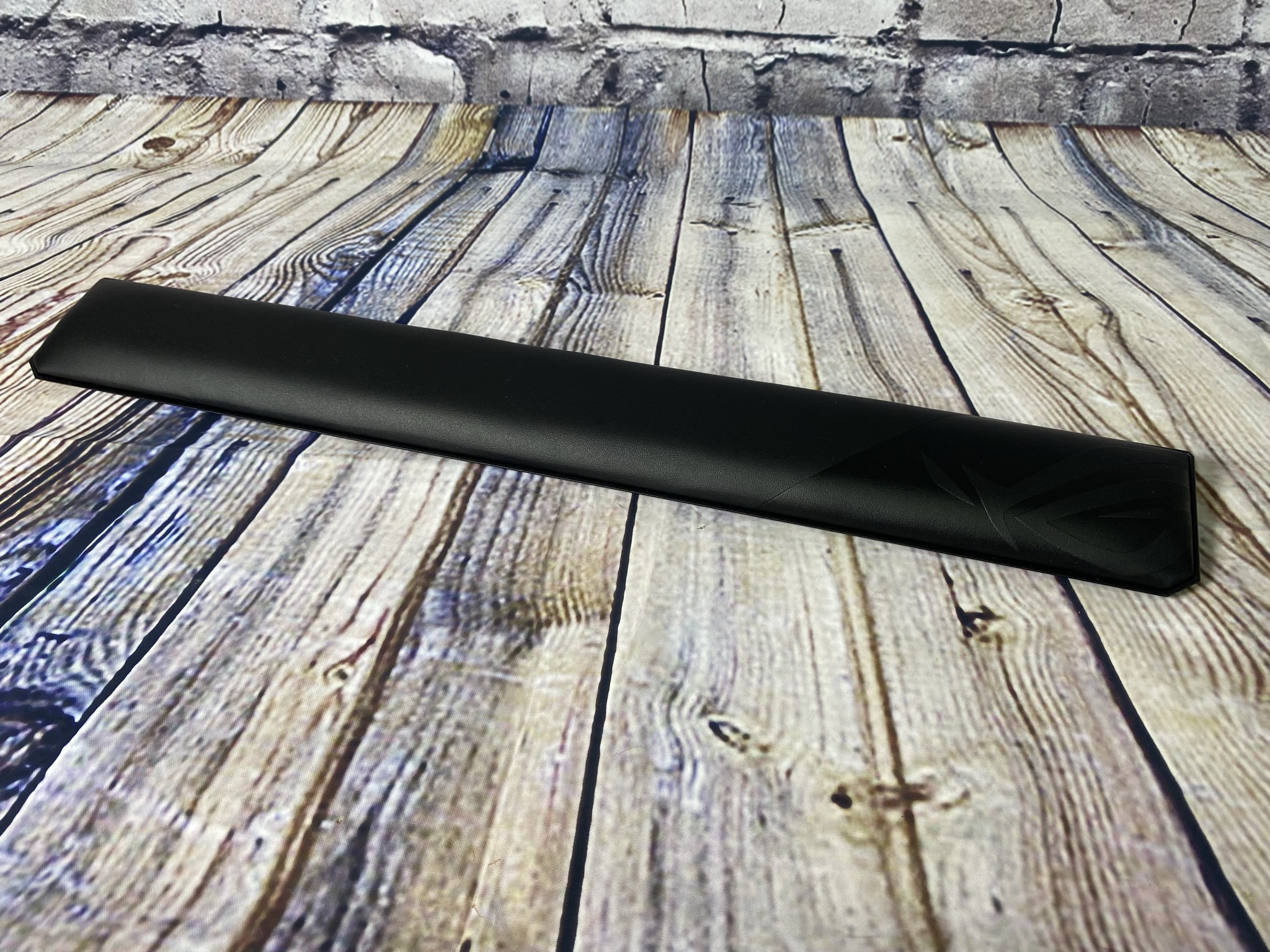Ein weiteres Extra ist dann noch die hochwertig gestaltete Handballenauflage. Diese ist mit einem weichen Schaumstoff und darüber mit glänzendem schwarzen Kunstleder bezogen. Das Kunstleder hat am rechten Ende wieder eine ROG-Logo-Prägung und passt sich somit optisch an. Mit insgesamt sechs Anti-Rutsch-Pads bleibt sie an der Tischplatte standhaft. Grundlegend bekommt sie ihren Halt an der Claymore II durch die kleine untere abgesenkte Kante mit Magneten – somit muss man sich nie Gedanken machen, ob die Entfernung der Handballenauflage stimmt, da man sie individuell anpassen kann.