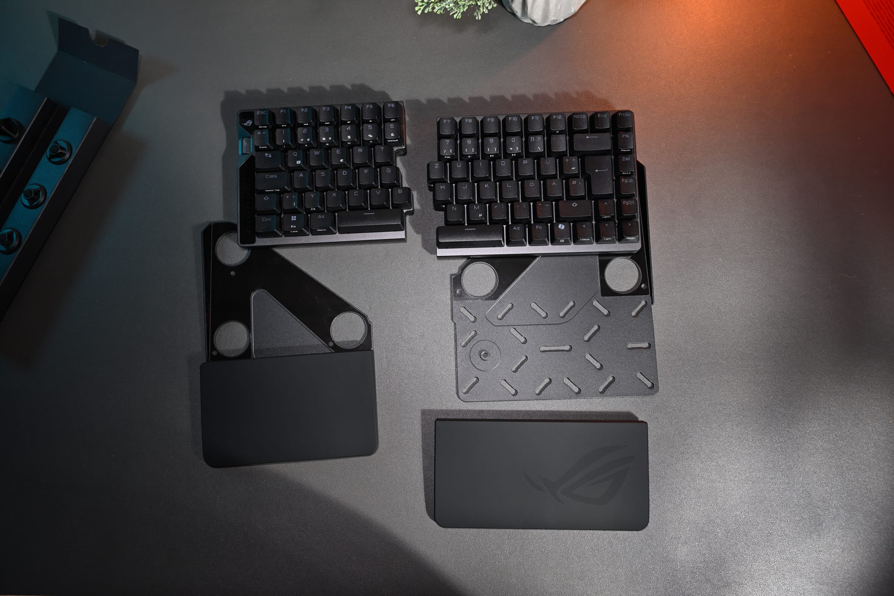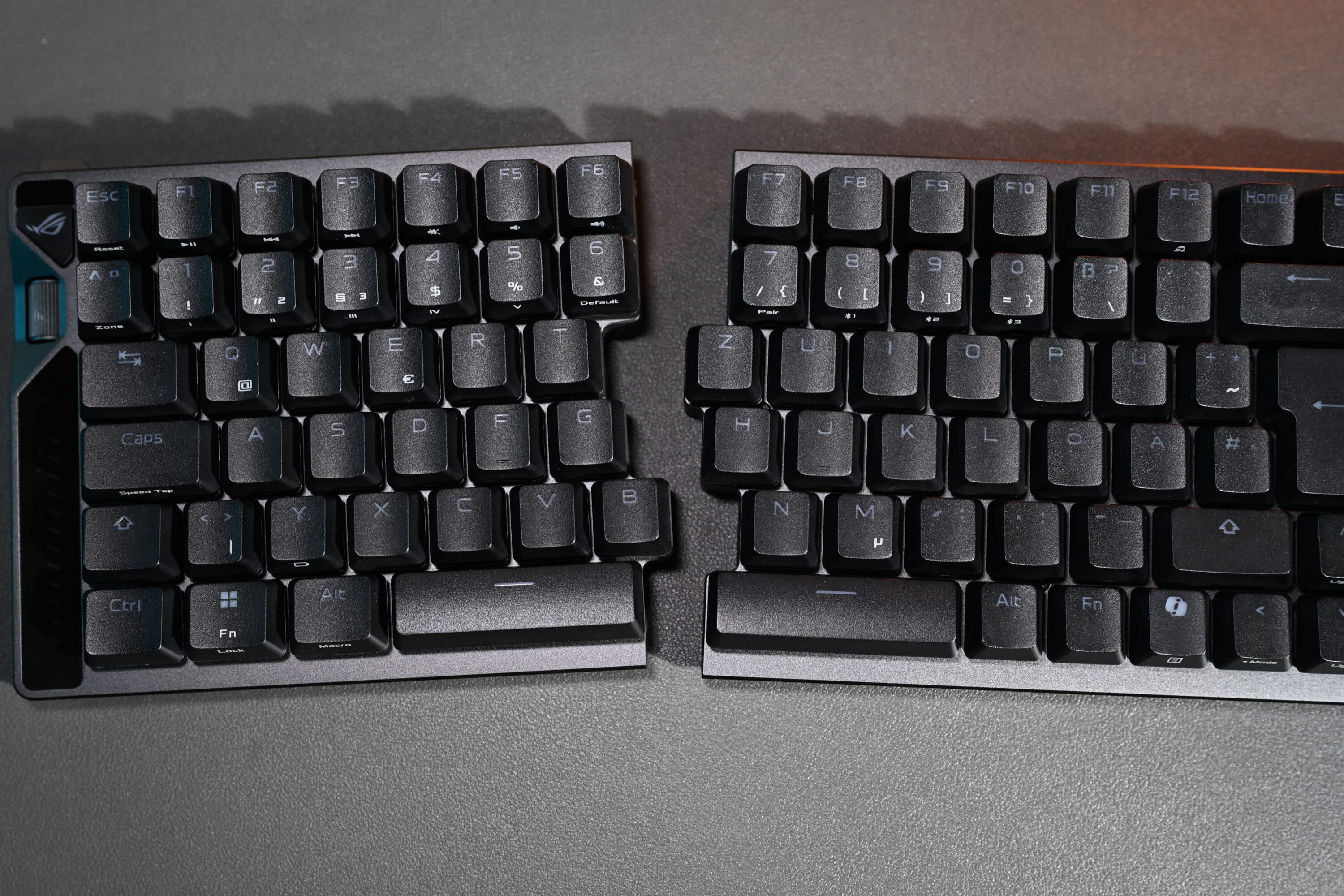 Allerdings bedient die ASUS ROG Falcata mit ihrem Split-Design ganz klar eine Nische, was sich auch in der Ergonomie zeigt. Denn egal in welchem Winkel ich die beiden Hälften auch aufstelle: Wirklich ergonomisch bequem ist das (insbesondere zum Schreiben) nicht. Zumal beide Hälften immer über eines der beiden beiliegenden, sehr kurzen, USB-Kabel verbunden werden wollen. Kabel von Drittherstellern werden nicht unterstützt.