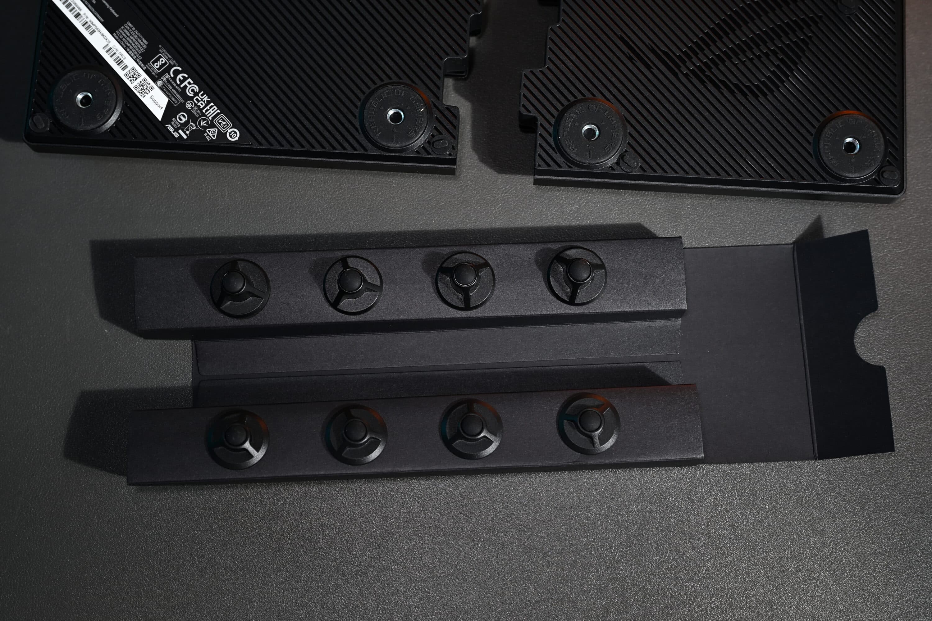 Für ein gedämpftes Tippgeräusch sorgt eine vierlagige Schalldämmung aus Materialien wie Silikon und Poron-Schaum, die die Geräuschkulisse drastisch reduziert. Zum Lieferumfang der ASUS ROG Falcata gehört unter anderem abnehmbare Silikon-Handballenauflage auf einem Metall-Bett, die optional genutzt werden kann.
