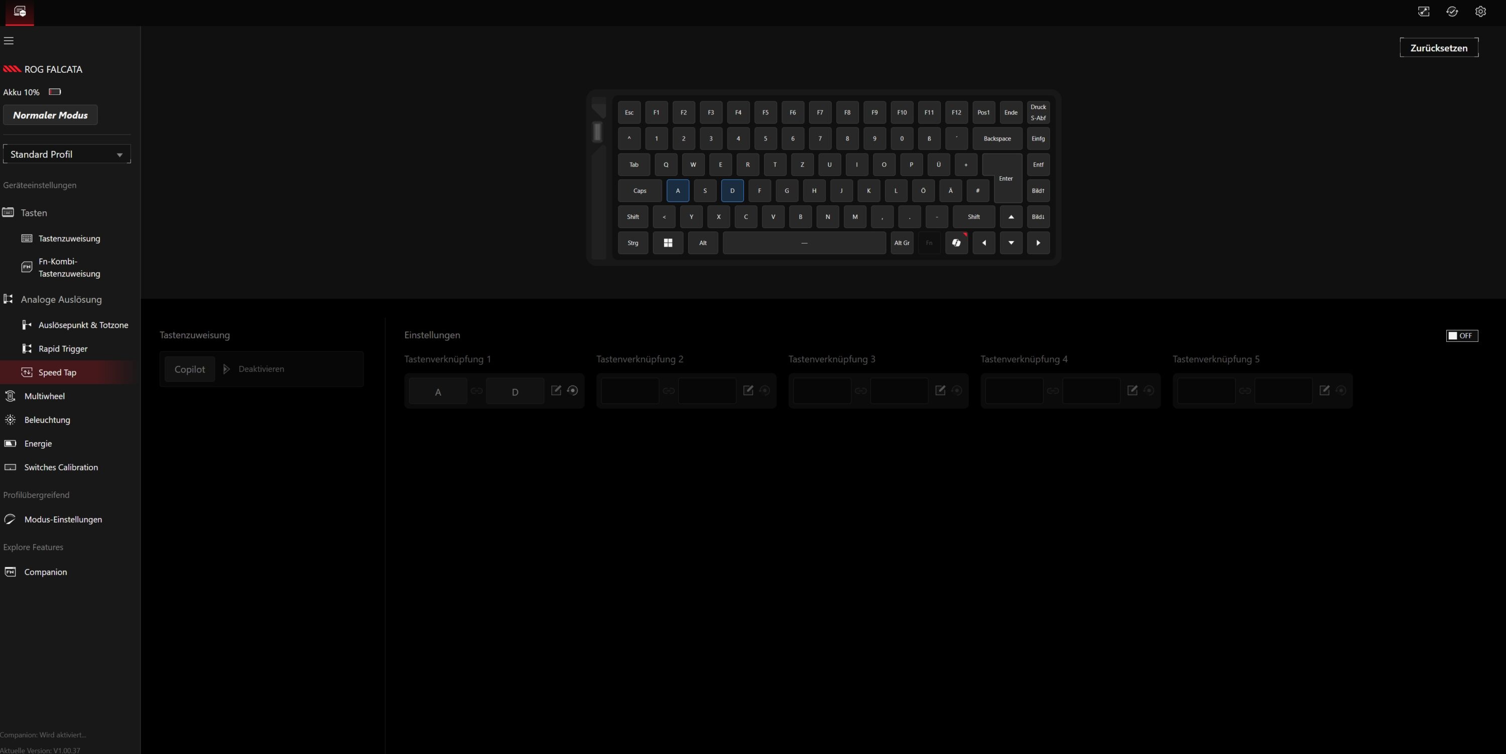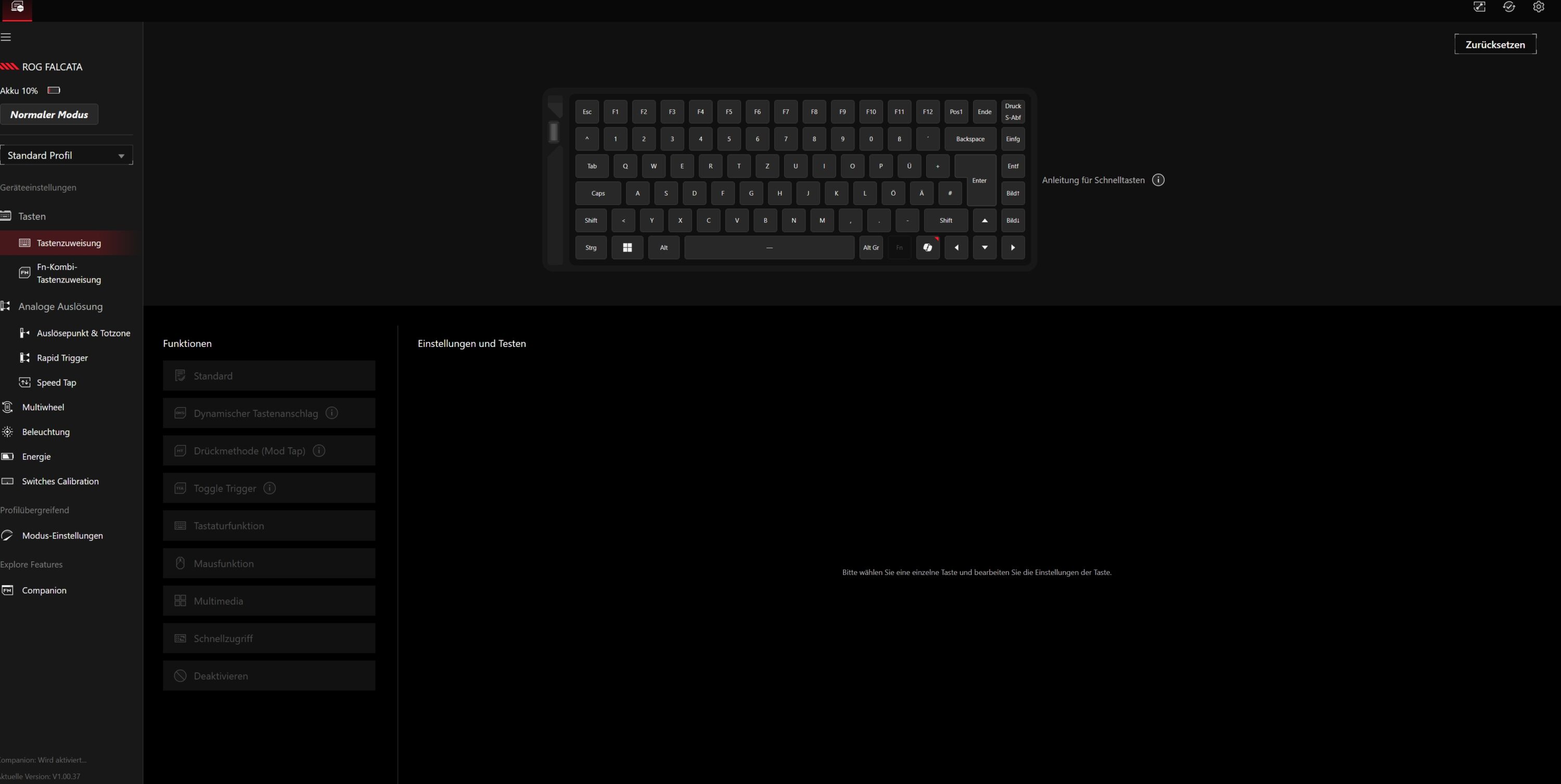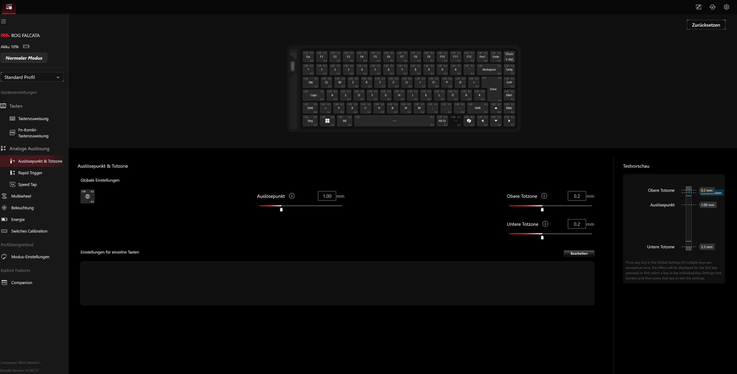 Im Praxiseinsatz überzeugt die ASUS ROG Falcata mit ihrer technisch beeindruckenden Ausstattung. Insbesondere die Hall-Effekt-Switches gehören mit zum Besten, was ich bislang im Bereich dieser magnetischen Schalter gesehen habe und reagieren akkurat auf die leichteste Berührung. Das erlaubt blitzschnelle Eingaben, die vor allem bei schnellen Spielen wie Shootern und Strategietiteln spielentscheidend sein können. Die einstellbaren Auslösewege bieten die Möglichkeit, das Tippverhalten exakt auf die persönlichen Vorlieben anzupassen.
