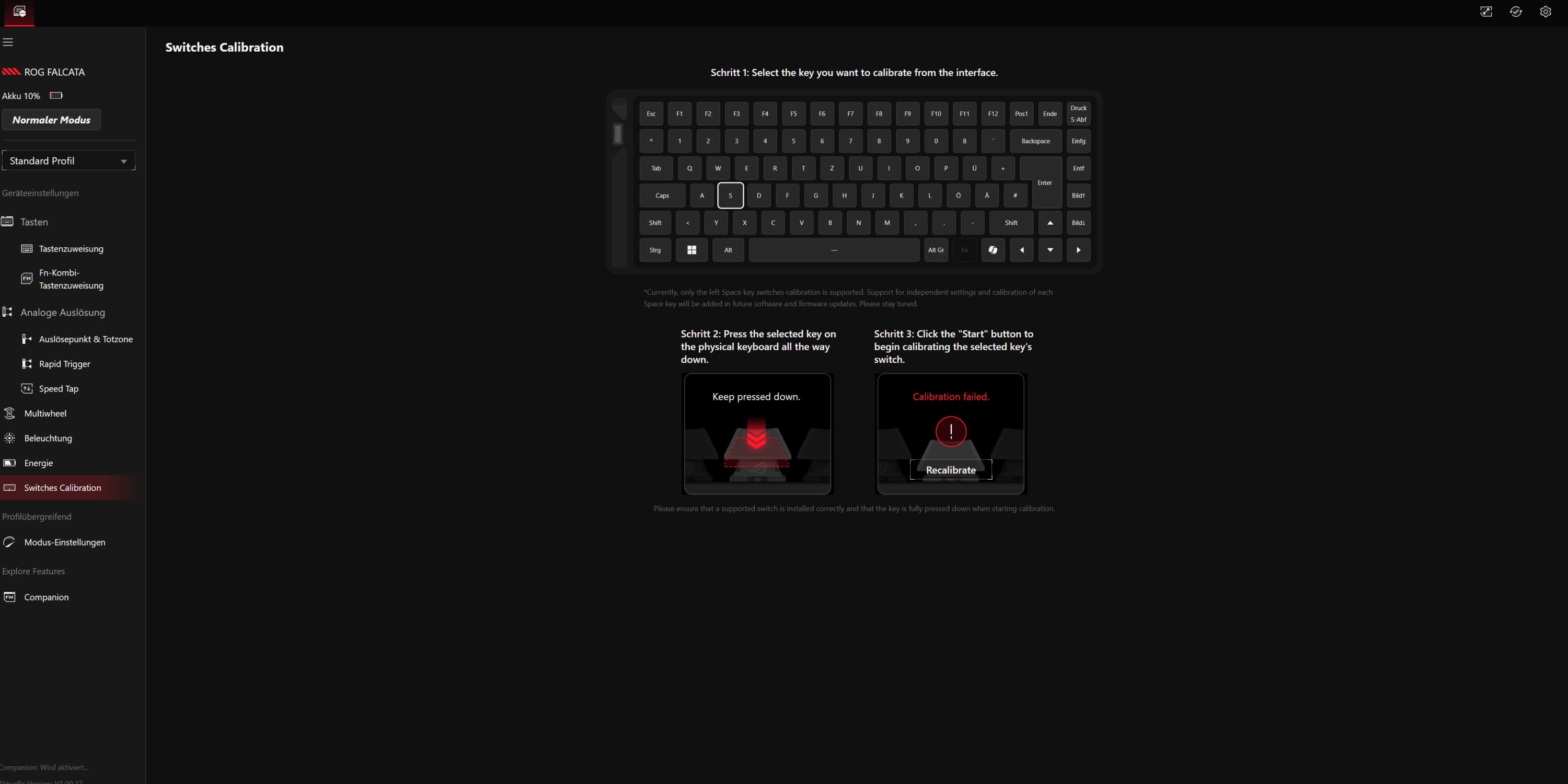 Leider hat diese mit der neuen Tastatur offenbar noch ein paar Probleme, gerade, was eine intuitive Bedienung, im Bereich der Onboard-Einstellungen oder bei der Anpassung von Multifunktionsrad und -taste betrifft. Auch die Kalibrierung der Tasten, die das Web-Interface eigentlich ermöglicht, klappte im Rahmen des Tests nicht.