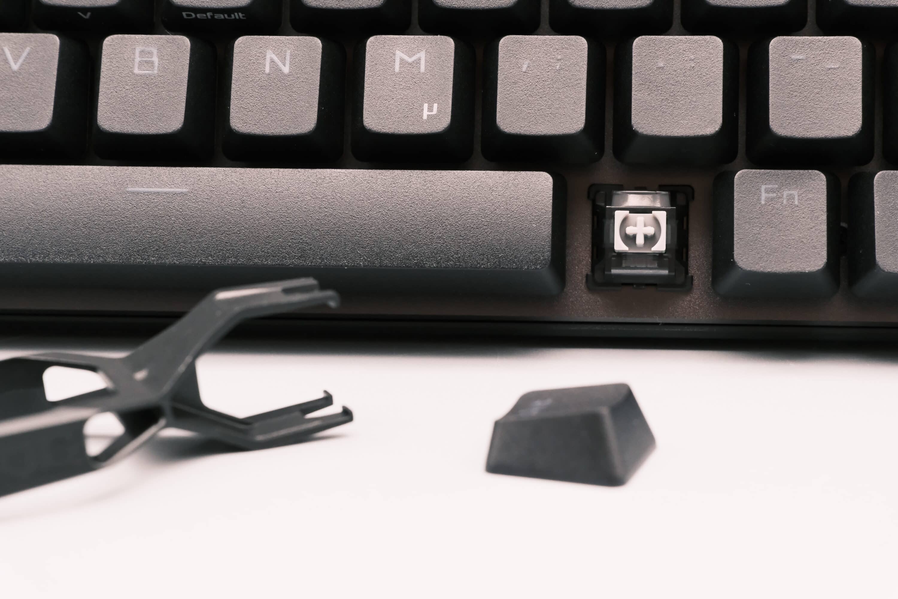 Die Tastenkappen lassen sich aber sehr wohl problemlos austauschen und durch eigene Keycaps ersetzen. Einen entsprechenden Puller zum Entfernen legt der Hersteller dem Lieferumfang bei.