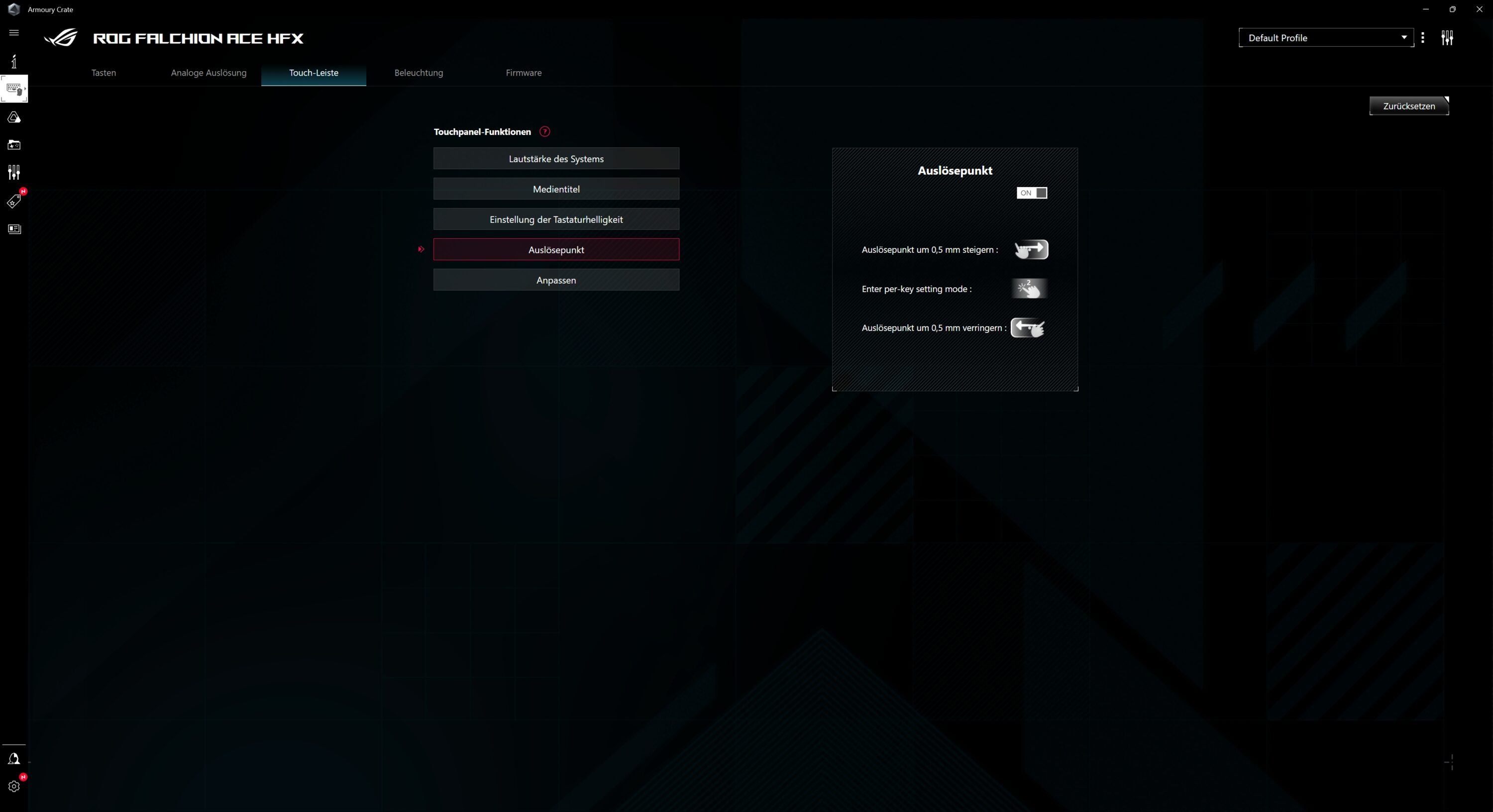 Nun sind die verbauten ROG HFX Magnetic Switches, die Besonderheite der HFX-Version, ohnehin bereits sehr leise. Ihre Besonderheit liegt darin, dass sich der Betätigungspunkt zwischen 0,1 mm und 4,0 mm anpassen lässt. Das funktioniert wahlweise über die Function-Taste oder aber über die Armoury Crate-Software.