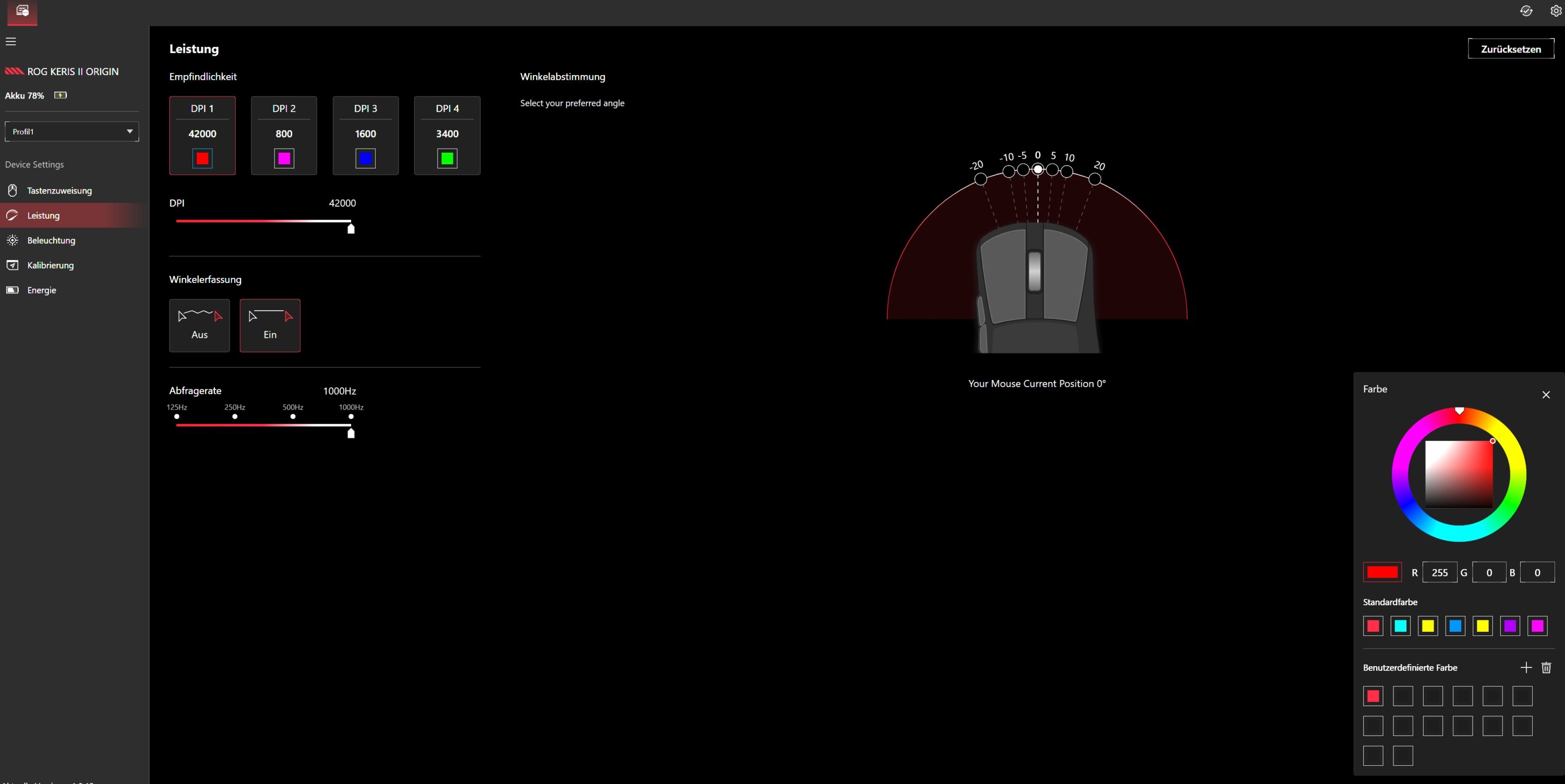 Anpassungen der Auflösung sind in 50-DPI-Schritten möglich. Die Pollingrate ist dabei standardmäßig auf 1.000 Hz beschränkt, was für die meisten absolut ausreichend sein dürfte. Mithilfe des Polling Rate Boosters (der hier leider nicht beiliegt) kann diese aber auf 8.000 Hz erhöht werden, was die Latenz um ein Vielfaches reduziert.