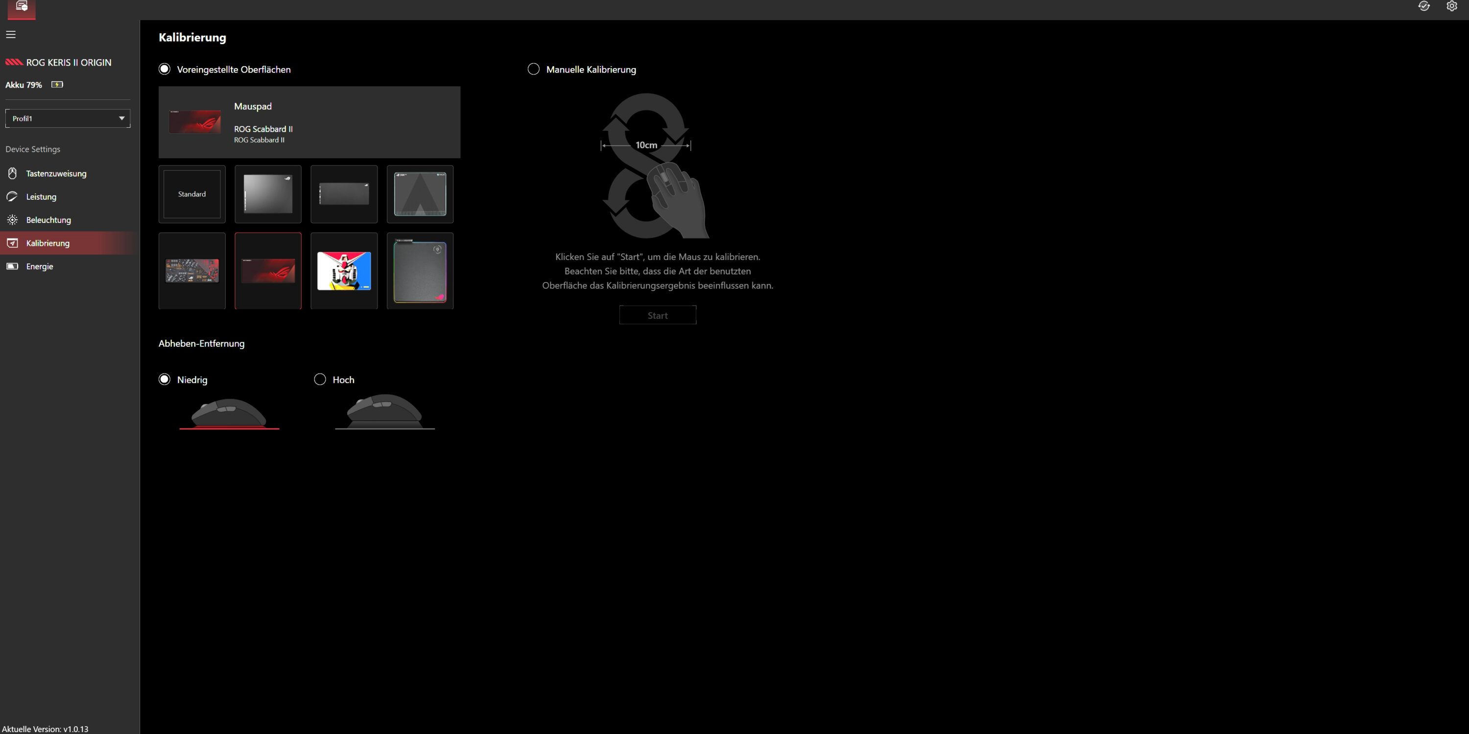 Eine Kalibrierung für verschiedene Mauspads des Herstellers, darunter das Moonstone L (unser Test) aus Glas ist möglich, alternativ kannst du die Oberflächenkalibrierung auch manuell anstoßen. Auch eine Anpassung der Tastenbelegung fünf insgesamt sechs Tasten ist möglich, während in den Energieoptionen beispielsweise eine Warnung der Beleuchtung bei Erreichen eines bestimmten Akkustandes eingestellt werden kann.