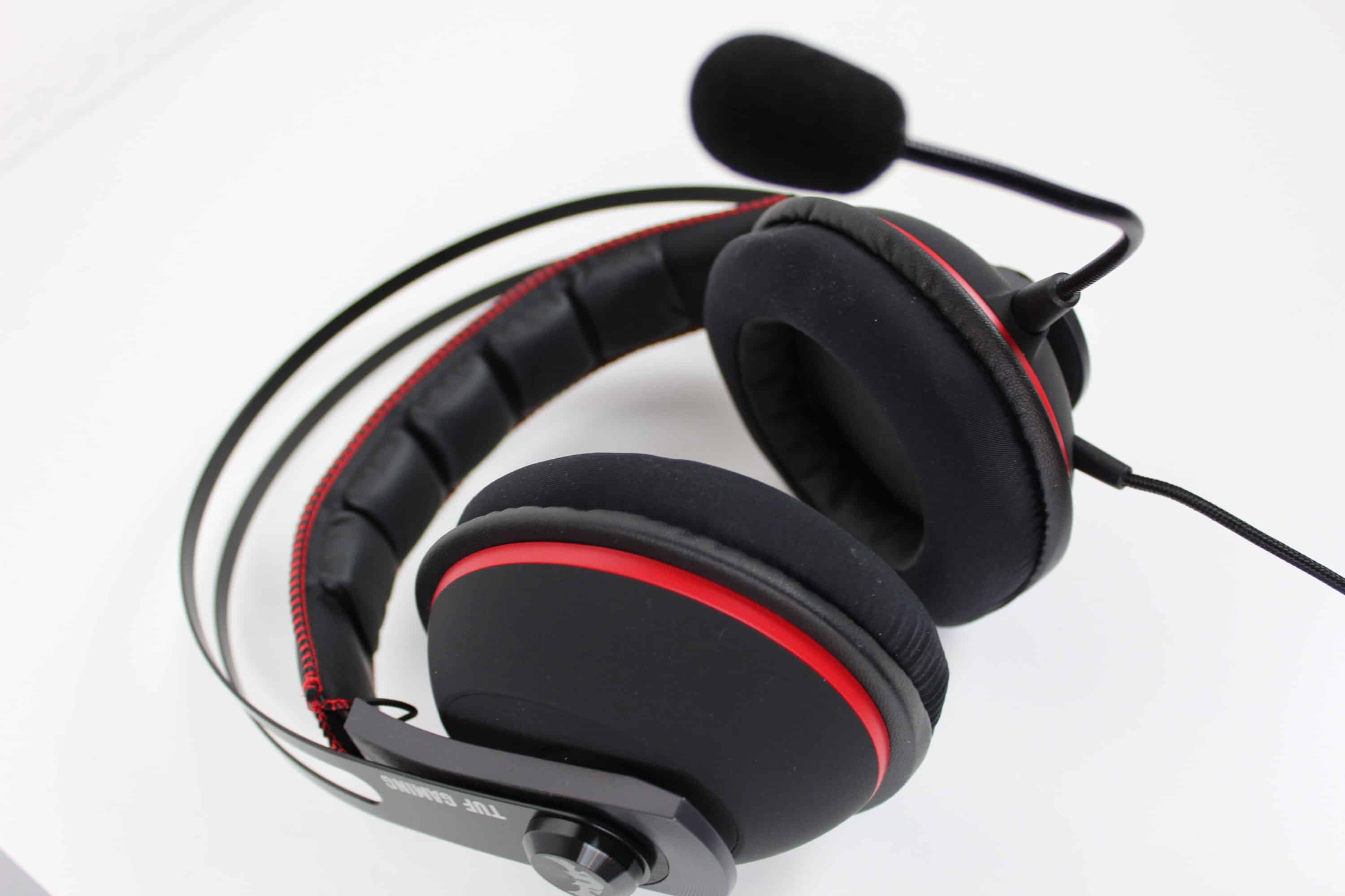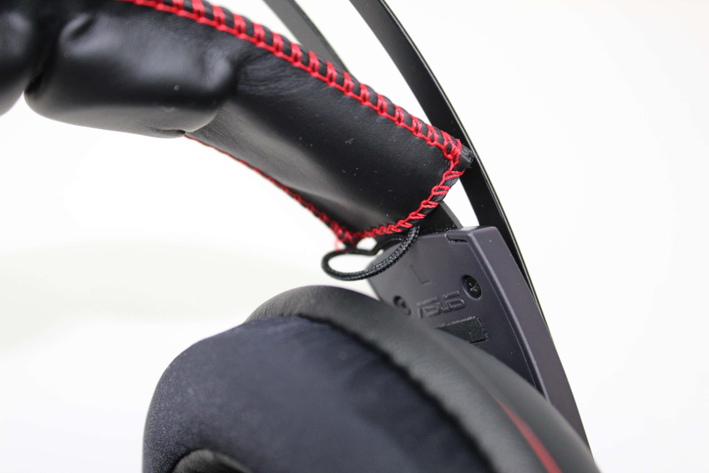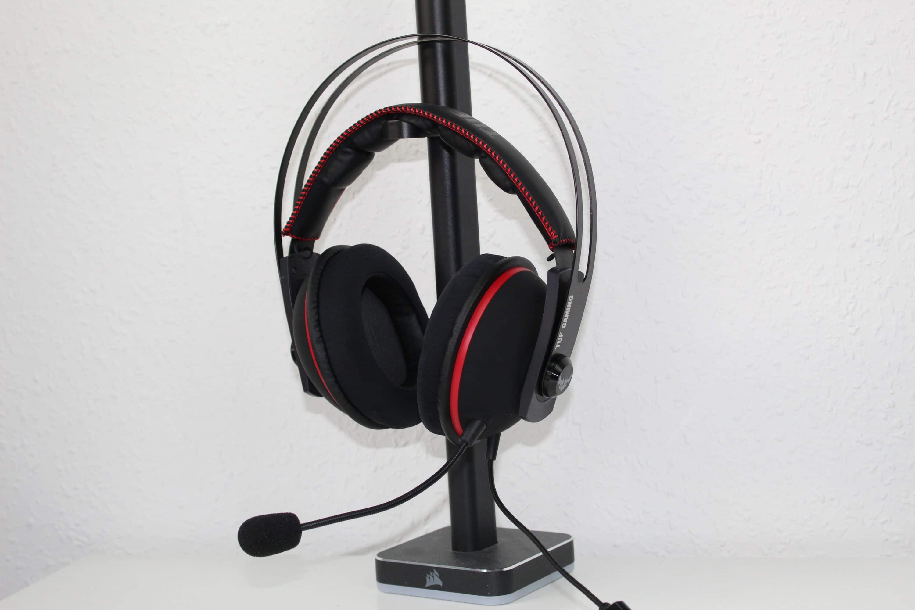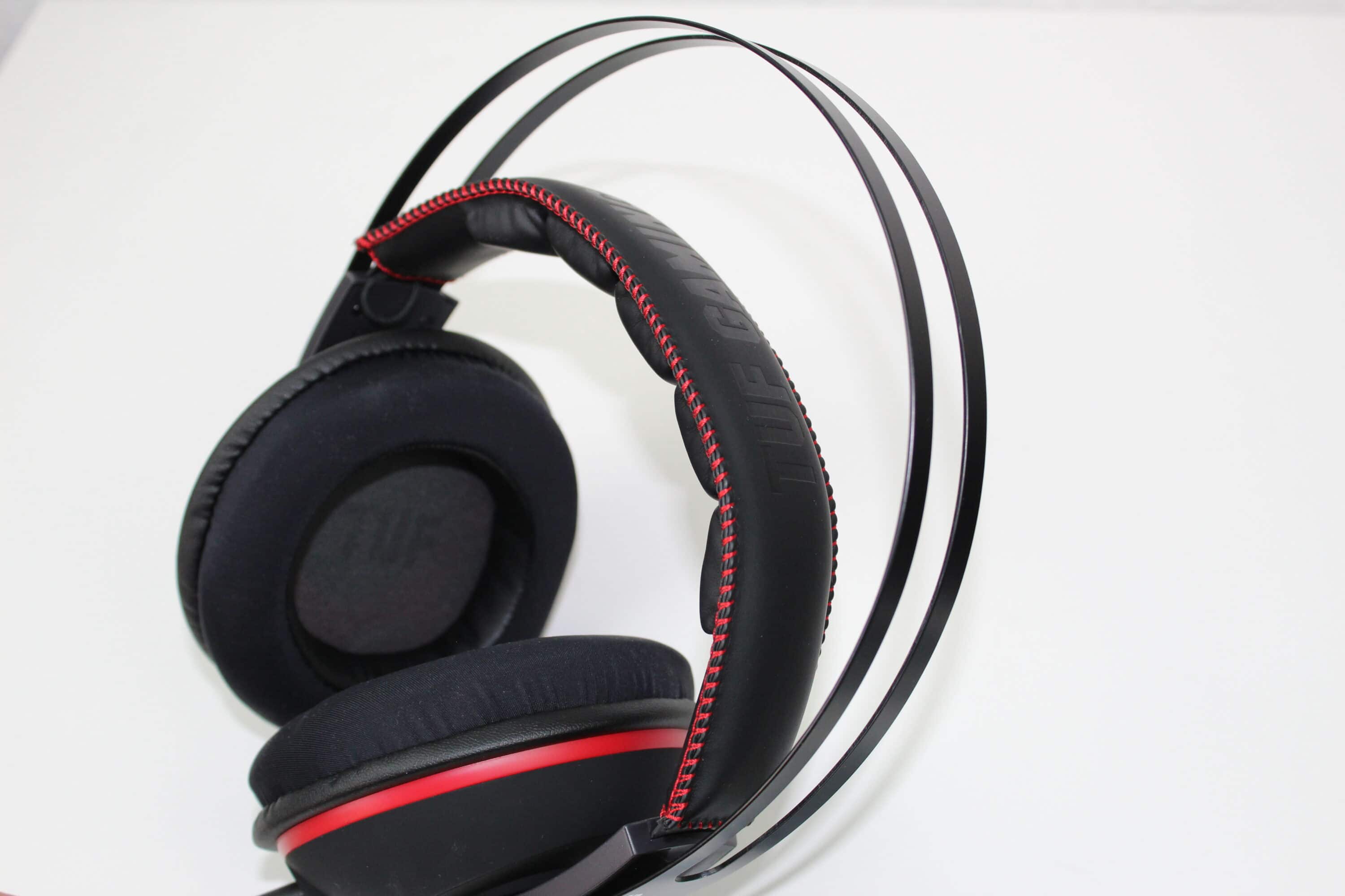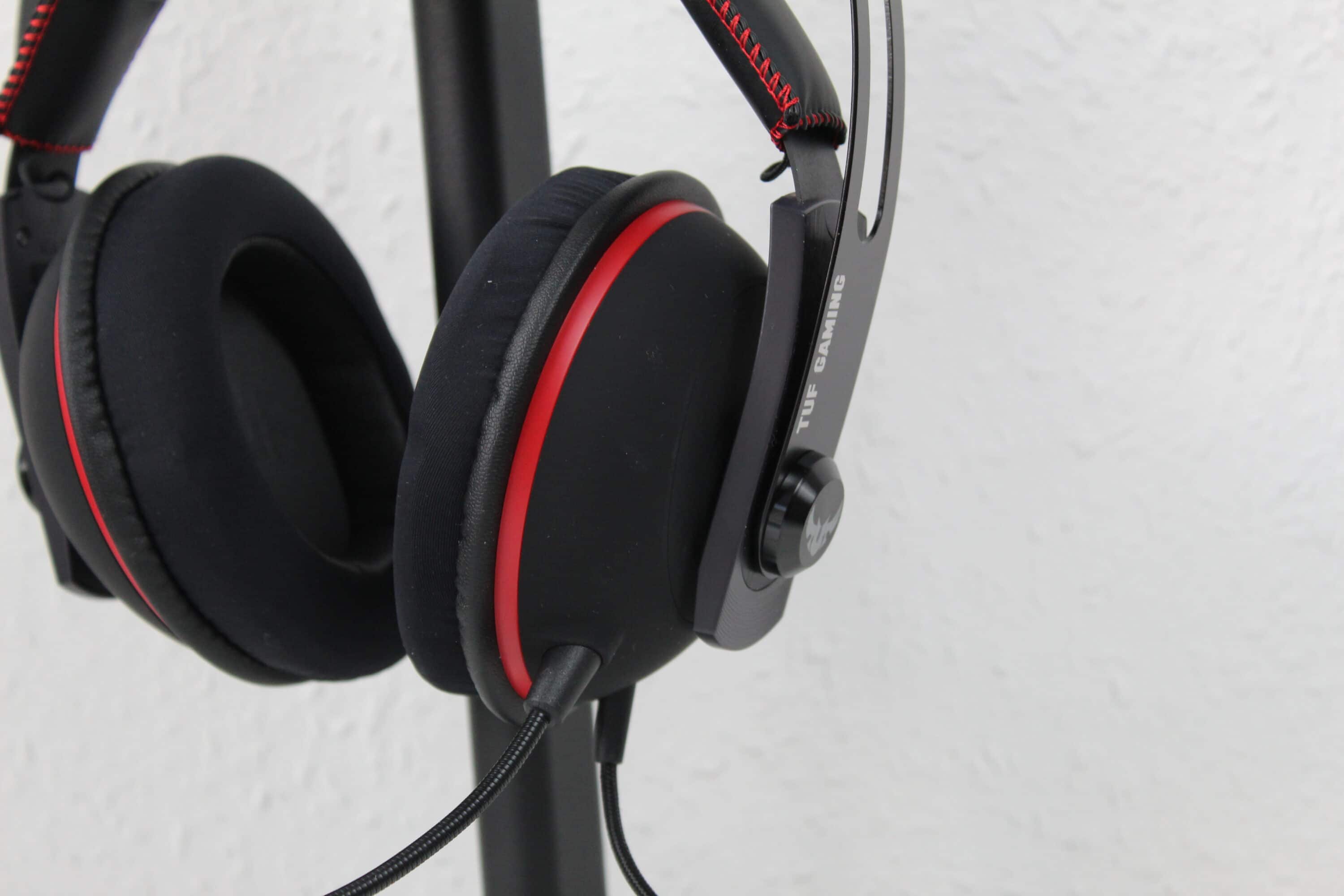 Das Headset ist mit einem Kopfband versehen, dass sich auf die eigene Kopfgröße anpasst. Der Metallbügel darüber sorgt für die nötige Stabilität. Ein „TUF GAMING“-Schriftzug, sowie das TUF-Logo zieren die Befestigung der Ohrmuscheln am Bügel. Die Befestigung dieser ist recht starr, große Möglichkeiten, das Headset zu verstellen sind nicht vorhanden – lediglich das Band sorgt für die Anpassung. Das Headset lässt sich mit kleinen, aber auch großen Köpfen bequem tragen und fühlt sich trotz der 390 Gramm Gewicht sehr leicht an – auch hier hilft der Kopfbügel.