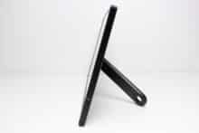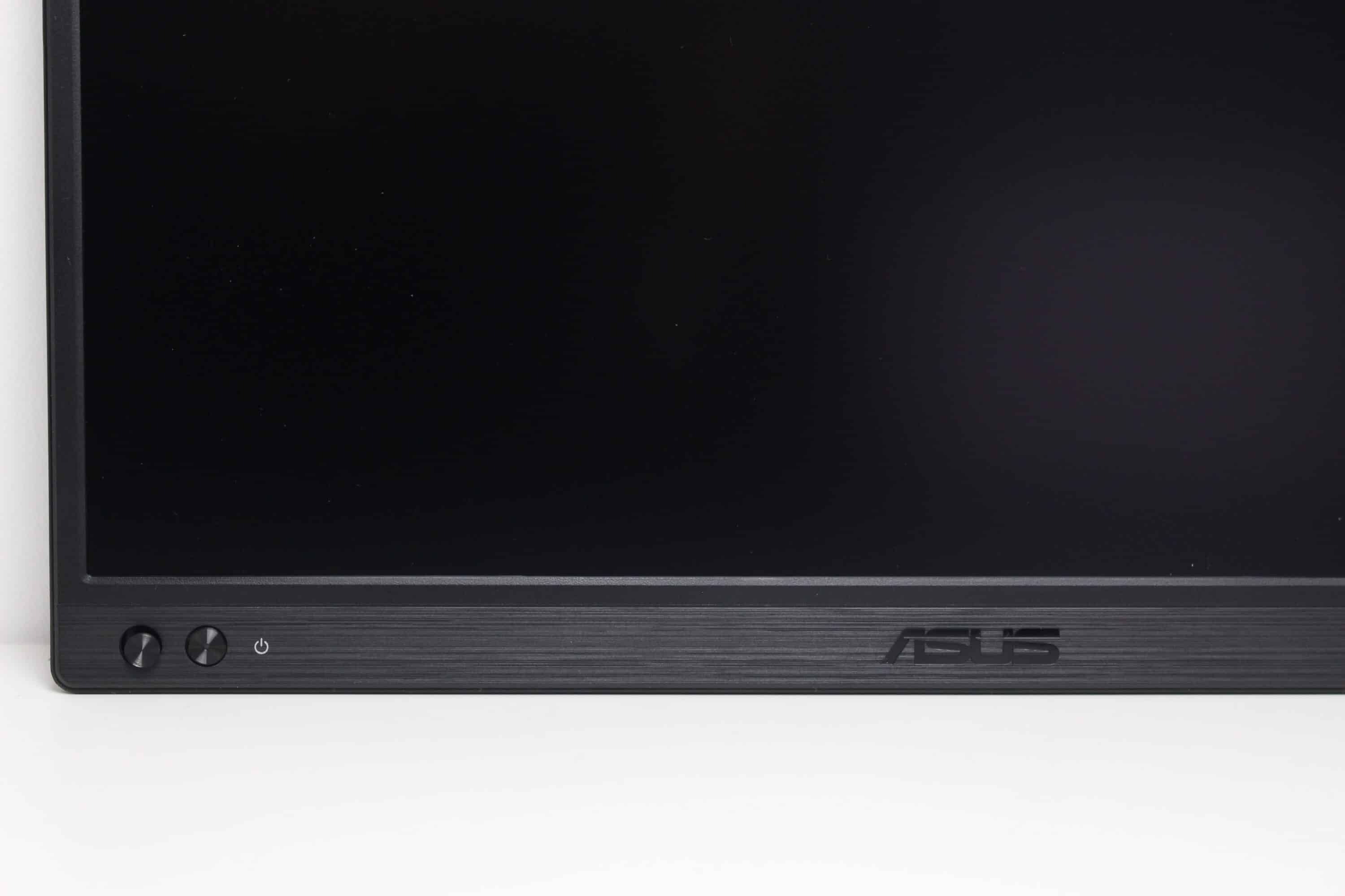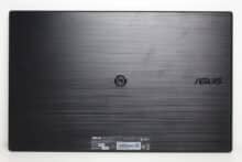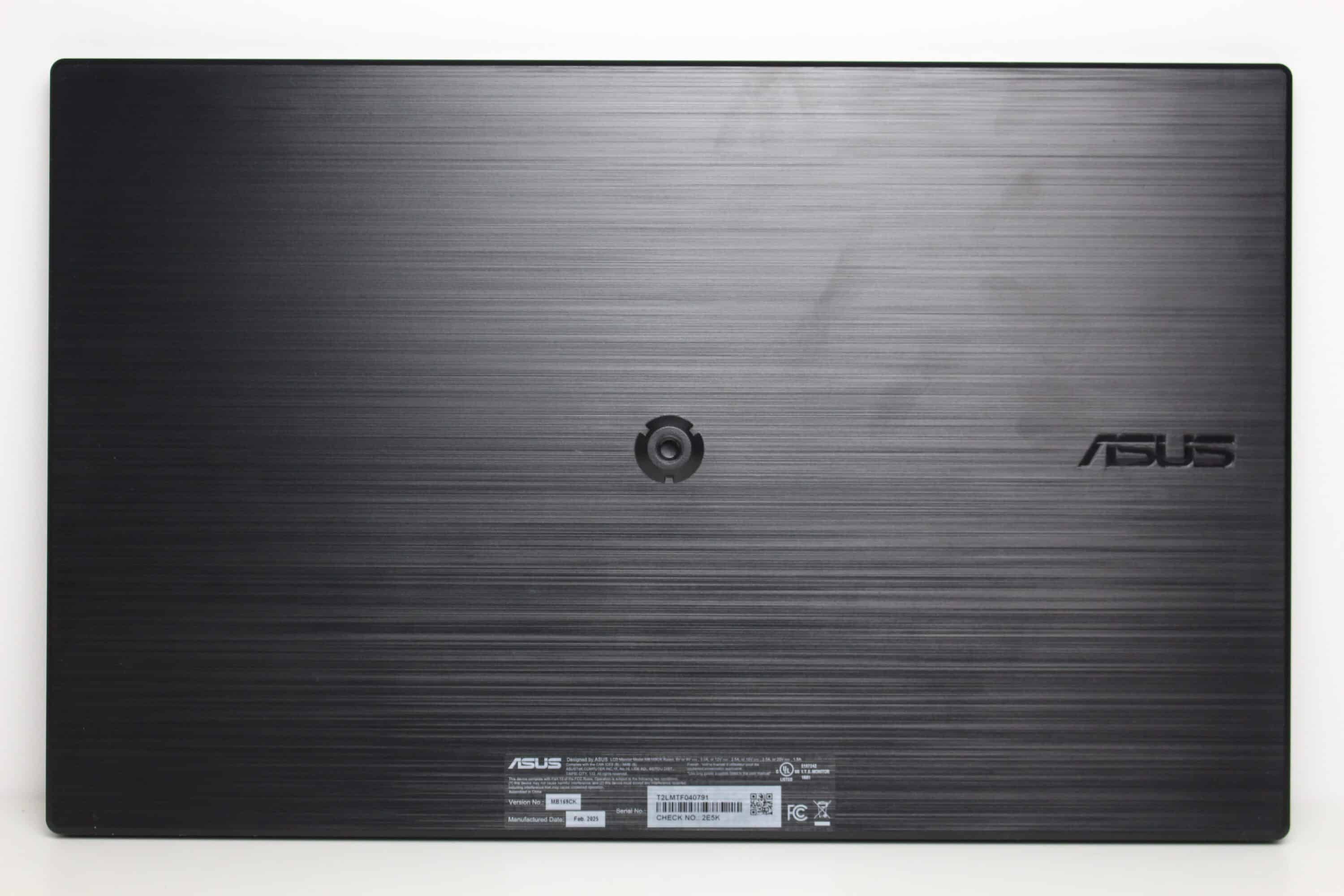 Der Rahmen des ASUS ZenScreen MB169CK besteht vollständig aus Kunststoff, ist an drei Seiten verhältnismäßig dünn und im unteren Bereich etwas dicker. Der dünne Rahmen ist leicht strukturiert und matt schwarz. Die untere Leiste, welche optisch an gebürstetes Aluminium erinnern soll, beherbergt nehmen dem Hersteller-Logo auch ein Bedienelement sowie einen blaue beleuchteten Power-Button. Die Rückseite des portablen Monitors erinnert ebenfalls an gebürstetes Aluminium, besteht aber ebenfalls aus Kunststoff. Neben einem Typenschild platziert ASUS auch hier nochmal das eigene Logo sowie eine Schrauböffnung für die Montage des Kickstands.