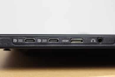 Sämtliche Anschlüsse hat ASUS beim ZenScreen MB169CK an der linken Seite platziert. Vorhanden sind zwei USB-C-Buchsen mit DP Alt Mode und DC-In sowie einmal mini HDMI. Grundsätzlich kann dieser Monitor also an jeden Laptop oder jedes Smartphone angeschlossen werden, welches über einen USB-C-Anschluss mit DisplayPort-Funktion verfügt. Entscheidend ist aber zusätzlich, wie viel Watt der USB-Anschluss liefern kann Weiterhin darf natürlich auch eine 3,5-mm-Klinkenbuchsen nicht fehlen, da der Monitor über eine eingebauten Lautsprecher verfügt. An der rechten Seite konnten wir zudem noch den Anschluss für ein Kensington-Lock finden.