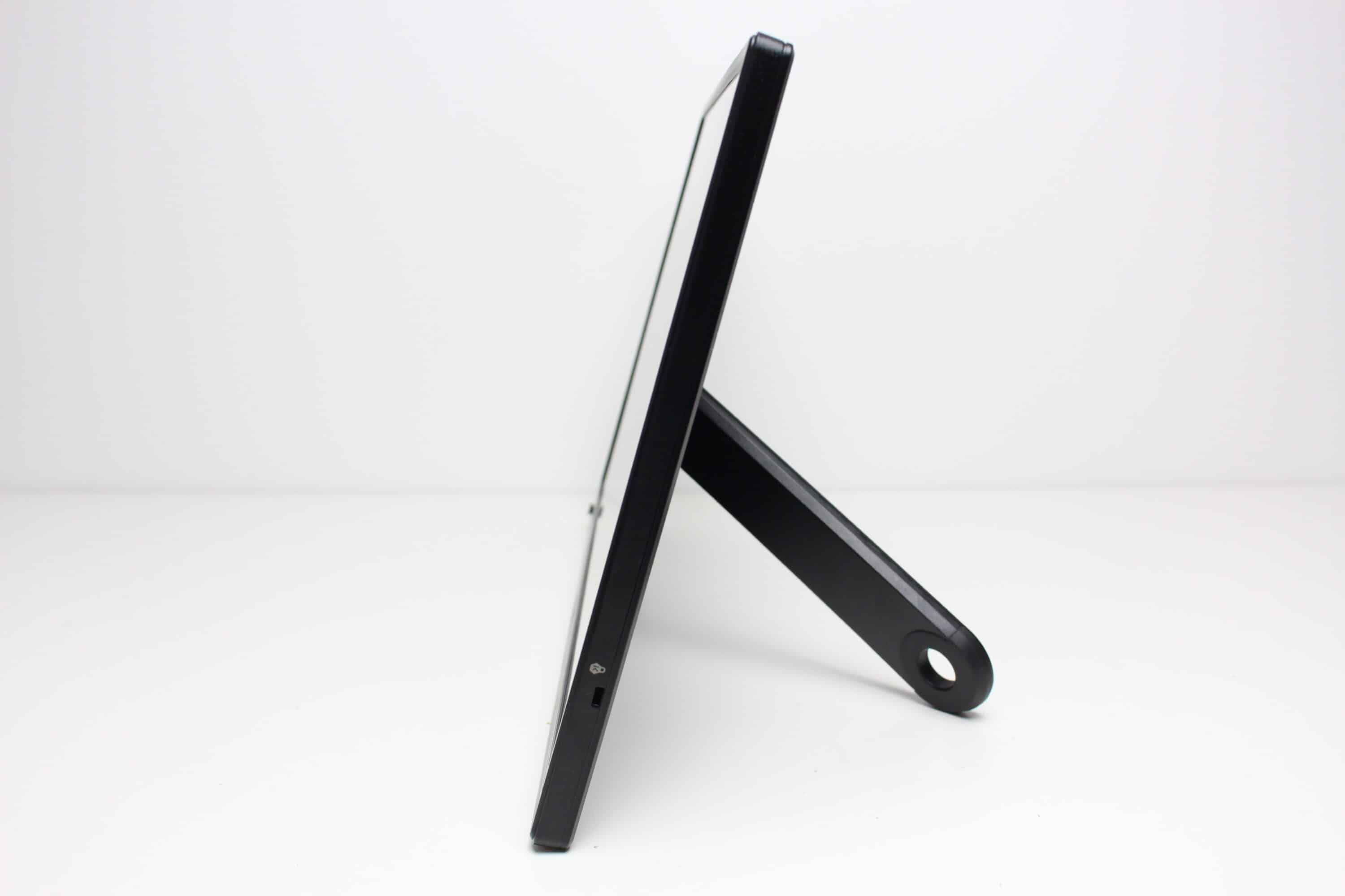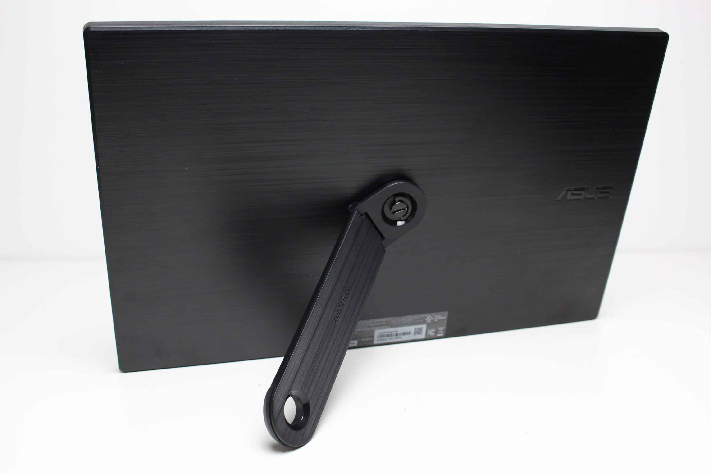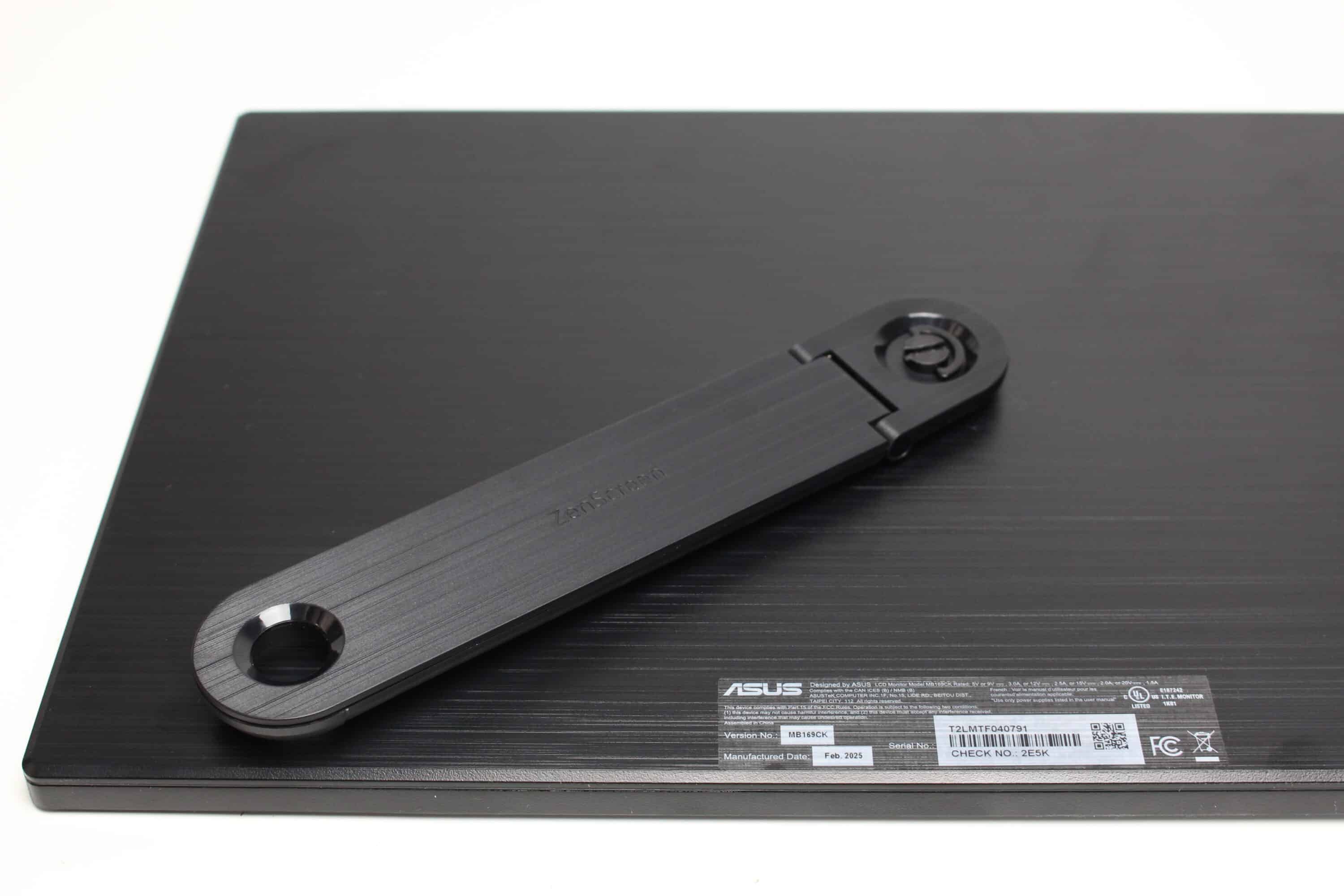 Der Kickstand ist ab Werk nicht angebracht und wurde gleichermaßen aus Kunststoff gefertigt. Zur Montage kommt er mit einer Schraube, die sich werkzeuglos am Display eindrehen lässt. Dadurch kann der Standfuß in einem beliebigen Winkel zwischen 1° und 360° am Display angebracht werden. Da Scharnier ist dabei relativ fest, wodurch der ASUS ZenScreen MB169CK in einem fast beliebigem Winkel aufgestellt werden kann. Durch das Loch im Kickstand könnte man den Monitor z.B. auch an eine Wand hängen.
