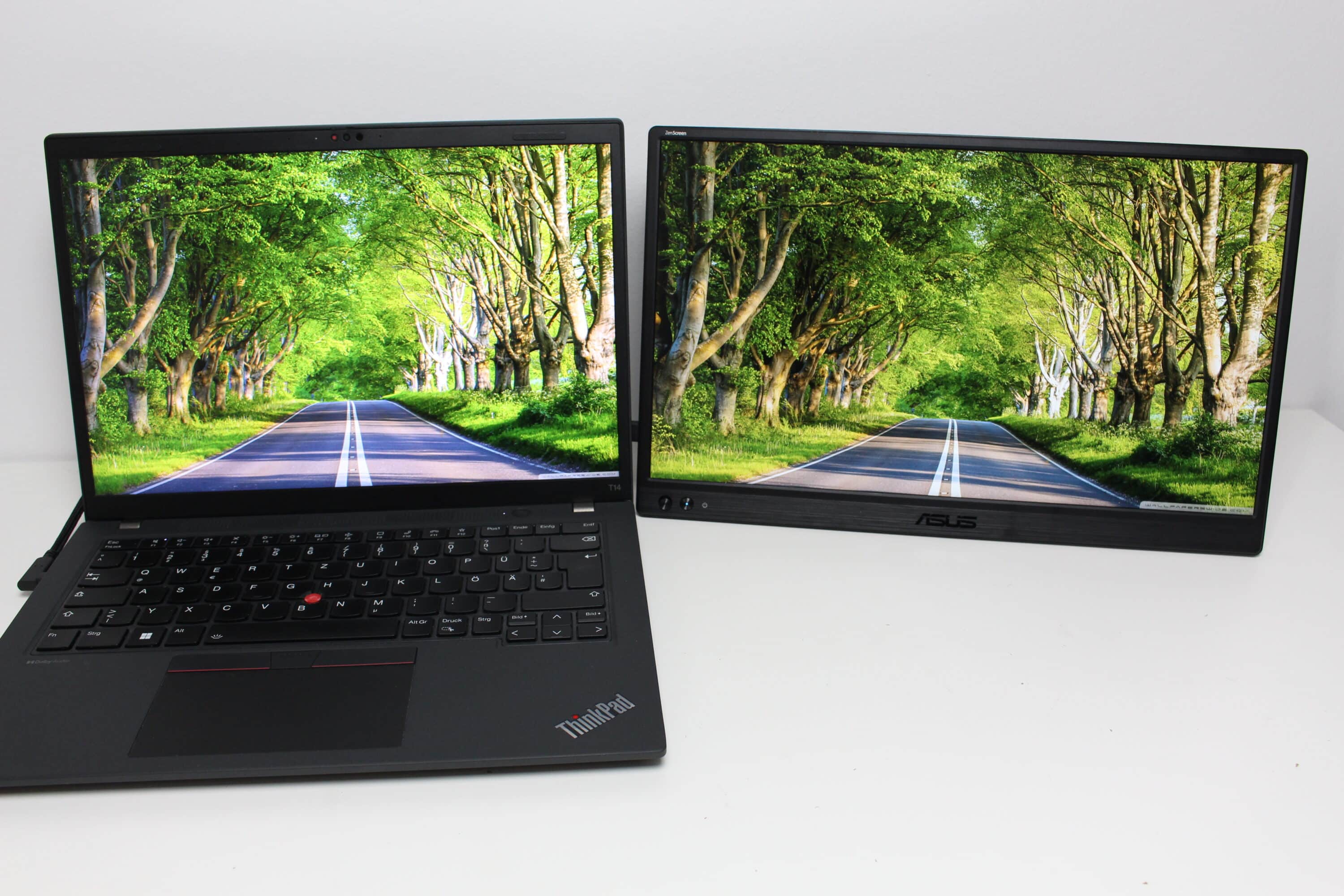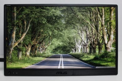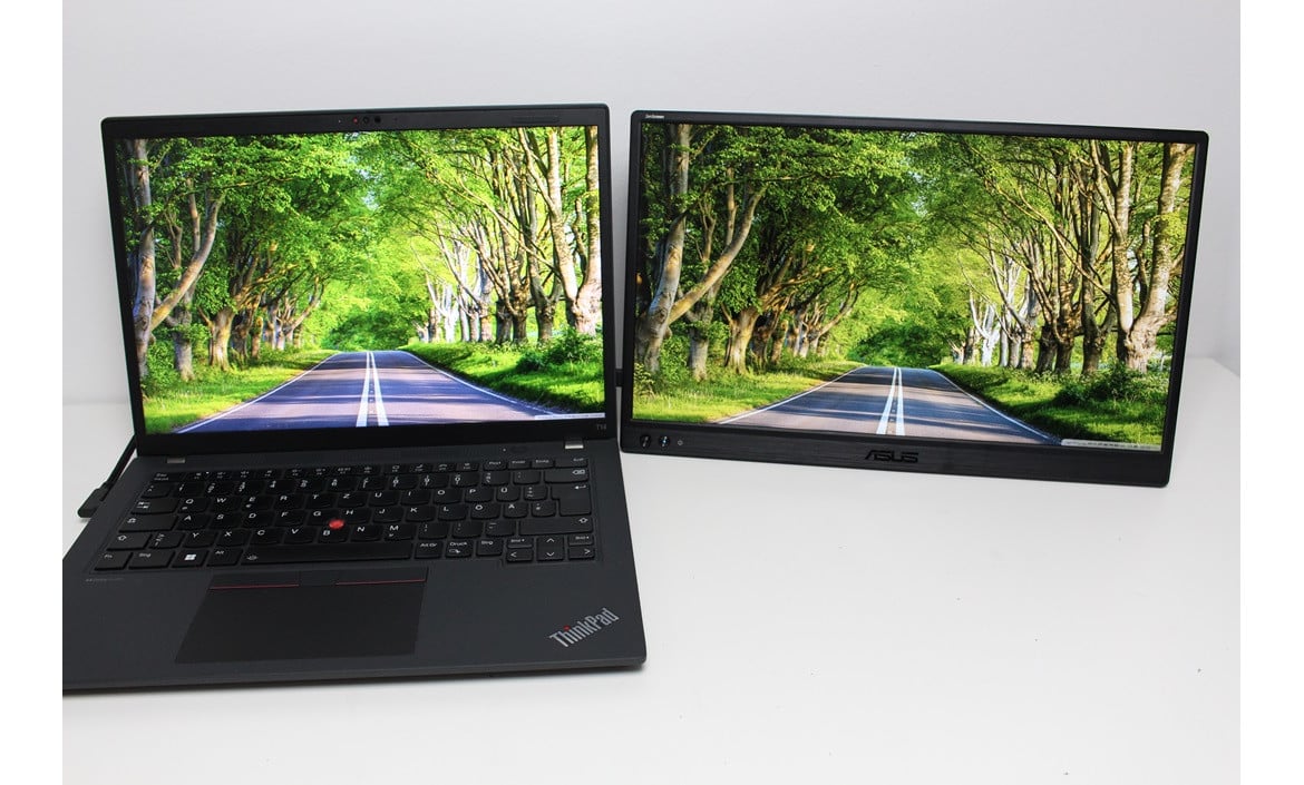In Bezug auf die Helligkeit liefert der ZenScreen MB169CK durchschnittliche Werte ab. Verglichen mit dem Display eines Lenovo ThinkPad T14 Gen 4 ist das Bild definitiv etwas dunkler. Arbeitet man also gerne im Freien bei stärkerer Sonneneinstrahlung, wird es aufgrund der geringeren, maximalen Helligkeit deutlich schwieriger etwas auf dem Monitor zu erkennen. Von Vorteil ist bei einem solchen Szenario aber die entspiegelte Oberfläche des Displays.
