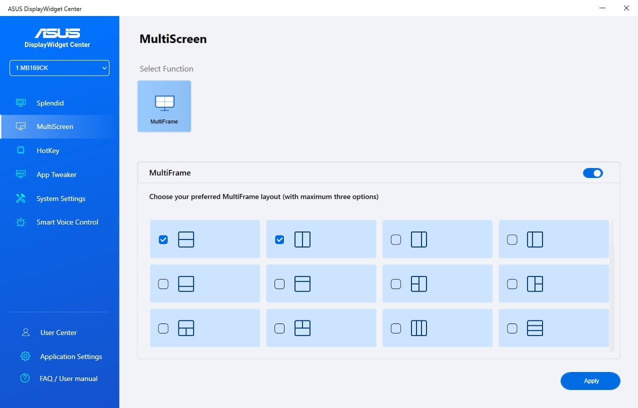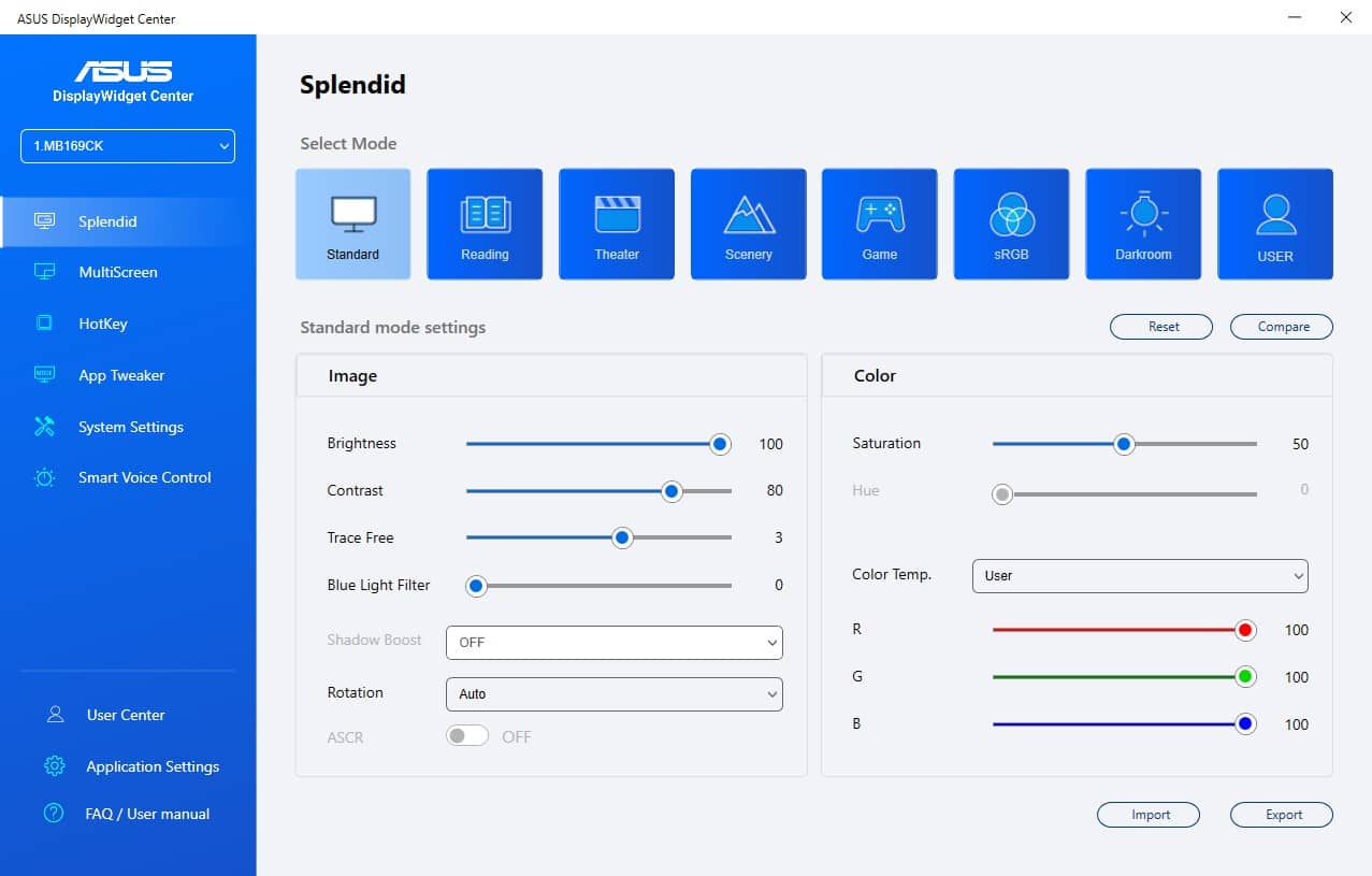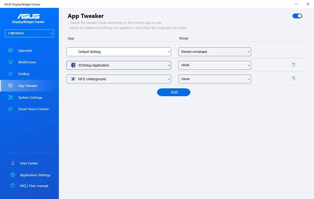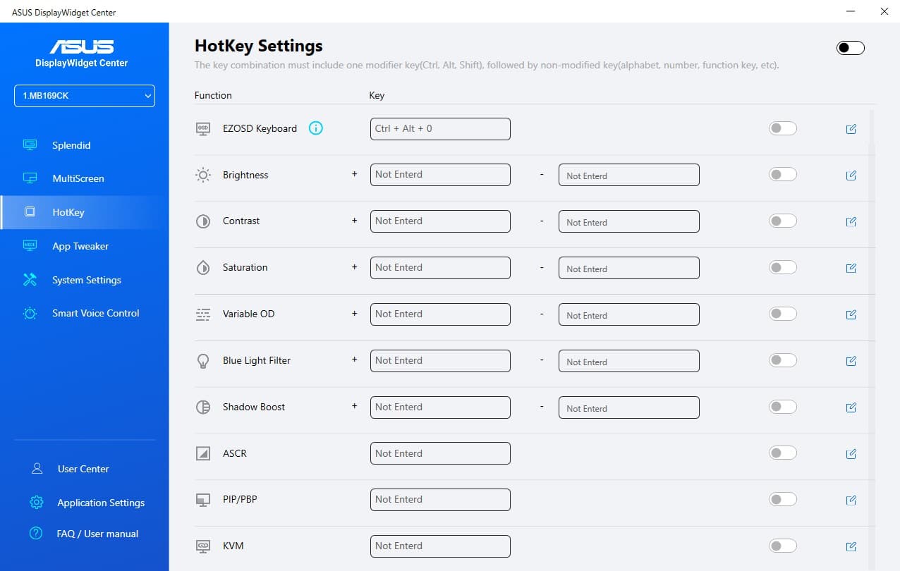 Wer noch mehr einstellen möchte, der muss auf die Software ASUS DisplayWidget Center auf dem angeschlossenen Gerät installieren. Angeboten wird das Tool für Systeme mit Windows und MacOS. Mit dem DisplayWidget Center ist es sogar möglich verschiedene Farbprofile an bestimmte Applikationen zu knüpfen, sodass der Monitor automatisch das Farbprofil wechselt, wenn eine Software gestartet wird. Außerdem kann man zahlreiche Hotkeys definieren um bestimmte Einstellungen direkt zu erreichen, ohne das Control Panel öffnen zu müssen.