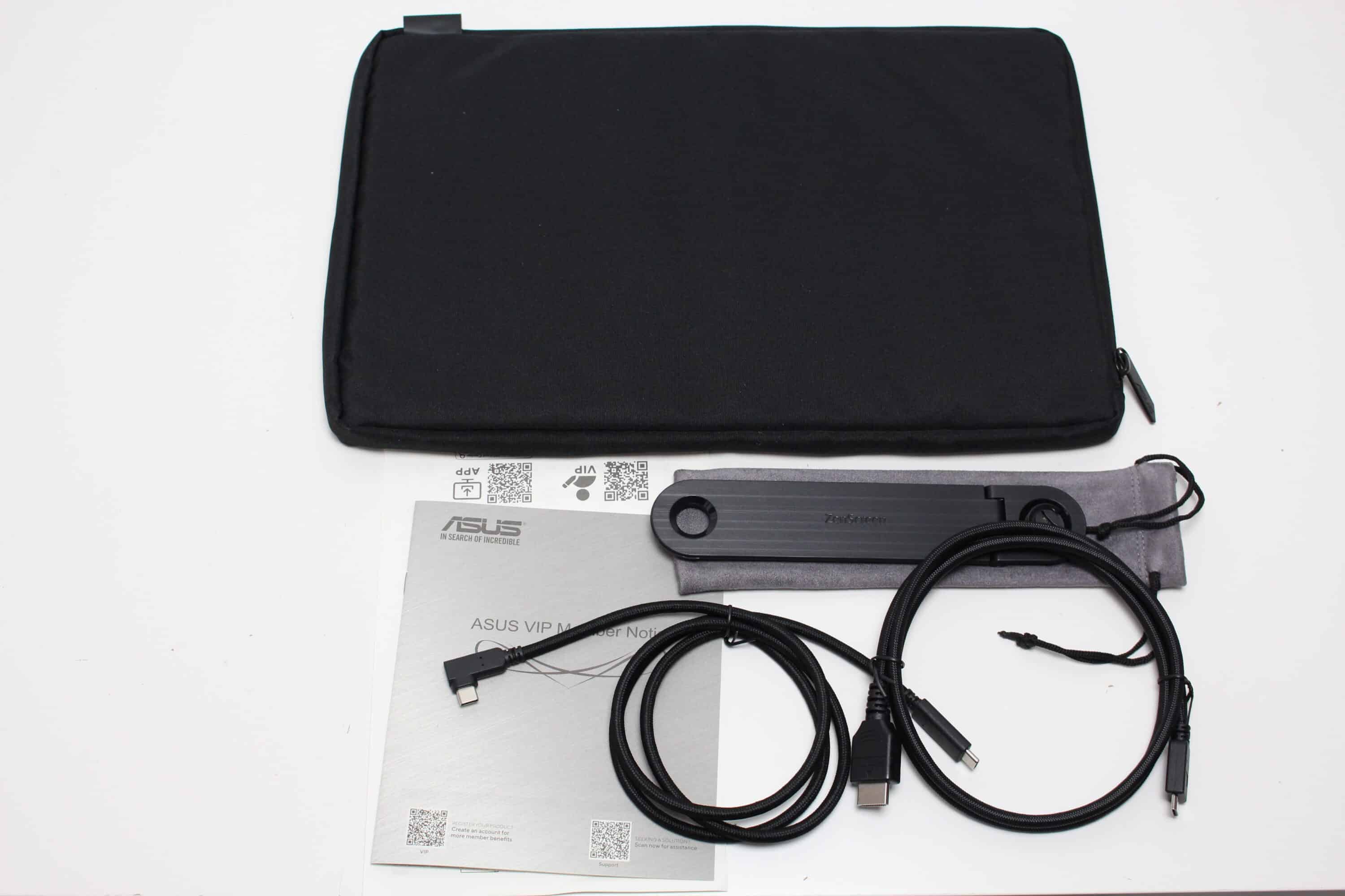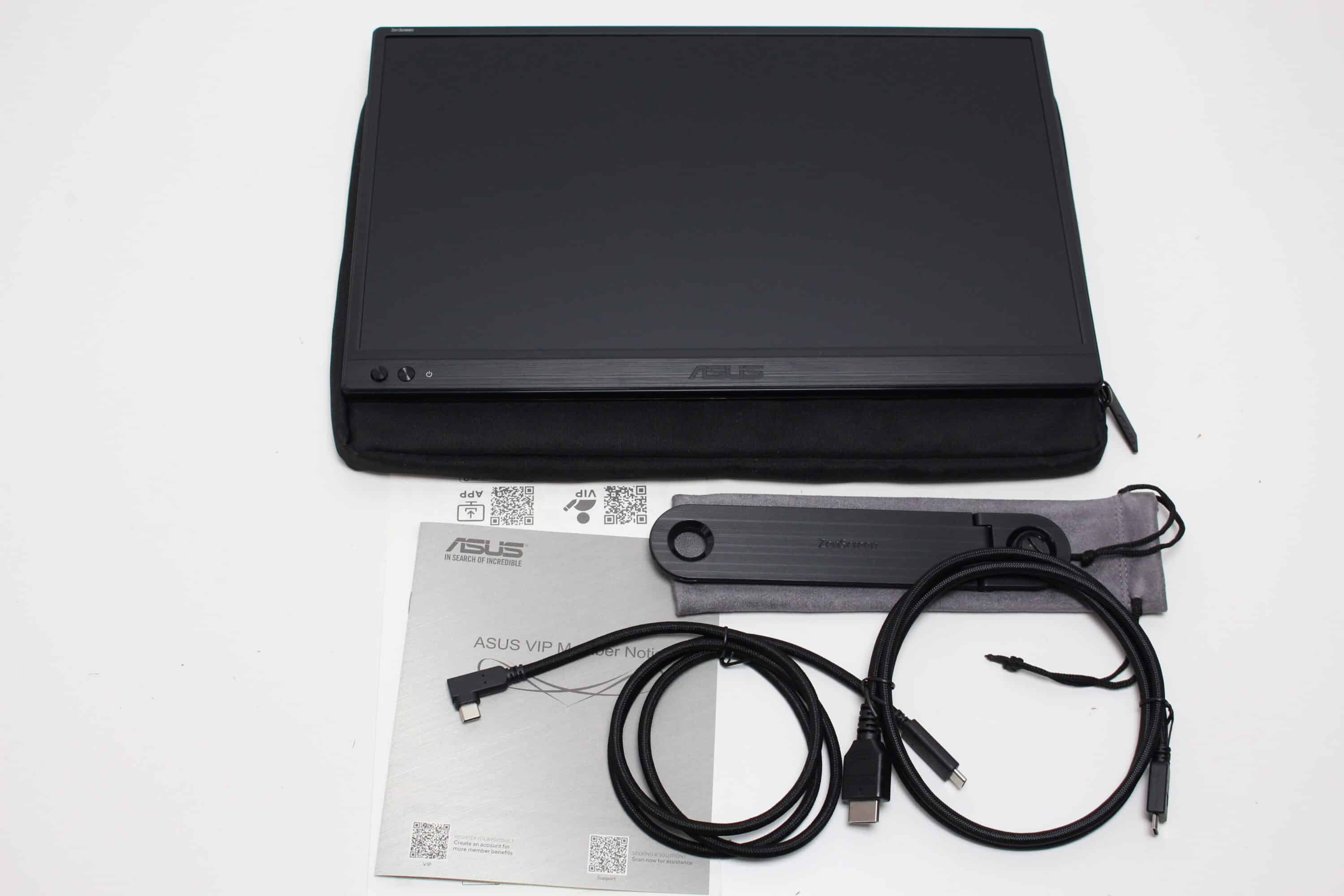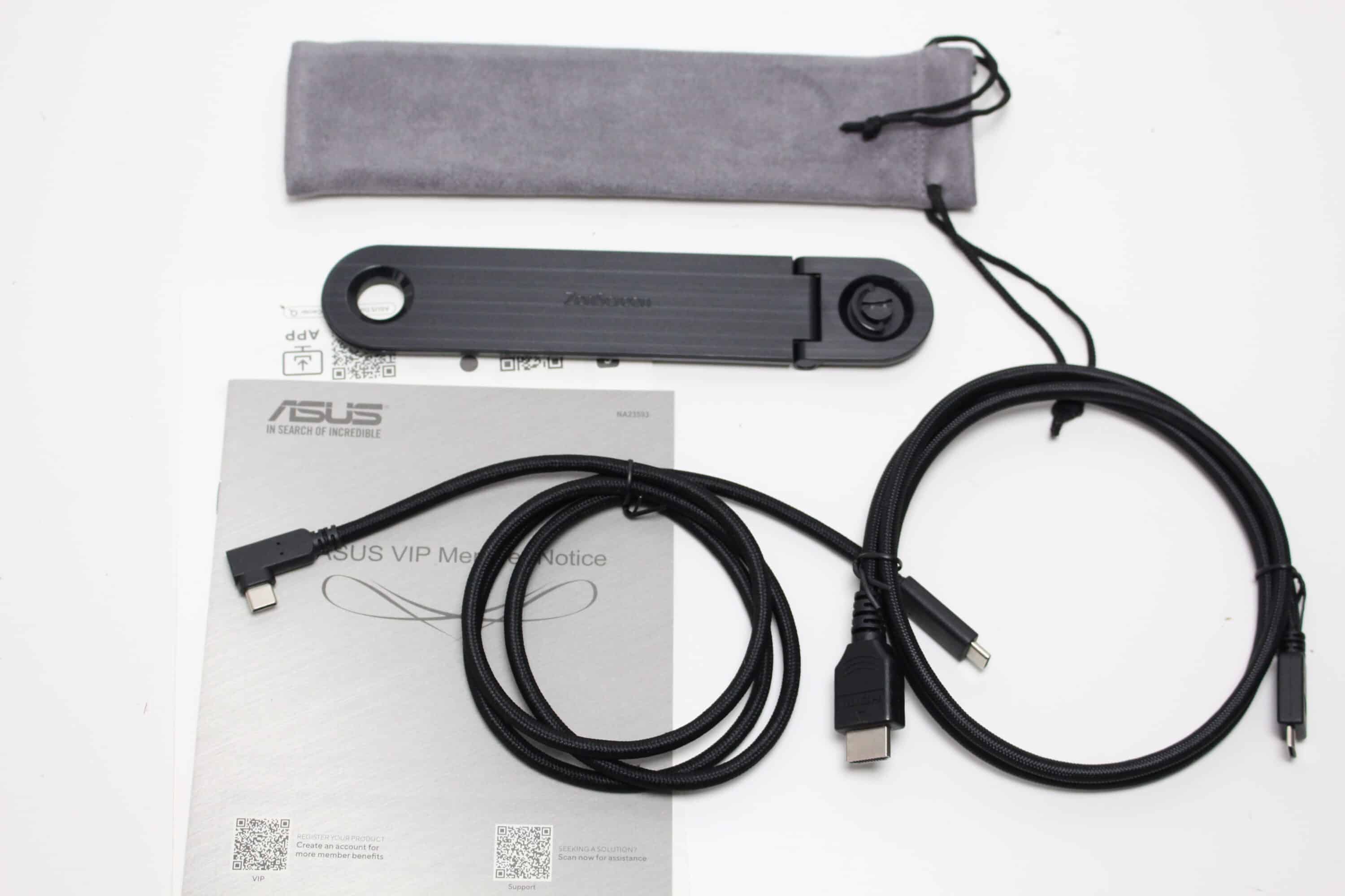 Öffnet man den Karton, dann wird man zunächst von einer praktischen Tasche begrüßt, die man für den Transport oder die Lagerung des Monitors nutzen kann. Darunter platziert ASUS den Monitor sowie den weiteren Lieferumfang zwischen zwei Matten aus recycelter Pappe. Zum Lieferumfang gehören neben dem Monitor, ein gesleevtes USB-C- auf USB-C-Kabel, ein Mini-HDMI auf HDMI-Kabel, einen schraubbaren Standfuß inklusive Transporttasche, eine Tasche für den Monitor, eine Kurzanleitung sowie Garantieinformationen.