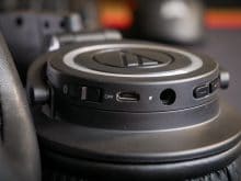 Alle Bedienelemente und Anschlüsse des Headsets befinden sich auf dem linken Ohrhörer. Hier ist ein großer Schiebeschalter zu finden, der das Headset und damit das Bluetooth ein- und ausschaltet. Dieser Schalter hat sich im Test als perfekt erwiesen, da eindeutig zu sehen oder fühlen war, ob das ATH-M50xBT an oder aus ist. Für die Lautstärke und die Play- / Pause-Funktion sind drei Druckknöpfe angebracht. Eine dezente LED zeigt zudem den Betriebsstatus an.