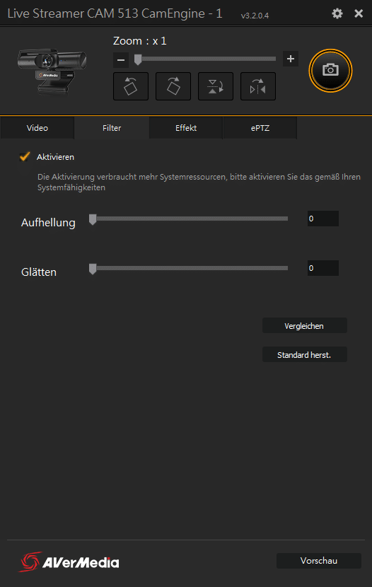 Ferner bietet CamEngine die Möglichkeit eines x1 bis x4 Zooms, der aber rein digital ist und daher zu Qualitätsverlusten führt. Fairerweise muss man aber sagen, dass auch bei höheren Zoomstufen das Bild noch einen wirklich guten Eindruck macht. Die Möglichkeit das Bild mit und gegen den Uhrzeigersinn zu drehen, als auch zu horizontal, wie vertikal zu spiegeln, komplettiert zudem den Funktionsumfang.