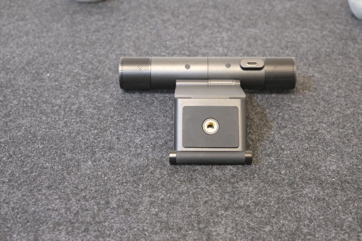 Die Halterung zur Befestigung der Cam ist an der Innen- und Unterseite zudem gummiert, um möglichen Kratzern oder Beschädigungen entgegenzuwirken. Zudem ist sie sehr weit ausklappbar, womit sie theoretisch sogar auf einem Pappkarton sicheren Halt findet. Auf der Rückseite befindet sich ein USB-C-Eingang, an dem die Dual-Webcam mit dem PC oder Notebook verbunden wird.