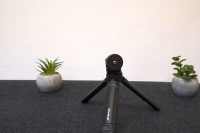 Das Stativ fühlt sich durchaus wertig an und verfügt an den drei Standfüßen über eine geriffelte Gummierung, damit eine sichere Positionierung auf dem Tisch oder anderen Oberflächen möglich ist. Der Kopf lässt sich abschrauben und mithilfe der seitlich angebrachten Schraube drehen oder schwenken. Dank der ausklappbaren Standfüße kommen wir auf eine maximale Höhe von von rund 23 Zentimetern.