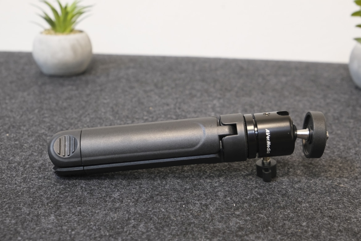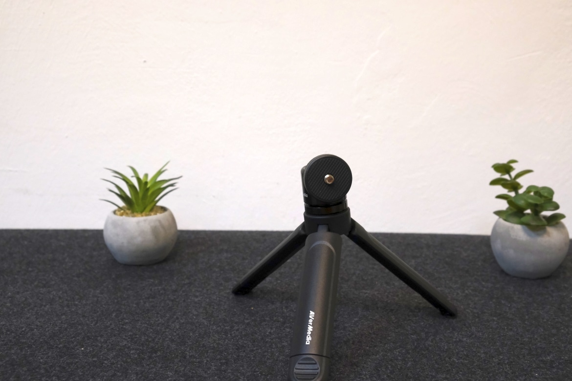 Die Avermedia PW313D Dual-Webcam kommt im herstellertypischen, rot-weißen Karton daher. Beim Öffnen teilt sich die Umverpackung in zwei weitere Kartons aus. Zum einen legt AverMedia der Webcam löblicherweise ein kleines Stativ bei. Es ist dreh- und schwenkbar und nimmt mit seinem 1/4-Zoll-Gewinde problemlos die Webcam, aber auch andere Kameras auf.