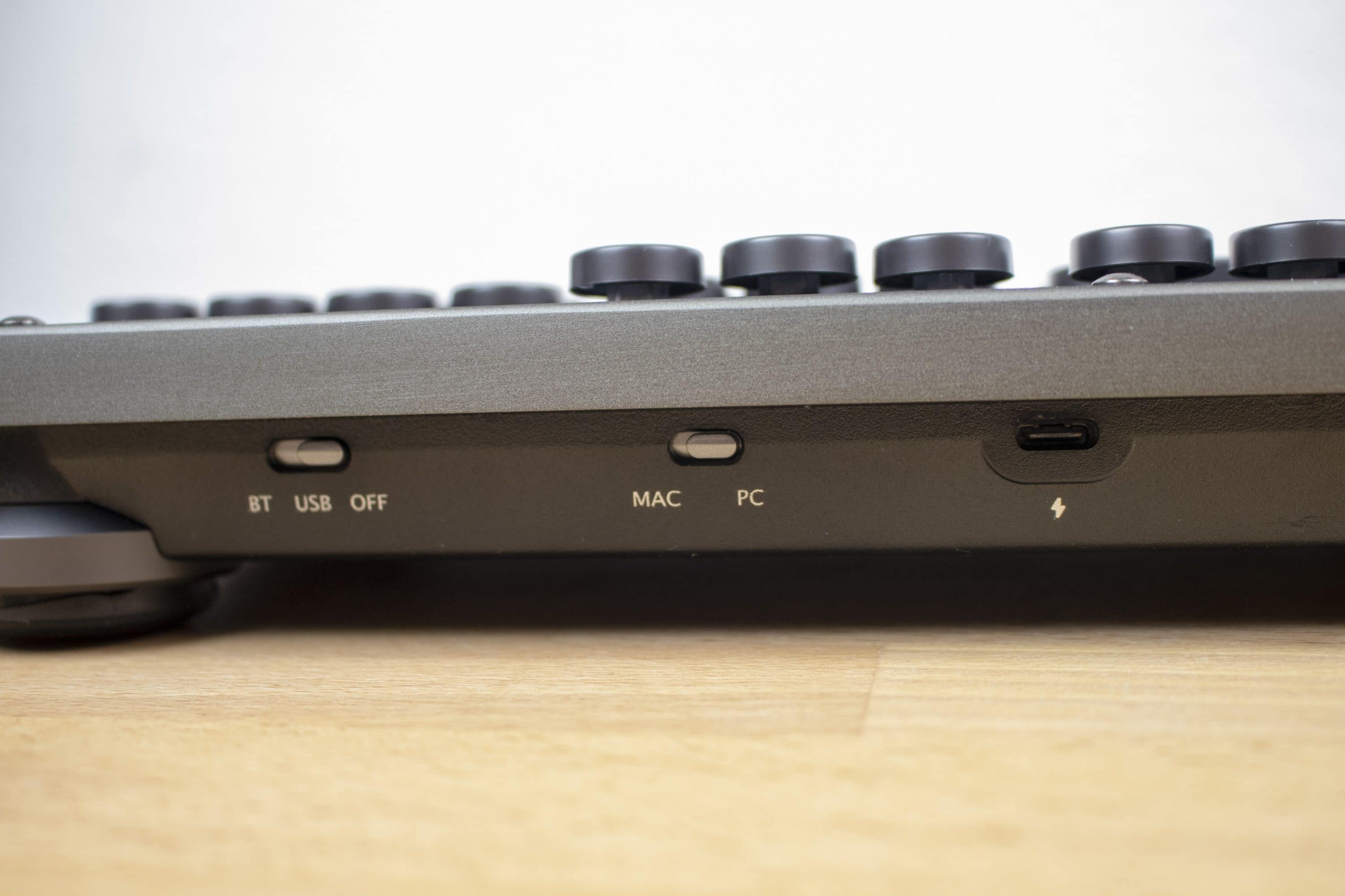 Bei der Retro Classic BT kann per Schalter zwischen USB und Bluetooth sowie zwischen PC und Mac gewechselt werden. Um dies zu ermöglichen ist ein 6.000 mAh großer Akku verbaut. Dieser reicht locker mehr als einen Monat – ohne Beleuchtung sogar noch länger. Dazu trägt auch das automatische Abschalten bei, das nach 5 Minuten ohne Aktivität geschieht. Durch das Drücken einer Taste wird die Tastatur dann wieder aktiviert.