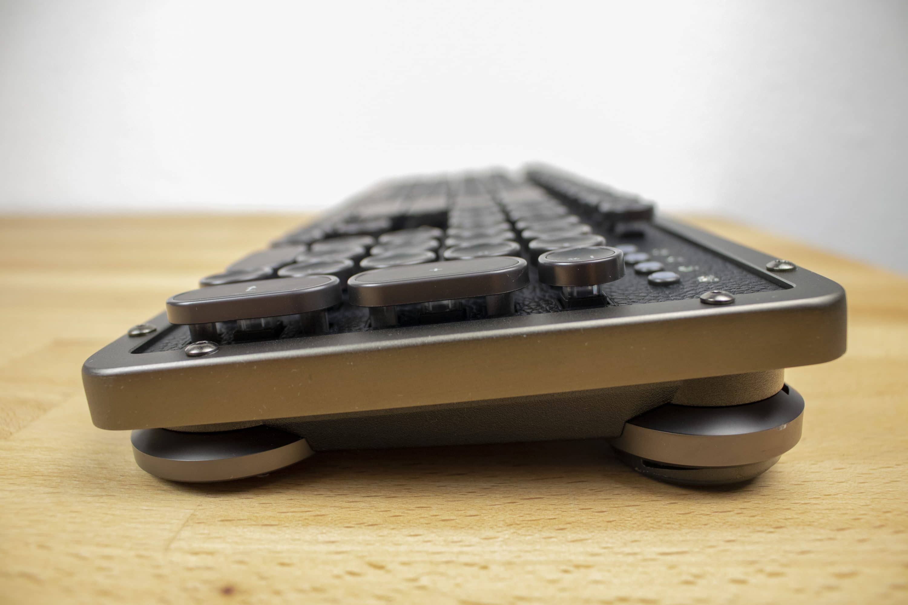 Auch die Verarbeitung erlaubt keine Kritik. Die verwendeten Materialien sind allesamt sehr hochwertig. Je nach Version kommen Walnussholz oder Leder zum Einsatz. Die Tastatur sieht nicht nur hochwertig aus, sondern fühlt sich auch so an. Wird die Tastatur umgedreht, muss der Nutzer jedoch feststellen, dass sie nicht ohne Plastik auskommt – der gesamte Boden ist aus Kunststoff gefertigt. Da dieser jedoch ebenfalls gut verarbeitet ist, können wir hieraus keine Kritik ableiten. Weiterhin finden sich unterseitig Gummistandfüße, die dem Gerät den nötigen Halt verleihen.