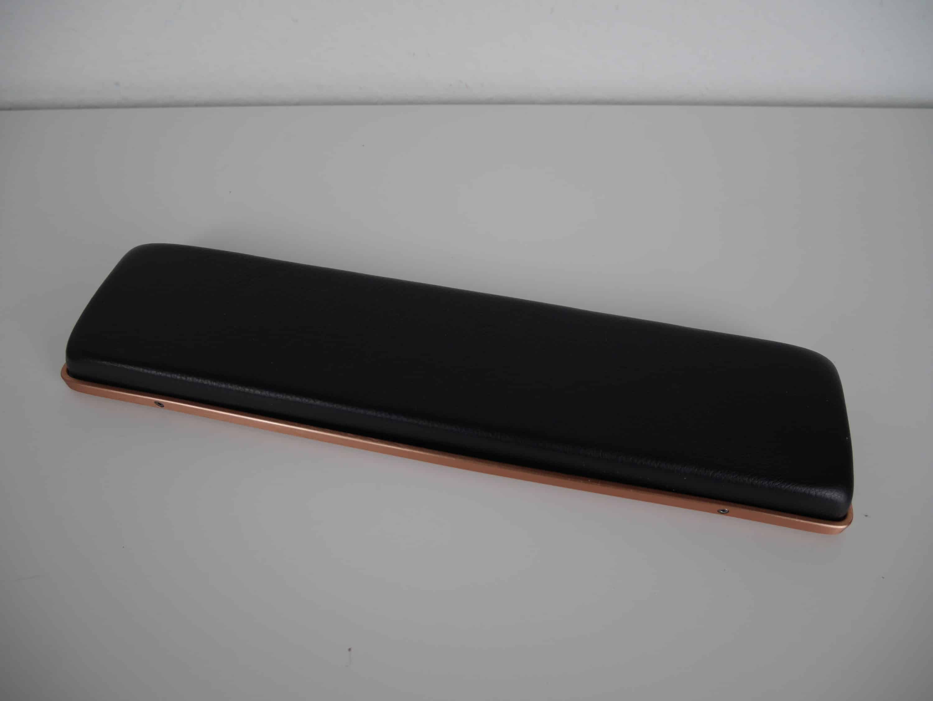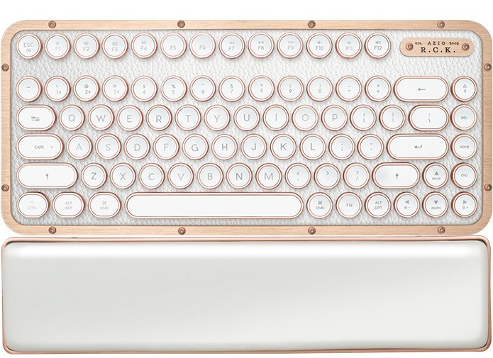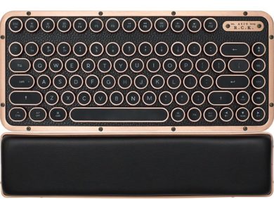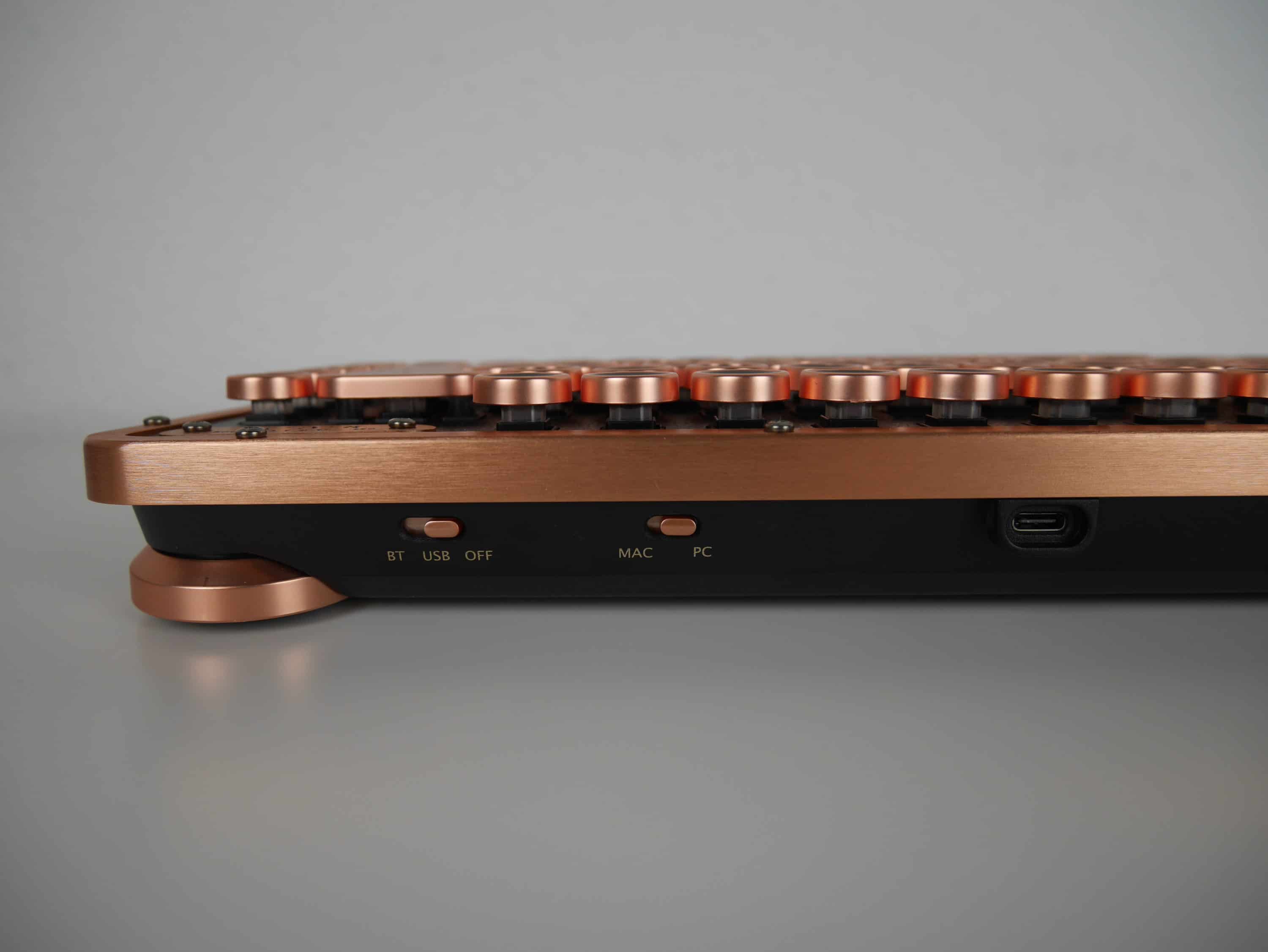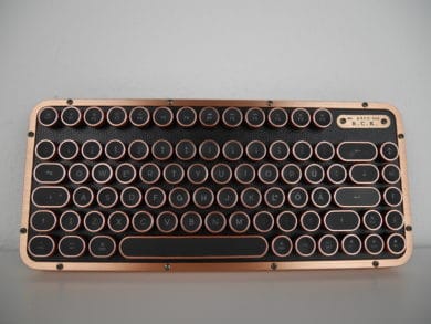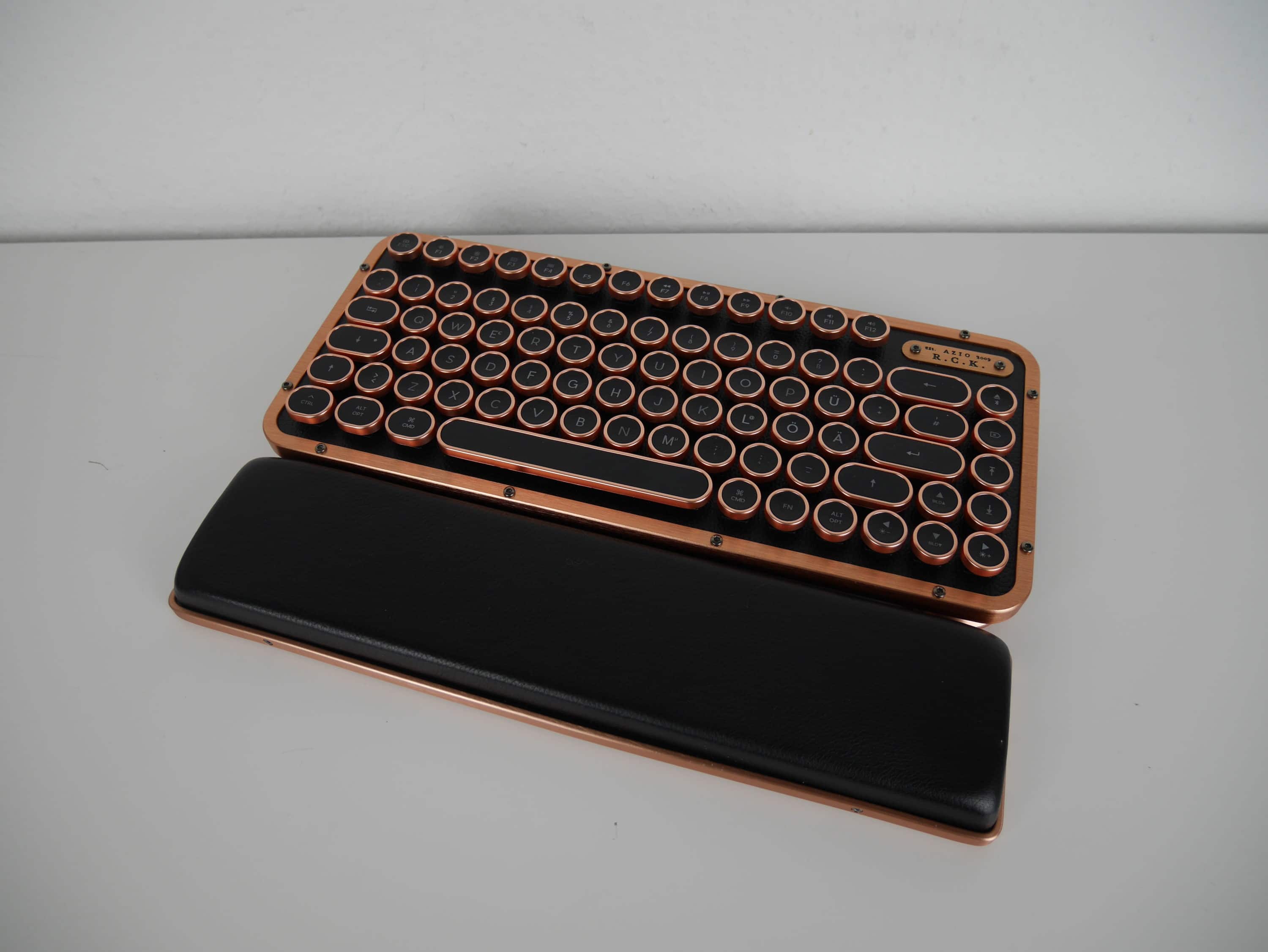 Wir haben von Azio die dunkle Ausführung mit schwarzer Lederoberfläche und einem Rahmen aus Kupfer. Die Handballenauflage besteht ebenfalls aus Metall und echtem Leder. Die runden Tasten erwecken ebenfalls einen Vintage-Eindruck, der an eine Schreibmaschine erinnert. Im Gegensatz zum Rahmen der Tastatur sind sie jedoch aus Plastik gefertigt.